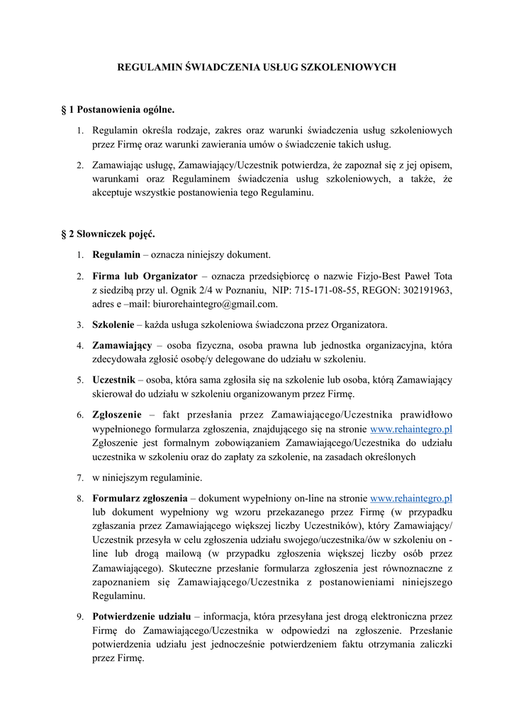 REGULAMIN ŚWIADCZENIA USŁUG SZKOLENIOWYCH § 1 Postanowienia ogólne. 1. Regulamin określa rodzaje, zakres oraz warunki świadczenia usług szkoleniowych przez Firmę oraz warunki zawierania umów o świadczenie takich usług. 2. Zamawiając usługę, Zamawiający/Uczestnik potwierdza, że zapoznał się z jej opisem, warunkami oraz Regulaminem świadczenia usług szkoleniowych, a także, że akceptuje wszystkie postanowienia tego Regulaminu. § 2 Słowniczek pojęć. 1. Regulamin – oznacza niniejszy dokument. 2. Firma lub Organizator – oznacza przedsiębiorcę o nazwie Fizjo-Best Paweł Tota z siedzibą przy ul. Ognik 2/4 w Poznaniu, NIP: 715-171-08-55, REGON: 302191963, adres e –mail: [email protected]. 3. Szkolenie – każda usługa szkoleniowa świadczona przez Organizatora. 4. Zamawiający – osoba fizyczna, osoba prawna lub jednostka organizacyjna, która zdecydowała zgłosić osobę/y delegowane do udziału w szkoleniu. 5. Uczestnik – osoba, która sama zgłosiła się na szkolenie lub osoba, którą Zamawiający skierował do udziału w szkoleniu organizowanym przez Firmę. 6. Zgłoszenie – fakt przesłania przez Zamawiającego/Uczestnika prawidłowo wypełnionego formularza zgłoszenia, znajdującego się na stronie www.rehaintegro.pl Zgłoszenie jest formalnym zobowiązaniem Zamawiającego/Uczestnika do udziału uczestnika w szkoleniu oraz do zapłaty za szkolenie, na zasadach określonych 7. w niniejszym regulaminie. 8. Formularz zgłoszenia – dokument wypełniony on-line na stronie www.rehaintegro.pl lub dokument wypełniony wg wzoru przekazanego przez Firmę (w przypadku zgłaszania przez Zamawiającego większej liczby Uczestników), który Zamawiający/ Uczestnik przesyła w celu zgłoszenia udziału swojego/uczestnika/ów w szkoleniu on line lub drogą mailową (w przypadku zgłoszenia większej liczby osób przez Zamawiającego). Skuteczne przesłanie formularza zgłoszenia jest równoznaczne z zapoznaniem się Zamawiającego/Uczestnika z postanowieniami niniejszego Regulaminu. 9. Potwierdzenie udziału – informacja, która przesyłana jest drogą elektroniczna przez Firmę do Zamawiającego/Uczestnika w odpowiedzi na zgłoszenie. Przesłanie potwierdzenia udziału jest jednocześnie potwierdzeniem faktu otrzymania zaliczki przez Firmę. 10. Umowa o świadczenie usług – zespół oświadczeń woli, składanych przez Firmę 11. i Zamawiającego/Uczestnika, w formie wskazanej w niniejszym Regulaminie, wyczerpujący istotne postanowienia tego rodzaju czynności prawnej. Za chwilę zawarcia umowy uznaje się przesłanie Zamawiającemu/Uczestnikowi potwierdzenia udziału w szkoleniu. 12. W przypadku, jeżeli Uczestnik jest konsumentem, wraz z potwierdzeniem udziału w szkoleniu otrzyma informacje sporządzone zgodnie z ustawą z dnia 30 maja 2014 roku o prawach konsumenta (Dz.U. 2014.827 z dnia 2014.06.24) w formie elektronicznej (pliku PDF) wraz ze wzorem oświadczenia o odstąpieniu od umowy, na co Uczestnik wyraża zgodę, wysyłając formularz zgłoszeniowy. Informacja i formularz będą również dostępne na stronie www.rehaintegro.pl. § 3 Zobowiązania Stron Umowy 1. Firma zobowiązuje się przeprowadzić na rzecz Zamawiającego/Uczestnika szkolenie w zakresie określonym w opisie szkolenia oraz na zasadach określonych 2. w niniejszym Regulaminie. 3. Firma zapewnia, że dołoży wszelkich starań, aby zagwarantować jakość każdego szkolenia zgodnie z opisem danego szkolenia, zamieszczonym na stronie www.rehaintegro.pl 4. Zamawiający/Uczestnik zobowiązany jest przed wypełnieniem formularza zgłoszenia zapoznać się z niniejszym Regulaminem. 5. Zamawiający/Uczestnik winien przestrzegać postanowień niniejszego Regulaminu. § 4 Warunki zgłoszenia/Warunki udziału w szkoleniu. 1. Zgłoszenie na kurs odbywa się przy pomocy wypełnionego i przesłanego formularza zgłoszenia on-line na stronie www.rehaintegro.pl Zamawiający zgłaszający większą ilość Uczestników, może skorzystać z formularza zgłoszenia, przesłanego mu w tym celu drogą mailową przez Organizatora. 2. W formularzu zgłoszenia Zamawiający/Uczestnik zobowiązany będzie podać poniższe dane: · Imię i nazwisko, · Adres e- mail, · nr telefonu, a w przypadku gdy Zamawiający/Uczestnik będzie przedsiębiorcą, dodatkowo: o firma (nazwa) przedsiębiorcy o siedziba o numer NIP 3. W odpowiedzi na prawidłowo wypełniony i przesłany formularz zgłoszenia Zamawiający/Uczestnik otrzyma informację o sposobie płatności zaliczki, 4. w wysokości 30% całkowitego kosztu szkolenia, chyba że taka informacja będzie zawarta już na stronie www.rehaintegro.pl przy opisie danego szkolenia. 5. Zamawiający/Uczestnik zobowiązany jest do wpłaty zaliczki, o której mowa w ust. 3 6. w terminie 7 dni od dnia poinformowania go przez Organizatora o sposobie płatności zaliczki, chyba że taka informacja będzie zawarta już na stronie www.rehaintegro.pl przy opisie danego szkolenia, wówczas zaliczka płatna jest w terminie 5 dni od dnia wysłania formularza zgłoszenia. Za uiszczenie zaliczki w terminie uznaje się dzień uznania środków na rachunku bankowym Organizatora. 7. Brak wpłaty zaliczki w terminie spowoduje automatyczne usunięcie zgłoszenia Zamawiającego/Uczestnika. 8. W przypadku szkoleń, na których liczba miejsc jest ograniczona, decydować będzie kolejność wpłaty zaliczek. 9. Na podstawie otrzymanego i prawidłowo wypełnionego formularza zgłoszenia i po wpłaceniu zaliczki, Zamawiającemu/Uczestnikowi wysłane zostanie potwierdzenie udziału w szkoleniu, nie później niż 3 dni robocze po otrzymaniu formularza zamówienia i po wpłacie zaliczki. 10. Zamówienia można składać 24 godziny na dobę, 7 dni w tygodniu przez cały rok. § 5 Warunki płatności 1. W zamian za przeprowadzenie Szkolenia (lub gotowość jego przeprowadzenia), Organizatorowi przysługuje wynagrodzenie określone w opisie szkolenia, zwane dalej „ceną za szkolenie” lub 