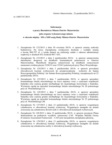 Ostrów Mazowiecka, 22 października 2015 r. A-1.0057.07.2015 Informacja o pracy Burmistrza Miasta Ostrów Mazowiecka jako organu wykonawczego miasta w okresie między XII a XIII sesją Rady Miasta Ostrów Mazowiecka 1. Zarządzenie Nr 122/2015 z dnia 30 września 2015r. w sprawie zmiany uchwały budżetowej. Na mocy Zarządzenia zwiększono dochody i wydatki miasta o kwotę 960.797 zł. z tytułu dotacji na realizację zadań z zakresu administracji rządowej w działach 852 rozdział 801 i 852. 2. Zarządzenie Nr 123/2015 z dnia 2 października 2015r. w sprawie ustanowienia służebności drogowej na działkach komunalnych położonych w Ostrowi Mazowieckiej. Służebność drogową ustanowiono na działkach oznaczonych numerami ewidencyjnymi 3320/12 oraz 3324/2 położonych przy Placu Waryńskiego. 3. Zarządzenie Nr 124/2015 z dnia 5 października 2015r. w sprawie powołania obwodowych komisji wyborczych do przeprowadzenia wyborów do Sejmu Rzeczypospolitej Polskiej i do Senatu Rzeczypospolitej Polskiej, zarządzonych na 25 października 2015r. 4. Zarządzenie Nr 125/2015 z dnia 7 października 2015r. w sprawie sprzedaży komunalnego lokalu mieszkalnego na rzecz najemcy wraz z częściami wspólnymi budynku oraz częścią gruntu niezbędnego do racjonalnego korzystania z budynku. Wyrażono zgodę na sprzedaż komunalnego lokalu mieszkalnego Nr 20 położonego przy ul. Warchalskiego 2A. 5. Zarządzenie Nr 126/2015 z dnia 7 października 2015r. w sprawie sprzedaży komunalnego lokalu mieszkalnego na rzecz najemcy wraz z częściami wspólnymi budynku oraz częścią gruntu niezbędnego do racjonalnego korzystania z budynku. Wyrażono zgodę na sprzedaż komunalnego lokalu mieszkalnego Nr 25 położonego przy ul. Warchalskiego 2B. 6. Zarządzenie Nr 127/2015 z dnia 12 października 2015r. w sprawie wygaśnięcia członkostwa w obwodowej komisji wyborczej. Wygaśnięcie nastąpiło na skutek zrzeczenia się członkostwa dwóch osób w obwodowych komisjach wyborczych. 7. Zarządzenie Nr 128/2015 z dnia 12 października 2015r. w sprawie przyjęcia Planu doskonalenia na podstawie wyników samooceny CAF. Wspólna Metoda Oceny (Common Assessment Framework – CAF) jest narzędziem zarządzania jakością. 8. Zarządzenie Nr 129/2015 z dnia 13 października 2015r. w sprawie wygaśnięcia członkostwa w obwodowej komisji wyborczej. Wygaśnięcie nastąpiło na skutek zrzeczenia się członkostwa osoby w obwodowej komisji wyborczej. Strona 1 z 4 9. Zarządzenie Nr 130/2015 z dnia 13 października 2015r. w sprawie zmiany uchwały budżetowej. Na mocy Zarządzenia zwiększono dochody i wydatki budżetu miasta o kwotę 215,816 zł. Zmiany obejmują środki z dotacji na realizację zadań zleconych oraz przesunięcia w planie wydatków do wysokości przewidywanego wykonania w działach 700, 750, 758, 801, 852, 854 i 900. 10. Zarządzenie Nr 131/2015 z dnia 14 października 2015r. w sprawie rozłożenia na raty należności głównej dotyczącej czynszu za lokal mieszkalny Ostrowi Mazowieckiej oraz w sprawie umorzenia odsetek naliczonych od uregulowanych należności dotyczących czynszu za lokal mieszkalny w Ostrowi Mazowieckiej oraz w sprawie odmowy umorzenia odsetek od zadłużenia dotyczącego czynszu za lokal mieszkalny w Ostrowi Mazowieckiej położony przy ul. Batorego 15/15. Należność główna w wysokość 2.807,52 zł., odsetki od uregulowanych należności w wysokości 58,22zł., odsetki od zadłużenia w wysokości 112,15 zł. 11. Zarządzenie Nr 132/2015 z dnia 19 października 2015r. w sprawie zmiany Zarządzenia Nr 124/2015 Burmistrza Miasta Ostrów Mazowiecka z dnia 5 października 2015r. w sprawie powołania obwodowych komisji wyborczych do przeprowadzenia wyborów do Sejmu Rzeczypospolitej Polskiej i do Senatu Rzeczypospolitej Polskiej, zarządzonych na 25 października 2015r. Na mocy Zarządzenia sprostowano omyłkę pisarską w imieniu członka obwodowej Komisji Wyborczej Nr 6. W okresie między XII a XIII sesją Rady Miasta Ostrów Mazowiecka Burmistrz Miasta odbył 4 narady z kierownictwem Urzędu Miasta, podczas których między innymi: 1. Omówiono sprawę dotyczącą aktualizacji Strategii Rozwoju Miasta Ostrów Mazowiecka do 2030 roku. W celu zdiagnozowania potrzeb miasta przedstawiono ankietę dotyczącą: - silnych i słabych stron miasta Ostrów Mazowiecka, - głównych problemów dalszego rozwoju miasta Ostrów Mazowiecka, - programów strategicznych i zadań realizacyjnych, - priorytetowych zadań realizacyjnych miasta Ostrów Mazowiecka. Postanowiono o rozpropagowaniu ankiety wśród mieszkańców miasta, przedsiębiorców, przedstawicieli instytucji, organizacji pozarządowych i innych zainteresowanych. 2. Negatywnie ustosunkowano się do oferty Grupy Kapitałowej ESV w sprawie możliwości podjęcia współpracy w zakresie wytwarzania i dystrybucji ciepła na terenie miasta Ostrów Mazowiecka, polegającej na odkupieniu infrastruktury ciepłowni wraz z infrastrukturą dystrybucji. 3. Omówiono kwestie związane z przygotowaniem projektów uchwał , wniesionych do porządku obrad XIII sesji Rady Miasta. 4. Zapoznano się z 2 wnioskami dotyczącymi wykupu mieszkań komunalnych na rzecz najemców. Strona 2 z 4 5. Przychylono się do wniosku OTIKO Sceny Kotłownia w sprawie umieszczenia tabliczek kierunkowych z logo Sceny na wybranych słupkach na terenie miasta. 6. Postanowiono przyznać pomoc finansową w wys. 4 tys. zł. dla mieszkańców miasta poszkodowanych w wyniku pożaru mieszkania. 7. Postanowiono zorganizować szerokie spotkanie konsultacyjne mające na celu wypracowanie rozwiązań w zakresie poprawy opieki stomatologicznej skierowanej do dzieci z terenu miasta. Termin spotkania to 29.10.2015r. 8. Omawiano wniosek Komisji Rady Miasta ds. Oświaty Kultury, Kultury Fizycznej, Zdrowia, Spraw Socjalnych oraz Porządku Publicznego w sprawie powołania Komisji, która opracuje regulamin przyznawania środków budżetowych klubom sportowym. Uznano, że kwestie te