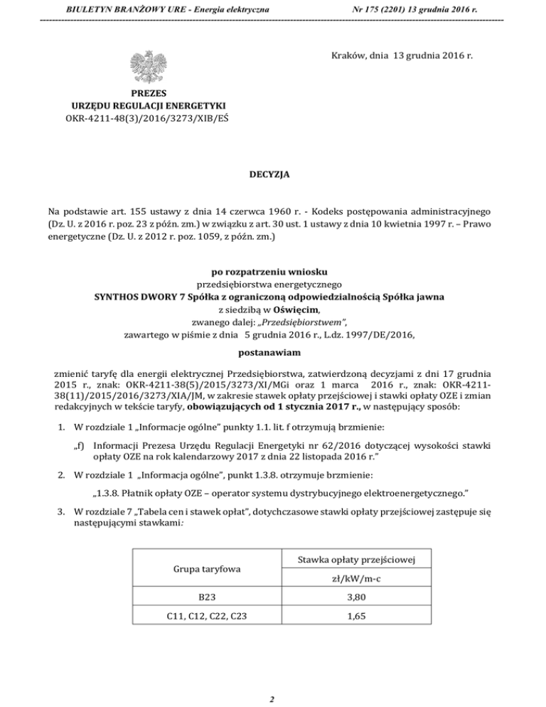 BIULETYN BRANŻOWY URE - Energia elektryczna Nr 175 (2201) 13 grudnia 2016 r. -------------------------------------------------------------------------------------------------------------------------------------------------------- Kraków, dnia 13 grudnia 2016 r. PREZES URZĘDU REGULACJI ENERGETYKI OKR-4211-48(3)/2016/3273/XIB/EŚ DECYZJA Na podstawie art. 155 ustawy z dnia 14 czerwca 1960 r. - Kodeks postępowania administracyjnego (Dz. U. z 2016 r. poz. 23 z późn. zm.) w związku z art. 30 ust. 1 ustawy z dnia 10 kwietnia 1997 r. – Prawo energetyczne (Dz. U. z 2012 r. poz. 1059, z późn. zm.) po rozpatrzeniu wniosku przedsiębiorstwa energetycznego SYNTHOS DWORY 7 Spółka z ograniczoną odpowiedzialnością Spółka jawna z siedzibą w Oświęcim, zwanego dalej: „Przedsiębiorstwem”, zawartego w piśmie z dnia 5 grudnia 2016 r., L.dz. 1997/DE/2016, postanawiam zmienić taryfę dla energii elektrycznej Przedsiębiorstwa, zatwierdzoną decyzjami z dni 17 grudnia 2015 r., znak: OKR-4211-38(5)/2015/3273/XI/MGi oraz 1 marca 2016 r., znak: OKR-421138(11)/2015/2016/3273/XIA/JM, w zakresie stawek opłaty przejściowej i stawki opłaty OZE i zmian redakcyjnych w tekście taryfy, obowiązujących od 1 stycznia 2017 r., w następujący sposób: 1. W rozdziale 1 „Informacje ogólne” punkty 1.1. lit. f otrzymują brzmienie: „f) Informacji Prezesa Urzędu Regulacji Energetyki nr 62/2016 dotyczącej wysokości stawki opłaty OZE na rok kalendarzowy 2017 z dnia 22 listopada 2016 r.” 2. W rozdziale 1 „Informacja ogólne”, punkt 1.3.8. otrzymuje brzmienie: „1.3.8. Płatnik opłaty OZE – operator systemu dystrybucyjnego elektroenergetycznego.” 3. W rozdziale 7 „Tabela cen i stawek opłat”, dotychczasowe stawki opłaty przejściowej zastępuje się następującymi stawkami: Stawka opłaty przejściowej Grupa taryfowa zł/kW/m-c B23 3,80 C11, C12, C22, C23 1,65 2 BIULETYN BRANŻOWY URE - Energia elektryczna Nr 175 (2201) 13 grudnia 2016 r. -------------------------------------------------------------------------------------------------------------------------------------------------------- Stawka opłaty przejściowej Grupa taryfowa G11 zł/m-c - poniżej 500 kWh 0,45 - 500 kWh do 1200 kWh 1,90 -powyżej 1200 kWh 6,50 4. W rozdziale 7 „Tabela cen i stawek opłat”, wyrazy „We wszystkich grupach taryfowych wprowadza się stawkę opłaty OZE w wysokości 2,51 zł/MWh, wskazanej w art. 185 ustawy o OZE”, zastępuje się wyrazami „We wszystkich grupach taryfowych wprowadza się stawkę opłaty OZE w wysokości 3,70 zł/MWh, wskazanej w Informacji Prezesa URE, o której mowa w pkt. 1.1.f) niniejszej taryfy”. UZASADNIENIE Decyzją z dnia 17 grudnia 2016 r., znak: OKR-4211-38(5)/2015/3273/XI/MGi, ogłoszoną w „Biuletynie Branżowym Urzędu Regulacji Energetyki – Energia elektryczna” Nr 175/2015 (2005) z dnia 17 grudnia 2015 r., oraz decyzją z dnia 1 marca 2016 r., znak: OKR-421138(11)/2015/2016/3273/XIA/JM, ogłoszoną w „Biuletynie Branżowym Urzędu Regulacji Energetyki – Energia elektryczna” Nr 31/2016 (2057) z dnia 1 marca 2016 r., zatwierdziłem ustaloną przez Przedsiębiorstwo taryfę dla energii elektrycznej, na okres 12 miesięcy od dnia wprowadzenia jej przez Przedsiębiorstwo do stosowania. Według oświadczenia Przedsiębiorstwa, taryfa została wprowadzona do stosowania w rozliczeniach z odbiorcami w dniu 1 kwietnia 2016 r. Pismem z dnia 5 grudnia 2016 r., L.dz. 1997/DE/201, uzupełnionym pismem z dnia 8 grudnia 2016 r. L.dz. 2032/DE/2016, Przedsiębiorstwo wystąpiło z wnioskiem o zmianę taryfy w zakresie stawek opłaty przejściowej, stawki opłaty OZE i zmian redakcyjnych z tym związanych. Zmiana ta wynika z konieczności zastąpienia: stawek opłaty przejściowej, obowiązujących w 2016 r., stawkami zawartymi w art. 11 a ustawy z dnia 29 czerwca 2007 r. o zasadach pokrywania kosztów powstałych u wytwórców w związku z przedterminowym rozwiązaniem umów długoterminowych sprzedaży mocy i energii elektrycznej (Dz. U. z 2007 r. Nr 130, poz. 905, z późn. zm.) – dodanym ustawą z dnia 22 czerwca 2016 r. o zmianie ustawy o odnawialnych źródłach energii oraz niektórych innych ustaw (Dz.U. z 2016 r. poz. 925); stawki opłaty OZE, obowiązującej w II połowie 2016 r., stawką wynikającą z Informacji Prezesa URE Nr 62/2016 z dnia 22 listopada 2016 r. dotycząca wysokości stawki opłaty OZE na rok kalendarzowy 2017. Nie uwzględniono wniosku Przedsiębiorstwa dotyczącego nadania aktualnego brzmienia odnoście „ustawy z dnia 20 lutego 2015 r. o odnawialnych źródłach energii (DZ. U. z 2015 r., poz. 478, z późn. zm.)”, bowiem aktualny zapis w taryfie zatwierdzanej decyzją Prezesa URE z dnia 1 marca 2016 r. znak: OKR4211-38(11)/2015/2016/3273/XIA/JM, uwzględniał ww. stan prawny. Zgodnie z art. 155 Kodeksu postępowania administracyjnego, decyzja ostateczna, na mocy której strona nabyła prawo, może być w każdym czasie za zgodą strony uchylona lub zmieniona przez organ administracji publicznej, który ją wydał, jeżeli przepisy szczególne nie sprzeciwiają się uchyleniu lub zmianie takiej decyzji i przemawia za tym interes społeczny lub słuszny interes strony. W niniejszej sprawie uznałem, że zostały spełnione przesłanki określone w powyższym przepisie, umożliwiające zmianę decyzji, w związku z czym orzekłem, jak w sentencji. POUCZENIE 1. Od niniejszej decyzji przysługuje odwołanie do Sądu Okręgowego w Warszawie - Sądu Ochrony Konkurencji i Konsumentów, za moim pośrednictwem, w terminie dwutygodniowym od dnia jej 2 3 BIULETYN BRANŻOWY URE - Energia elektryczna Nr 175 (2201) 13 grudnia 2016 r. -------------------------------------------------------------------------------------------------------------------------------------------------------- doręczenia (art. 30 ust. 2 i 3 ustawy - Prawo energetyczne oraz art. 47946 pkt 1 i art. 47947 § 1 Kodeksu postępowania cywilnego). 2. Odwołanie od 