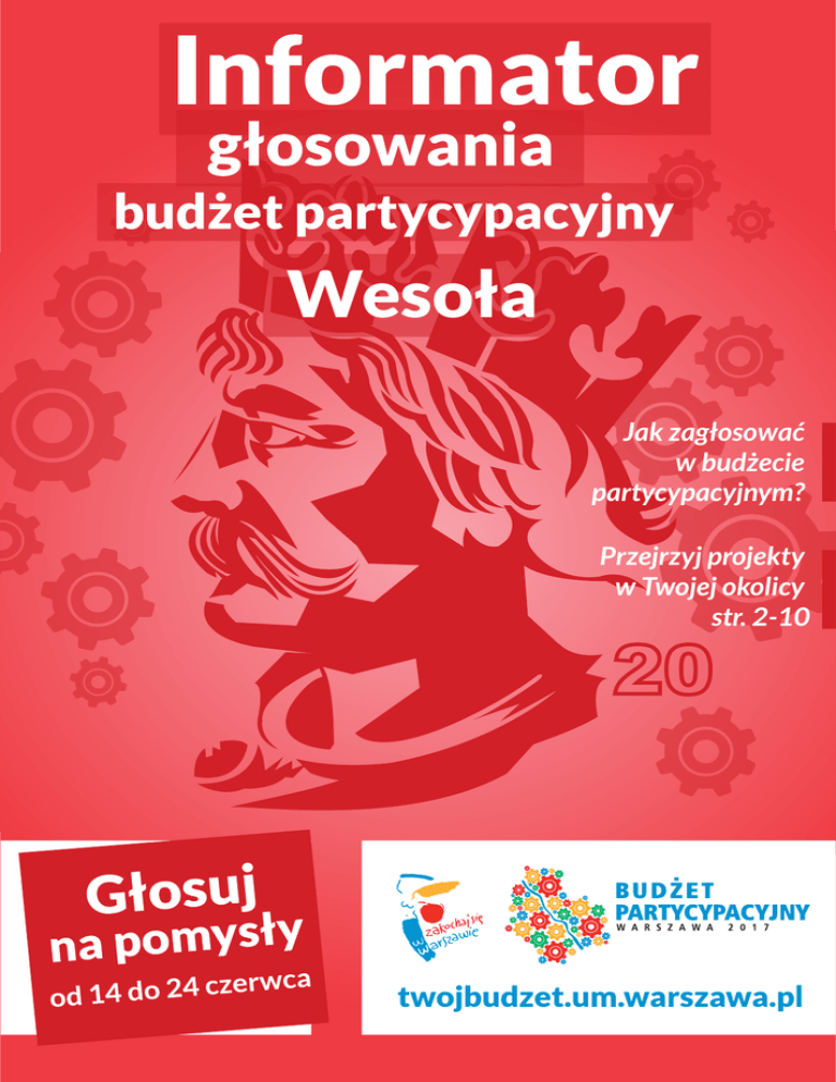 Wesoła Jak zagłosować w budżecie partycypacyjnym? Przejrzyj projekty w Twojej okolicy str. 2-10 Wstęp Co to jest budżet partycypacyjny? Budżet partycypacyjny to proces, w ramach którego możesz decydować o części budżetu miasta. Pomysły zgłoszone przez mieszkańców i wybrane w głosowaniu będą zrealizowane przez Urząd m.st. Warszawy. Głosując na pomysły w budżecie partycypacyjnym, masz realną szansę poprawić swoją najbliższą okolicę i decydować o tym jak będzie rozwijała się Warszawa. Jak głosować? Instrukcja krok po kroku. W jaki sposób możesz zagłosować? • • przez Internet – na stronie www.twojbudzet.um.warszawa.pl – musisz mieć e-mail (albo go założyć), na który przyjdzie link aktywacyjny. Jeżeli nie dostałeś maila z linkiem aktywacyjnym, sprawdź inne foldery w swojej poczcie np. spam lub zgłoś ten problem na adres [email protected]. papierowo – na karcie do głosowania przynosząc ją osobiście do urzędu dzielnicy lub innego wyznaczonego punktu do głosowania. Przed oddaniem wypełnionej karty konieczne będzie okazanie ważnego dokumentu tożsamości. Nie ma możliwości przyniesienia karty w imieniu innej osoby. Jak głosować? Krok po kroku. 1. 2. 3. 4. 5. 6. Wybierz dzielnicę, w której chcesz zagłosować. Jeżeli dzielnica jest podzielona na obszary – wybierz jeden z nich. Jeżeli dzielnica jest podzielona na dwa poziomy: ogólnodzielnicowy i lokalny, możesz zagłosować na poziomie ogólnodzielnicowym oraz w jednym wybranym obszarze lokalnym. Zapoznaj się z projektami, na które możesz zagłosować. Wybierz projekt albo projekty, na które chcesz głosować. Koszt realizacji projektów, które wybrałeś, nie może przekraczać całkowitej dostępnej kwoty przeznaczonej na dany obszar, w którym głosujesz. Jeśli głosujesz papierowo policz, czy wybrane przez Ciebie projekty nie przekraczają tej kwoty (w przeciwnym wypadku Twój głos będzie nieważny). Jeżeli głosujesz przez Internet, system sam zliczy koszt realizacji wybranych projektów. Wpisz swoje dane osobowe. Zagłosuj. Sprawdź, które pomysły zostaną zrealizowane. Wyniki głosowania zostaną ogłoszone do 15 lipca 2016 r. Możesz wybrać dowolną liczbę projektów, ale ich łączny koszt realizacji nie może być większy niż kwota przeznaczona na realizację projektów w danym obszarze. Przykład: w wybranym obszarze na realizację projektów jest 300 tys. zł. Możesz wybrać jeden projekt z kosztem realizacji 300 tys. zł, trzy projekty za 100 tys. zł lub 10 projektów za 30 tys. zł. Możesz zagłosować tylko raz. Jeżeli oddasz głos w kilku dzielnicach, albo na różne sposoby (przez Internet i na karcie papierowej), wszystkie Twoje głosy będą nieważne. Kto . może głosować? Udział w głosowaniu mogą brać wszyscy mieszkańcy Warszawy (nie trzeba być zameldowanym). Jeśli nie masz jeszcze 18 lat – dołącz zgodę rodzica lub opiekuna prawnego na udział w budżecie partycypacyjnym. Jeśli zagłosujesz przez Internet wystarczy, że Twój rodzic lub opiekun uzupełni swoje dane i wyrazi zgodę na formularzu elektronicznym, który pojawi się po tym, jak podasz swój nr PESEL. Wstęp Przewodnik po zgłoszonych projektach W niniejszym informatorze znajdziesz wszystkie projekty, na które będziesz mogła/mógł zagłosować od 14 do 24 czerwca. Projekty uszeregowane są w tej samej kolejności, co na kartach do głosowania. Z kolei cały informator podzielony jest na poszczególne obszary Twojej dzielnicy. Podział dzielnicy na obszary Dzielnica Wesoła w tegorocznej edycji budżetu partycypacyjnego została podzielona na cztery obszary. Każdy obszar ma do podziału określoną kwotę. Poniżej znajduje się mapka, pokazującazasięg poszczególnych obszarów oraz legenda, będąca spisem treści. Obszar 1 51 195 zł Plac Wojska Polskiego Okuniewska Armii Krajowej Obszar 3 148 884 zł Niemcewicza Obszar 2 143 007 zł Centrum, Zielona, Wola Grzybowska, Groszówka Grzybowa Lista projektów: Obszar 1 strona 2 Obszar 2 strony 2-5 Obszar 3 strony 5-6 Obszar 4 strony 6-10 Stara Miłosna Trakt Brzeski Obszar 4 309 914 zł 1 Rembertów Obszar 1 do 000 zł do dyspozycji dyspozycji 694 51 195 1. Akademia Szkraba (427) Cykl ogólnorozwojowych spotkań dla dzieci w wieku 1,5 – 3 lat wraz z opiekunami, prowadzony przez wykwalifikowaną kadrę. Dzieci uczestniczą w różnorodnych formach aktywności, stymulując rozwój poznawczy i społeczno – emocjonalny. Podczas zajęć Rodzice (opiekunowie) mają możliwość obserwacji swojego dziecka, pogłębienia wzajemnych relacji oraz wymiany doświadczeń z innymi uczestnikami zajęć. Lokalizacja projektu: Przedszkole nr 259, Plac Wojska Polskiego 18, 05-075 Warszawa Koszt realizacji 15 995,00 zł 2. Aktywny senior - gimnastyka (2567) Zajęcia gimnastyczne dla osób starszych z podziałem na: wzmacnianie, pilates, kondycyjne, korekcyjne, taneczne, joga itp. Wszystkie wyżej wymienione zajęcia mają na celu: podniesienie sprawności psychofizycznej osób starszych, przeciwdziałanie monotonii dnia codziennego, podniesienie jakości życia, wdrażanie nawyku zdrowego stylu życia obejmującego ćwiczenia fizyczne, dietę i pozytywne myślenie przeciwdziałanie monotonii dnia codziennego. Lokalizacja projektu: Koszt realizacji Wyspecjalizowane do prowadzenia zajęć sale: Fitness Art ul. Trakt Brzeski 60/60a 05-077 Warszawa; Fitness Mambo ul. Jana Pawła II 13 05-077 Warszawa; Wesolandia ul. Wspólna 4 05-075 Warszawa 20 000,00 zł 3. Życzliwość wobec kobiet w ciąży dla mieszkanek Wesołej. (1623) Projekt polega na organizacji na terenie Dzielnicy Dnia życzliwości wobec kobiet w ciąży. Celem projektu jest organizacja akcji społecznej na terenie Urzędu oraz placówek podległych Dzielnicy, mającej na celu popularyzację pozytywnych postaw wobec ciężarnych wśród pracowników oraz klientów urzędu i placówek, jak również nawiązywanie wspólnych relacji wśród kobiet w cią