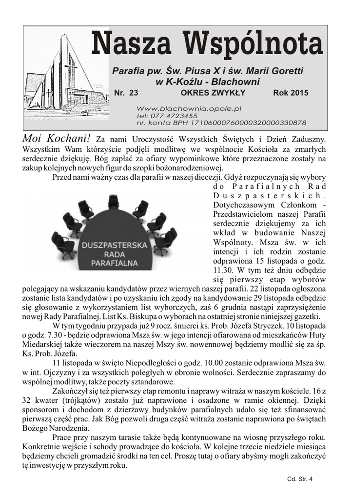 Nasza Wspólnota Parafia pw. Św. Piusa X i św. Marii Goretti w K-Koźlu - Blachowni Nr. 23 OKRES ZWYKŁY Rok 2015 Www.blachownia.opole.pl tel: 077 4723455 nr. konta BPH 17106000760000320000330878 Moi Kochani! Za nami Uroczystość Wszystkich Świętych i Dzień Zaduszny. Wszystkim Wam którzyście podjęli modlitwę we wspólnocie Kościoła za zmarłych serdecznie dziękuję. Bóg zapłać za ofiary wypominkowe które przeznaczone zostały na zakup kolejnych nowych figur do szopki bożonarodzeniowej. Przed nami ważny czas dla parafii w naszej diecezji. Gdyż rozpoczynają się wybory do Parafialnych Rad D u s z p a s t e r s k i c h . Dotychczasowym Członkom Przedstawicielom naszej Parafii serdecznie dziękujemy za ich wkład w budowanie Naszej Wspólnoty. Msza św. w ich intencji i ich rodzin zostanie odprawiona 15 listopada o godz. 11.30. W tym też dniu odbędzie się pierwszy etap wyborów polegający na wskazaniu kandydatów przez wiernych naszej parafii. 22 listopada ogłoszona zostanie lista kandydatów i po uzyskaniu ich zgody na kandydowanie 29 listopada odbędzie się głosowanie z wykorzystaniem list wyborczych, zaś 6 grudnia nastąpi zaprzysiężenie nowej Rady Parafialnej. List Ks. Biskupa o wyborach na ostatniej stronie niniejszej gazetki. W tym tygodniu przypada już 9 rocz. śmierci ks. Prob. Józefa Stryczek. 10 listopada o godz. 7.30 - będzie odprawiona Msza św. w jego intencji ofiarowana od mieszkańców Huty Miedarskiej także wieczorem na naszej Mszy św. nowennowej będziemy modlić się za śp. Ks. Prob. Józefa. 11 listopada w święto Niepodległości o godz. 10.00 zostanie odprawiona Msza św. w int. Ojczyzny i za wszystkich poległych w obronie wolności. Serdecznie zapraszamy do wspólnej modlitwy, także poczty sztandarowe. Zakończył się też pierwszy etap remontu i naprawy witraża w naszym kościele. 16 z 32 kwater (trójkątów) zostało już naprawione i osadzone w ramie okiennej. Dzięki sponsorom i dochodom z dzierżawy budynków parafialnych udało się też sfinansować pierwszą część prac. Jak Bóg pozwoli druga część witraża zostanie naprawiona po świętach Bożego Narodzenia. Prace przy naszym tarasie także będą kontynuowane na wiosnę przyszłego roku. Konkretnie wejście i schody prowadzące do kościoła. W kolejne trzecie niedziele miesiąca będziemy chcieli gromadzić środki na ten cel. Proszę tutaj o ofiary abyśmy mogli zakończyć tę inwestycję w przyszłym roku. Cd. Str. 4 Intencje mszalne od 09-22.11.2015 PONIEDZIAŁEK 09.11.2015 Rocznica poświęcenia Bazyliki Laterańskiej 7.30 - I Za + Ryszarda Krzywickiego od sąsiadów II Za + Ritę Wójtowicz (p) ----------------------------------------------------------------------------------------------------------WTOREK 10.11.2015 św. Leona Wielkiego papieża 7.30 - Za śp. Ks. Prob. Józefa Stryczek od mieszkańców Huty Miedarskiej 18.00 - Msza św. i Nowenna do MBNP 1. W int. dobrodziejów, ofiarodawców naszej Parafii 2. Przez wstawiennictwo MBNP dziękując za otrzymane łaski prosząc o dalsze błog. Boże, zdrowie i opiekę w rodzinie w p. int. 3. Przez wstawiennictwo MBNP dziękując za otrzymane łaski prosząc o dalsze błog. Boże, zdrowie i opiekę w int. Stanisława Biernackiego z ok. urodzin od Caritasu. 4. O zdrowie w p. int. 5. Przez wstawiennictwo MBNP dziękując za otrzymane łaski prosząc o dalsze błog. Boże, zdrowie i opiekę w int. Ireny i Alfreda w 30 rocz. ślubu i w int. Chrześnicy Natalii z ok. 10 rocz. urodzin. 6. Za + Huberta Znojek w 10 rocz. śmierci ++ z pokr. i dusze w czyśćcu cierpiące. 7. Za śp. Ks. Prob. Józefa Stryczek w 9 rocz. śmierci 8. Za ++ rodz. i Jana i Barbarę Czemerys w rocz. śmierci ++ z rodziny Czemerys, Kukiełka, Wężłowski i Dydfeld. 9. Za ++ synów Krystiana, Bernarda Drobisz do Miłosierdzia Bożego o radość nieba. 10. Za + Roberta Szulc ++ Franciszka i Franciszkę Warzecha. ---------------------------------------------------------------------------------------------------ŚRODA 11.11.2015 św. Marcina Święto Niepodległości 7.30 - Nowenna do św. Józefa Za + męża Jerzego Plucik w rocz. śmierci ++ rodziców i ++ rodzeństwo z obu stron. 10.00 - Msza św. w int. Ojczyzny i za poległych za wolność -----------------------------------------------------------------------------------------------------------------------CZWARTEK 12.11.2015 18.00 - I Za + syna Grzegorza Rynkiewicz w I rocz. śm. II Za + mamę, żonę, siostrę i babcię w 20 rocz. śmierci Zofii Zembrzuskiej. ---------------------------------------------------------------------------------------------------PIĄTEK 13.11.2015 św. Benedykta, Jana Mateusza i Krystyna pierwszych męczenników polskich 7.30 - Za + Jana Podlyska (p) 17.00 - Msza św. szkolna. Za ++ babcię Marię + dziadka Andrzeja ++ z rodziny Tracz i Czemerys. ---------------------------------------------------------------------------------------------------SOBOTA 14.11.2015 7.30 - I Za śp. Ritę Wójtowicz (p) II Za ++ rodz. Franciszka i Franciszkę Warzecha + 3 braci. 17.00 - okazja do sakramentu pokuty i pojednania 18.00 - Przez wstawiennictwo MBNP dziękując za otrzymane łaski prosząc o dalsze błog. Boże, zdrowie i opiekę w int. rodziny Dronia oraz w int. dzieci z rodzinami. ---------------------------------------------------------------------------------------------------- XXXIII NIEDZIELA ZWYKŁA 15.11.2015 kolekta specjalna na remont tarasu 7.30 - Za śp. Mieczysława Kręcisz i ++ rodziców Jana i Mariannę od rodziny z Szydłowa. 10.00 - Przez wstawiennictwo MBNP dziękując za otrzymane łaski prosząc o dalsze błog. Boże, zdrowie i opiekę w int. Mateusza i Manueli z ok. urodzin. 11.30 - I Za + ks. Prob. Józefa Stryczek i ks. Prob. Jerzego Kopton od mieszkańców Miedar i Huty Miedarskiej. II W int. Parafii i kończących kadencję Członków Rady Parafialnej i ich rodzin. 15.15 - Nieszpory Niedzielne 16.00 - Kłek ---------------------------------