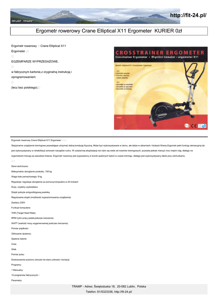 http://fit-24.pl/ Ergometr rowerowy Crane Elliptical X11 Ergometer KURIER 0zł Ergometr rowerowy Crane Elliptical X11 Ergometer . EGZEMPARZE WYPRZEDAŻOWE, w fabrycznym kartonie,z oryginalną instrukcją i oprogramowaniem (lecz bez polskiego). Ergometr rowerowy Crane Elliptical X11 Ergometer - Stacjonarne urządzenie treningowe pozwalające utrzymać dobrą kondycję fizyczną. Może być wykorzystywane w domu, ale także w siłowniach i klubach fitness.Ergometr pełni funkcję rekreacyjną lub jest wykorzystywany w rehabilitacji schorzeń narządów ruchu. W codziennej eksploatacji nie różni się wiele od rowerów treningowych, pozwala jednak mierzyć moc mięśni nóg, dlatego na ergometrach trenują np.zawodowi kolarze. Ergometr rowerowy jest wyposażony w licznik spalonych kalorii w czasie treningu, dlatego jest wykorzystywany także przy odchudzaniu. Dane techniczne: Maksymalne obciążenie produktu: 150 kg Waga koła zamachowego: 8 kg Regulacja: regulacja obciążenia za pomocą komputera w 24 krokach Duży, czytelny wyświetlacz Stopki pokryte antypoślizgową powłoką Regulowane stopki (możliwość wypoziomowania urządzenia) Zasilacz 230V Funkcje komputera: THR (Target Heart Rate) RPM (rytm pracy pedał podczas ćwiczenia) WATT (wartość mocy wygenerowanej podczas ćwiczenia) Pomiar prędkości Obliczanie dystansu Spalone kalorie Czas Wiek Pomiar pulsu Dostosowanie poziomu ćwiczeń do stanu zdrowia i kondycji Programy: 1 Manualny. 10 programów fabrycznych: Parametry: TRAMP - Adres: Świętoduska 18, 20-082 Lublin, Polska Telefon: 81/5323336, http://fit-24.pl/ Wymiary w cm: 126cm dł./ 69cm szer./ 166cm wys. http://fit-24.pl/ Waga koła zamachowego: 8 kg. Max. waga użytkownika: 150 kg. Waga: 56 kg. TRAMP - Adres: Świętoduska 18, 20-082 Lublin, Polska Telefon: 81/5323336, http://fit-24.pl/