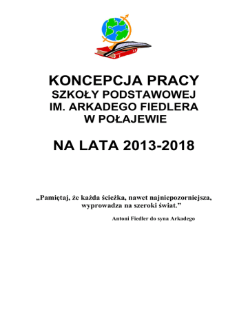 KONCEPCJA PRACY SZKOŁY PODSTAWOWEJ IM. ARKADEGO FIEDLERA W POŁAJEWIE NA LATA 2013-2018 „Pamiętaj, że każda ścieżka, nawet najniepozorniejsza, wyprowadza na szeroki świat.” Antoni Fiedler do syna Arkadego MISJA SZKOŁY Szkoła kształci oraz wspiera rodziców w procesie wychowania i nauczania. Stwarza dobre warunki do prawidłowego i wszechstronnego rozwoju osobowego ucznia. Zapewnia przyjazną i bezpieczną atmosferę sprzyjającą osiąganiu sukcesów naszych wychowanków. WIZJA SZKOŁY Szkoła dba o jak najlepsze efekty kształcenia i rozwój uczniów. Posiada nowoczesną bazę umożliwiająca wysoki poziom nauczania. Jest miejscem, w którym uczniowie czują się dobrze i bezpiecznie. Współpracuje z instytucjami wspomagającymi pracę szkoły oraz społecznością lokalną. Propaguje zdrowy styl życia oraz potrzebę troski o środowisko naturalne. Rozbudza w uczniach poczucie przynależności narodowej i kształtuje postawy patriotyczne. Jest efektywnie zarządzana. PRIORYTETY SZKOŁY 1. Zapewnienie wysokiego poziomu kształcenia. 2. Rozwijanie osobowości uczniów i wdrażanie ich do samokształcenia 3. Wychowanie dziecka twórczego i świadomego swej wartości. 4. Stwarzanie przyjaznej atmosfery w szkole. 5. Wdrażanie do zasad przestrzegania dobrych obyczajów i kultury osobistej. 6. Rozwijanie zainteresowań i uzdolnień. 7. Motywowanie ucznia do nauki. 8. Wyrównywanie szans edukacyjnych i braków kulturowych. 9. Kształtowanie umiejętności współpracy w grupie, rozwijanie aktywności społecznej oraz umiejętności rozwiązywania konfliktów. 10. Dbanie o zdrowie. 11. Kształtowanie postaw ekologicznych. 12. Przygotowanie do życia w rodzinie oraz społeczności, wzmacnianie więzi z rodziną. 13. Uczenie szacunku do tradycji, dóbr kultury oraz polskich symboli narodowych. 14. Kształtowanie poczucia przynależności do kultury europejskiej. 15. Dbanie o rozwój samorządności uczniowskiej. 16. Przestrzeganie praw człowieka. 17. Promowanie szkoły w środowisku lokalnym NASZYM CELEM JEST SZKOŁA: 1. Efektywna – sprawnie zarządzana. 2. Przyjazna dla uczniów, rodziców i pracowników. 3. Bezpieczna i tolerancyjna. CECHY ABSOLWENTA NASZEJ SZKOŁY: - samodzielny, - odpowiedzialny, - pracowity, - przygotowany do życia w otaczającym go świecie, - aktywny i twórczy, - otwarty i optymistyczny, - tolerancyjny i prawy, - ciekawy świata, - świadomy swoich praw i praw innych ludzi. KONCEPCJA ROZWOJU SZKOŁY W POSZCZEGÓLNYCH OBSZARACH I. ZARZĄDZANIE I ORGANIZACJA 1.Wspólne planowanie z organami szkoły przedsięwzięć podejmowanych w szkole. 2. Zapewnienie dzieciom bezpiecznych warunków do nauki i zabawy. 3. Optymalne przygotowanie szkoły do obniżenia wieku szkolnego – przygotowanie i wyposażenie sal edukacji wczesnoszkolnych. 4.Inicjowanie działań na rzecz podniesienia jakości pracy szkoły, planowanie procesu dydaktycznego. 5. Baza i wyposażenie szkoły: - wymiana pracowni komputerowej na nową; - wzbogacenie szkoły w nowe meble, komputery, sprzęt sportowy i inne pomoce dydaktyczne; - wzbogacanie księgozbioru biblioteki szkolnej; - odnawianie pomieszczeń szkolnych i dbanie o ich estetykę; - pozyskiwanie sponsorów na nowe inwestycje; - rozbudowa monitoringu wizyjnego. 6.Wspieranie nauczycieli w rozwoju zawodowym: - motywowanie do podejmowania działań zmierzających do doskonalenia umiejętności zawodowych nauczycieli; - dofinansowywanie form doskonalenia zawodowego nauczycielom podnoszącym lub uzyskującym dodatkowe kwalifikacje zgodne z potrzebami szkoły; 7. Współpraca z instytucjami wspierającymi działania szkoły w środowisku lokalnym. 8. Zapewnienie uczniom bogatej oferty zajęć pozalekcyjnych. 9. Organizacja nadzoru pedagogicznego i ewaluacji wewnętrznej. 10. Realizowanie programów: „Szklanka mleka”, „Owoce w szkole”, „Szkoła promująca zdrowie”. II. WYCHOWANIE I OPIEKA 1. Diagnozowanie sytuacji i potrzeb wychowawczych. 2. Organizowanie i udzielanie pomocy psychologiczno- pedagogicznej oraz logopedycznej uczniom i rodzicom. 3. Prowadzenie zajęć z zakresu terapii pedagogicznej. 4. Realizowanie programu „Spójrz inaczej”. 5. Propagowanie zdrowego stylu życia i działań proekologicznych. 6. Organizowanie opieki w czasie wolnym (świetlica, zajęcia sportowe, wyjścia edukacyjne, wycieczki). 7. Organizowanie udziału dzieci w konkursach pozaszkolnych. 8. Prowadzenie kółek zainteresowań oraz innych zajęć pozalekcyjnych. 9. Zapewnienie uczniom bezpiecznych warunków pobytu w szkole. 10. Pielęgnowanie tradycji narodowych, ceremoniału szkoły. 11. Zapewnienie opieki socjalnej ( dożywianie uczniów z rodzin najuboższych - catering, zapewnienie ciepłej herbaty w czasie przerwy śniadaniowej, dofinansowanie do podręczników oraz do wycieczek i innych wyjazdów organizowanych w szkole). 12. Budowanie pozytywnego klimatu w szkole. 13. Współpracowanie z rodzicami w celu zapewnienia jak najlepszej opieki oraz wspieranie ich w wychowaniu dzieci. 14. Podejmowanie interwencji wobec uczniów z włączeniem rodziców. III. KSZTAŁCENIE. 1. Utrzymanie wysokiego poziomu kształcenia. 2. Umożliwienie uczniom wszechstronnego rozwoju poprzez dostosowanie programów nauczania do możliwości i potrzeb uczniów, stosowanie różnorodnych metod i form pracy oraz prowadzenie szerokiej oferty zajęć pozalekcyjnych. 3. Zwiększanie szans edukacyjnych uczniów poprzez indywidualizację procesu nauczania. 4. Wspieranie uczniów zdolnych oraz o specjalnych potrzebach edukacyjnych. 5. Wprowadzanie nowatorskich rozwiązań programowych oraz innowacyjnych metod nauczania. 6. Realizacja podstawy programowej poprzez właściwy wybór programów nauczania. 7. Stosowanie różnorodnych sposobów wspierania i motywowania uczniów. 8. Kształcenie umiejętności logicznego myślenia. 9. Badanie osiągnięć edukacyjnych uczniów na poszczególnych poziomach i podejmowanie działań przyczyniających się do poprawy wyników naucz