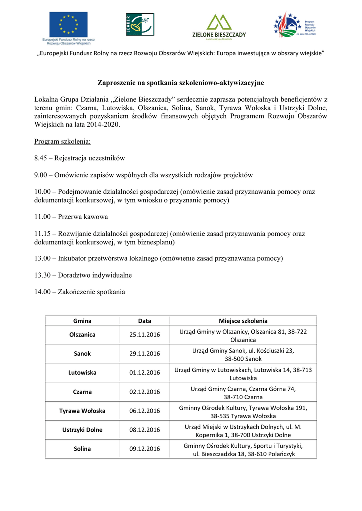 „Europejski Fundusz Rolny na rzecz Rozwoju Obszarów Wiejskich: Europa inwestująca w obszary wiejskie” Zaproszenie na spotkania szkoleniowo-aktywizacyjne Lokalna Grupa Działania „Zielone Bieszczady” serdecznie zaprasza potencjalnych beneficjentów z terenu gmin: Czarna, Lutowiska, Olszanica, Solina, Sanok, Tyrawa Wołoska i Ustrzyki Dolne, zainteresowanych pozyskaniem środków finansowych objętych Programem Rozwoju Obszarów Wiejskich na lata 2014-2020. Program szkolenia: 8.45 – Rejestracja uczestników 9.00 – Omówienie zapisów wspólnych dla wszystkich rodzajów projektów 10.00 – Podejmowanie działalności gospodarczej (omówienie zasad przyznawania pomocy oraz dokumentacji konkursowej, w tym wniosku o przyznanie pomocy) 11.00 – Przerwa kawowa 11.15 – Rozwijanie działalności gospodarczej (omówienie zasad przyznawania pomocy oraz dokumentacji konkursowej, w tym biznesplanu) 13.00 – Inkubator przetwórstwa lokalnego (omówienie zasad przyznawania pomocy) 13.30 – Doradztwo indywidualne 14.00 – Zakończenie spotkania Gmina Data Miejsce szkolenia Olszanica 25.11.2016 Urząd Gminy w Olszanicy, Olszanica 81, 38-722 Olszanica Sanok 29.11.2016 Urząd Gminy Sanok, ul. Kościuszki 23, 38-500 Sanok Lutowiska 01.12.2016 Urząd Gminy w Lutowiskach, Lutowiska 14, 38-713 Lutowiska Czarna 02.12.2016 Urząd Gminy Czarna, Czarna Górna 74, 38-710 Czarna Tyrawa Wołoska 06.12.2016 Gminny Ośrodek Kultury, Tyrawa Wołoska 191, 38-535 Tyrawa Wołoska Ustrzyki Dolne 08.12.2016 Urząd Miejski w Ustrzykach Dolnych, ul. M. Kopernika 1, 38-700 Ustrzyki Dolne Solina 09.12.2016 Gminny Ośrodek Kultury, Sportu i Turystyki, ul. Bieszczadzka 18, 38-610 Polańczyk
