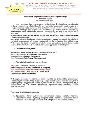 RADOMSKI OŚRODEK DOSKONALENIA NAUCZYCIELI 26-600 Radom, ul. J. Słowackiego 17, www.rodon.radom.pl tel. 48 3600005, fax 48 3600065, e-mail: [email protected] Regulamin Regionalnego Konkursu Czytelniczego Kocham czytać (szkoły podstawowe) Ideą konkursu jest promowanie czytelnictwa. Doskonalenie umiejętności czytania i rozumienia tekstu literackiego, rozwijanie wyobraźni i kreatywności oraz pogłębianie znajomości literatury, a także kształtowanie wrażliwości na piękno słowa – to cele naszego przedsięwzięcia, alternatywnego wobec kultury obrazkowej. Rozbudzając pasje czytelnicze uczniów, nawiązujemy do akcji Cała Polska czyta dzieciom. Uczestnikami tegorocznej edycji mogą być uczniowie szkół podstawowych z Radomia i powiatów. Aby wziąć udział w konkursie międzypowiatowym, należy przystąpić do szkolnych eliminacji organizowanych przez nauczycieli języka polskiego lub bibliotekarzy. Wytypowani tą drogą reprezentanci szkoły mają za zadanie przeczytać powieści wymienione w konkursowej liście lektur z wybranej przez siebie kategorii: • Powieści fantastyczne: Rafał Kosik, Felix, Net i Nike oraz Orbitalny spisek cz. I Marcin Szczygielski, Czarownica piętro niżej Ulysses Moore, Kamienni strażnicy John Flanagan, Zwiadowcy. Płonący most • Powieści obyczajowe i przygodowe: Małgorzata Gutowska-Adamczyk, 220 linii Paweł Beręsewicz, Kiedy chodziłem z Julką Maj Mariusz Niemycki, Zuzia na zamku Białej Damy* Mariusz Niemycki, Zuzia kontra Scotland Yard Irena Landau, Witaj, córeczko! W I etapie konkursu reprezentanci szkół wykażą się znajomością problematyki przeczytanych utworów (test). Zwycięzcy I etapu muszą wybrać spośród powyższych książek jedną i przygotować ustną wypowiedź na 5-7 minut , zachęcającą do jej przeczytania, np. w formie prezentacji wykorzystującej rekwizyty, środki audiowizualne itp. Terminarz działań konkursowych: 1. Zgłoszenia (karta zgłoszenia) zawierające nazwę szkoły, nazwiska uczestników wraz wybraną kategorią oraz nazwiska opiekunów należy nadesłać lub dostarczyć osobiście do 6 lutego 2015 na adres RODoN-u. RADOMSKI OŚRODEK DOSKONALENIA NAUCZYCIELI 26-600 Radom, ul. J. Słowackiego 17, www.rodon.radom.pl tel. 48 3600005, fax 48 3600065, e-mail: [email protected] 2. Etap I – 26 lutego 2015 r. (czwartek) godz. 15.00 w PSP nr 33 w Radomiu przy ul. Kolberga 5 (test sprawdzający znajomość utworów wybranej kategorii). 3. Etap II – 13 kwietnia 2015, godz. 09.00 w Miejskiej Bibliotece Publicznej przy ul. Piłsudskiego 12 (prezentacje ustne). Kryteria oceny prezentacji: - treść i kompozycja wystąpienia – 7 + 3 = 10 punktów - język – 10 punktów - pomysł i wyraz artystyczny – 5 + 5 = 10 punktów. O kolejności miejsc finałowych decyduje suma punktów uzyskanych w obu etapach konkursu. Laureatami konkursu zostają finaliści, którzy uzyskali co najmniej 90% punktów możliwych do zdobycia w II etapie. Laureaci konkursu otrzymają dyplomy, a nagrody rzeczowe zostaną przyznane trojgu najlepszym uczniom. Istnieje możliwość przyznania większej liczby nagród rzeczowych - uzależnione jest to od pozyskanych przez organizatorów środków finansowych. Zasady udziału: 1. Udział uczniów w konkursie jest dobrowolny. 2. Niestawienie się ucznia na konkurs w dniu przeprowadzania konkursu jest równoznaczne z rezygnacją z udziału w konkursie. 3. Uczniowie przystępujący do II stopnia konkursu obowiązani są okazać legitymację szkolną. 4. Nie przewiduje się żadnych terminów dodatkowych dla poszczególnych stopni konkursu. 5. W drugim etapie brać udział mogą uczniowie, którzy najpóźniej w dniu konkursu dostarczą podpisany przez prawnego opiekuna „załącznik nr 1” niniejszego regulaminu. 6. Organizator zastrzega możliwość odwołania zawodów na każdym etapie. Organizator: Radomski Ośrodek Doskonalenia Nauczycieli Partner: Oddział radomski Stowarzyszenia Nauczycieli Polonistów Koordynator projektu: mgr Małgorzata Boruta