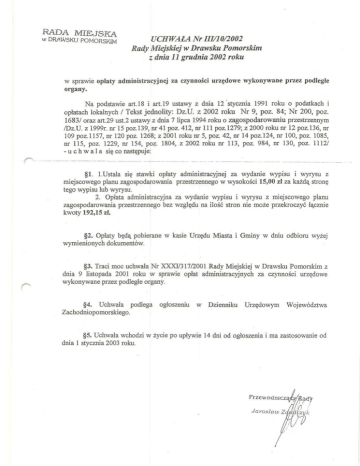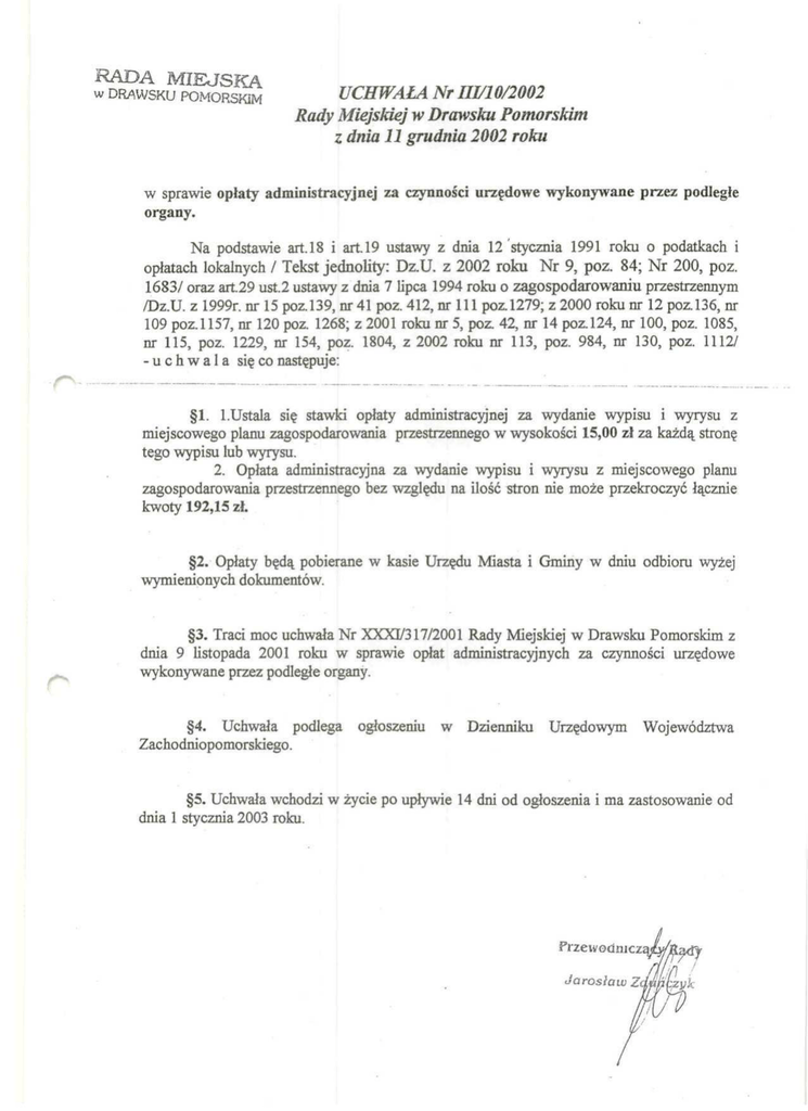HADA MIEJSKA w DRAWSKU POMORSKIM UCHWAŁA Nr III/10/2002 Rady Miejskiej w Drawsku Pomorskim z dnia 11 grudnia 2002 roku w sprawie opłaty administracyjnej za czynności urzędowe wykonywane przez podległe organy. Na podstawie art.18 i art.19 ustawy z dnia 12 'stycznia 1991 roku o podatkach i opłatach lokalnych / Tekst jednolity: Dz.U. z 2002 roku Nr 9, póz. 84; Nr 200, póz. 16837 oraz art.29 ust.2 ustawy z dnia 7 lipca 1994 roku o zagospodarowaniu przestrzennym /Dz.U. z 1999r. nr 15 poz.139, nr 41 póz. 412, nr 111 poz.1279; z 2000 roku nr 12 poz.136, nr 109 poz.1157, nr 120 póz. 1268; z 2001 roku nr 5, póz. 42, nr 14 poz.124, nr 100, póz. 1085, nr 115, póz. 1229, nr 154, póz. 1804, z 2002 roku nr 113, póz. 984, nr 130, póz. 11127 - u c h w a l a się co następuje: §1. 1.Ustala się stawki opłaty administracyjnej za wydanie wypisu i wyrysu z miejscowego planu zagospodarowania przestrzennego w wysokości 15,00 zł za każdą stronę tego wypisu lub wyrysu. 2. Opłata administracyjna za wydanie wypisu i wyrysu z miejscowego planu zagospodarowania przestrzennego bez względu na ilość stron nie może przekroczyć łącznie kwoty 192,15 zł. §2. Opłaty będą pobierane w kasie Urzędu Miasta i Gminy w dniu odbioru wyżej wymienionych dokumentów. §3. Traci moc uchwała Nr XXXI/317/2001 Rady Miejskiej w Drawsku Pomorskim z dnia 9 listopada 2001 roku w sprawie opłat administracyjnych za czynności urzędowe wykonywane przez podległe organy. §4. Uchwała podlega Zachodniopomorskiego. ogłoszeniu w Dzienniku Urzędowym Województwa §5. Uchwała wchodzi w życie po upływie 14 dni od ogłoszenia i ma zastosowanie od dnia l stycznia 2003 roku. Przewodnicz Jarosław Z