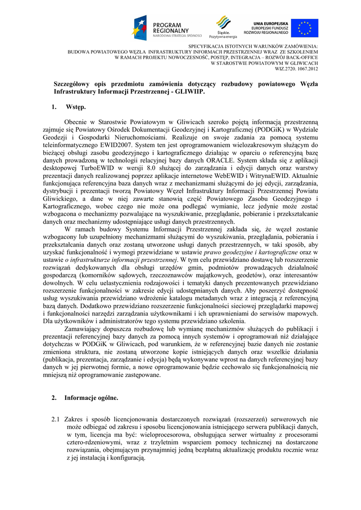 SPECYFIKACJA ISTOTNYCH WARUNKÓW ZAMÓWIENIA: BUDOWA POWIATOWEGO WĘZŁA INFRASTRUKTURY INFORMACJI PRZESTRZENNEJ WRAZ ZE SZKOLENIEM W RAMACH PROJEKTU NOWOCZESNOŚĆ, POSTĘP, INTEGRACJA – ROZWÓJ BACK-OFFICE W STAROSTWIE POWIATOWYM W GLIWICACH WIZ.2720. 1067.2012 Szczegółowy opis przedmiotu zamówienia dotyczący rozbudowy powiatowego Węzła Infrastruktury Informacji Przestrzennej - GLIWIIP. 1. Wstęp. Obecnie w Starostwie Powiatowym w Gliwicach szeroko pojętą informacją przestrzenną zajmuje się Powiatowy Ośrodek Dokumentacji Geodezyjnej i Kartograficznej (PODGiK) w Wydziale Geodezji i Gospodarki Nieruchomościami. Realizuje on swoje zadania za pomocą systemu teleinformatycznego EWID2007. System ten jest oprogramowaniem wielozakresowym słuŜącym do bieŜącej obsługi zasobu geodezyjnego i kartograficznego działając w oparciu o referencyjną bazę danych prowadzoną w technologii relacyjnej bazy danych ORACLE. System składa się z aplikacji desktopowej TurboEWID w wersji 8.0 słuŜącej do zarządzania i edycji danych oraz warstwy prezentacji danych realizowanej poprzez aplikacje internetowe WebEWID i WitrynaEWID. Aktualnie funkcjonująca referencyjna baza danych wraz z mechanizmami słuŜącymi do jej edycji, zarządzania, dystrybucji i prezentacji tworzą Powiatowy Węzeł Infrastruktury Informacji Przestrzennej Powiatu Gliwickiego, a dane w niej zawarte stanowią część Powiatowego Zasobu Geodezyjnego i Kartograficznego, wobec czego nie moŜe ona podlegać wymianie, lecz jedynie moŜe zostać wzbogacona o mechanizmy pozwalające na wyszukiwanie, przeglądanie, pobieranie i przekształcanie danych oraz mechanizmy udostępniające usługi danych przestrzennych. W ramach budowy Systemu Informacji Przestrzennej zakłada się, Ŝe węzeł zostanie wzbogacony lub uzupełniony mechanizmami słuŜącymi do wyszukiwania, przeglądania, pobierania i przekształcania danych oraz zostaną utworzone usługi danych przestrzennych, w taki sposób, aby uzyskać funkcjonalność i wymogi przewidziane w ustawie prawo geodezyjne i kartograficzne oraz w ustawie o infrastrukturze informacji przestrzennej. W tym celu przewidziano dostawę lub rozszerzenie rozwiązań dedykowanych dla obsługi urzędów gmin, podmiotów prowadzących działalność gospodarczą (komorników sądowych, rzeczoznawców majątkowych, geodetów), oraz interesantów dowolnych. W celu uelastycznienia rodzajowości i tematyki danych prezentowanych przewidziano rozszerzenie funkcjonalności w zakresie edycji udostępnianych danych. Aby poszerzyć dostępność usług wyszukiwania przewidziano wdroŜenie katalogu metadanych wraz z integracją z referencyjną bazą danych. Dodatkowo przewidziano rozszerzenie funkcjonalności sieciowej przeglądarki mapowej i funkcjonalności narzędzi zarządzania uŜytkownikami i ich uprawnieniami do serwisów mapowych. Dla uŜytkowników i administratorów tego systemu przewidziano szkolenia. Zamawiający dopuszcza rozbudowę lub wymianę mechanizmów słuŜących do publikacji i prezentacji referencyjnej bazy danych za pomocą innych systemów i oprogramowań niŜ działające dotychczas w PODGiK w Gliwicach, pod warunkiem, Ŝe w referencyjnej bazie danych nie zostanie zmieniona struktura, nie zostaną utworzone kopie istniejących danych oraz wszelkie działania (publikacja, prezentacja, zarządzanie i edycja) będą wykonywane wprost na danych referencyjnej bazy danych w jej pierwotnej formie, a nowe oprogramowanie będzie cechowało się funkcjonalnością nie mniejszą niŜ oprogramowanie zastępowane. 2. Informacje ogólne. 2.1 Zakres i sposób licencjonowania dostarczonych rozwiązań (rozszerzeń) serwerowych nie moŜe odbiegać od zakresu i sposobu licencjonowania istniejącego serwera publikacji danych, w tym, licencja ma być: wieloprocesorowa, obsługująca serwer wirtualny z procesorami cztero-rdzeniowymi, wraz z trzyletnim wsparciem pomocy technicznej na dostarczone rozwiązania, obejmującym przynajmniej jedną bezpłatną aktualizację produktu rocznie wraz z jej instalacją i konfiguracją. 2.2 Zakres i sposób licencjonowania dostarczonych rozwiązań (rozszerzeń) stanowiskowych (klienckich) musi zostać rozszerzony do licencji serwerowej lub licencji grupowej na nieograniczoną liczbę stanowisk. Licencja ma zawierać minimum trzyletni serwis gwarancyjny obejmujący wsparcie pomocy technicznej oraz bezpłatne aktualizacje dostarczonych rozszerzeń i mechanizmów. 2.3 Zamawiający dopuszcza rozbudowę lub wymianę mechanizmów słuŜących do publikacji i prezentacji referencyjnej bazy danych za pomocą innych systemów i oprogramowań niŜ działające dotychczas w PODGiK w Gliwicach, pod warunkiem, Ŝe: 2.3.1 w referencyjnej bazie danych nie zostanie zmieniona struktura, 2.3.2 w referencyjnej bazie danych nie zostaną utworzone kopie istniejących danych, 2.3.3 wszelkie działania edycyjne w tym słuŜące obsłudze interesantów, modyfikacje poszczególnych rejestrów i ewidencji czy udostępnianie danych, będą wykonywane wprost na danych referencyjnej bazy danych w jej pierwotnej formie lub odpowiednio generowane z danych tejŜe bazy, a nowe oprogramowanie będzie cechowało się funkcjonalnością nie mniejszą niŜ oprogramowanie zastępowane. 3. Rozbudowa serwera publikacji danych. 3.1 Rozbudowany serwer publikacji danych ma się odznaczać następującą funkcjonalnością: 3.1.1 Wymagana obsługa systemu zarządzania bazą danych Oracle 11g posiadanego przez Zamawiającego wraz z wykorzystaniem wydajnych metod obsługi danych graficznych w standardzie SDO. 3.1.2 Wymagana obsługa standardów OGC, w tym w szczególności WMS. 3.1.3 Wymagana obsługa serwisów transakcyjnych oraz wspierających wydajne metody publikacji danych mapowych. 3.1.4 Wymagane wbudowane narzędzia udostępniające funkcje edycji geometrii i atrybutów obiektów przestrzennych. 3.1.5 Serwer musi udostępniać bezpłatny interfejs programistyczny (API) umoŜliwiający uŜytkowniko