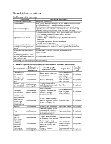 Mechanik obchodowy w elektrowni 1.1. Charakterystyka stanowiska Mechanik obchodowy Stanowisko Faza użytkowania obiektu Granice obiektu Przeglądy, konserwacja Hala kotłów oraz teren przyległy do hali, na którym umieszczono część kanałów spalin z urządzeniami do odpylania Pomieszczenie dyżurne mechanika obchodowego na hali kotłów Opis stanowiska pracy wyizolowane przed hałasem o kubaturze 25 m3, hala kotłów od poziomu zerowego do poziomu 30 m oraz teren przyległy – przeglądy urządzeń (łamacz żużla, wentylatory spalin, wentylatory podmuchu, podajniki węgla, młyny węglowe, armatura wodna i parowa) Wykonywane czynności – kontrola drgań i temperatury łożysk, kontrola szczelności armatury), – konserwacja urządzeń (łożyska, armatura) – rewizja wewnętrzna młyna Niedogodności wykryte w cza- Praca zmianowa, używanie środków ochrony indywidualnej, sie dotychczasowego użytkozmienna temperatura środowiska pracy, ograniczona przestrzeń wania pracy Stosowane materiały i środki Urządzenia pomiarowe, narzędzia, smary i materiały pracy uszczelniające Poziom przygotowania zawodowego, wymagane uprawnienia, predyspozycje Wykształcenie zawodowe Inne osoby narażone na ryzyko Inni pracownicy 1.2. Identyfikacja i charakterystyka zagrożeń na stanowisku mechanika obchodowego Dokumenty Typ zagrożenia wykorzystane do identyfikacji Upadek na tym samym pozio- Lista kontrolna mie Upadek z podestów obsługo- Lista kontrolna wych Kontakt z ostryLista kontrolna, mi i szorstkimi rejestr wypadków powierzchniami Uderzenie, przygniecenie Lista kontrolna, rejestr wypadków Kontakt z gorącymi powierzchniami (czynniLista kontrolna kami), wodą i parą wodną (nieszczelność) Wybuch Lista kontrolna Pożar Kontakt z energią elektryczną Substancje i preparaty chemiczne toksyczne Pochwycenie przez ruchome Lista kontrolna Lista kontrolna Lista kontrolna Lista kontrolna, rejestr wypadków Charakterystyka zagrożenia – źródło Śliska, mokra i zapylona powierzchnia Schody, podesty itp. Urządzenia, narzędzia, uszkodzone oblachowanie izolacji termicznej Środki transportu, czynności konserwacyjne (elementy urządzeń konserwowanych) Stopień strat Ogólne potłuczenie ciała, złamanie Uwzględnić kości kończyn Ogólne potłuczenie ciała, złamanie Uwzględnić kości kończyny Rany dłoni Uwzględnić Ogólne potłuczenie ciała, złamania Uwzględnić kończyn, śmierć Wysoka temperatura elementów urządzeń, kotłów, Oparzenie ciała gorąca woda, para itp. Eksplozja pyłu węglowego Poparzenie, śmierć Zapalenie się pyłu węglowego, zatarcie łożysk, wyPoparzenie, śmierć konywanie prac pożarowo niebezpiecznych Obsługa urządzeń zasilaPorażenie, śmierć nych prądem elektrycznym Tlenek węgla – strop kotła, wadliwe prowadzenie kotła, wadliwy stan techniczny Elementy wirujące urządzeń Weryfikacja zagrożeń Toksyczne uszkodzenie narządów wewnętrznych Uwzględnić Uwzględnić Uwzględnić Uwzględnić Uwzględnić Urazy mechaniczne, Uwzględnić utrata kończyn Dokumenty Charakterystyka Typ zagrożenia wykorzystane do zagrożenia – źródło identyfikacji elementy urządzeń Lista kontrolna, Praca urządzeń Hałas rejestr chorób (przekładnie, pompy, zawodowych wentylatory, młyn itp.) Stopień strat Weryfikacja zagrożeń Zawodowe Uwzględnić uszkodzenie słuchu 1.3. Ocena ryzyka zawodowego na stanowisku mechanika obchodowego (ocena wykonana metodą PHA) Możliwość uniknięcia lub ograniczenia strat Poziom ryzyka SP = R Działania zapobiegawcze 23 = 6 – dopuszczalna Ogólne potłuUpadek na Śliska, mokra Czyste, suche poakceptacja ryzyka, konieczczenie ciała, tym samym i zapylona dłogi, odpowiednie ne jest zapewnienie, że złamanie kości poziomie powierzchnia obuwie, uwaga ryzyko pozostanie na tym kończyn samym poziomie 33 = 9 – dopuszczalna Ogólne potłu- Uwaga, odpowieUpadek akceptacja ryzyka, konieczSchody, podesty czenie ciała, dnie obuwie, okrez podestów ne jest zapewnienie, że itp. złamanie kości sowe kontrole podeobsługowych ryzyko pozostanie na tym kończyn stów samym poziomie Kontakt Urządzenia, naPostępowanie zgo- 23 = 6 – dopuszczalna z ostrymi rzędzia, uszkodnie z instrukcją, akceptacja ryzyka, konieczi szorstkimi dzone oblachowa- Rany dłoni wzmożona uwaga, ne jest zapewnienie, że powierzch- nie izolacji terśrodki ochrony ryzyko pozostanie na tym niami micznej indywidualnej samym poziomie Środki transportu, Ogólne 42 = 8 – dopuszczalna Uderzenie czynności konser- potłuczenie Wzmożona uwaga, akceptacja ryzyka, konieczprzygniece- wacyjne (elemen- ciała, złamania odpowiednie ne jest zapewnienie, że nie ty urządzeń kon- kończyn, procedury pracy ryzyko pozostanie na tym serwowanych) śmierć samym poziomie Kontakt z gorącymi powierzch- Wysoka temperaStosowanie osłon, 32 = 6 – dopuszczalna niami tura elementów odpowiednie proce- akceptacja ryzyka, koniecz(czynnikami) urządzeń, kotłów, Oparzenie ciała dury pracy, wzmo- ne jest zapewnienie, że , wodą i parą gorąca woda, para żona uwaga, odpo- ryzyko pozostanie na tym wodną itp. wiednie materiały samym poziomie (nieszczelno ść) Stosowanie procedury – usuwanie 42 = 8 – dopuszczalna złogów pyłu węgloakceptacja ryzyka, konieczEksplozja pyłu Poparzenie, wego z urządzeń Wybuch ne jest zapewnienie, że węglowego śmierć i konstrukcji, przeryzyko pozostanie na tym wietrzanie komory samym poziomie paleniskowej i odpylacza Zapalenie się pyłu Stosowanie odpo- 32 = 6 – dopuszczalna węglowego, zatarwiednich procedur akceptacja ryzyka, konieczcie łożysk, wykoPożar Poparzenie konserwacji, usune jest zapewnienie, że nywanie prac powanie materiałów ryzyko pozostanie na tym żarowo niebezz miejsca pracy samym poziomie piecznych 42 = 8 – dopuszczalna Obsługa urządzeń Kontakt Przestrzeganie pro- akceptacja ryzyka, konieczzasilanych prąPorażenie, z energią cedur, sprawne in- ne jest zapewnienie, że de