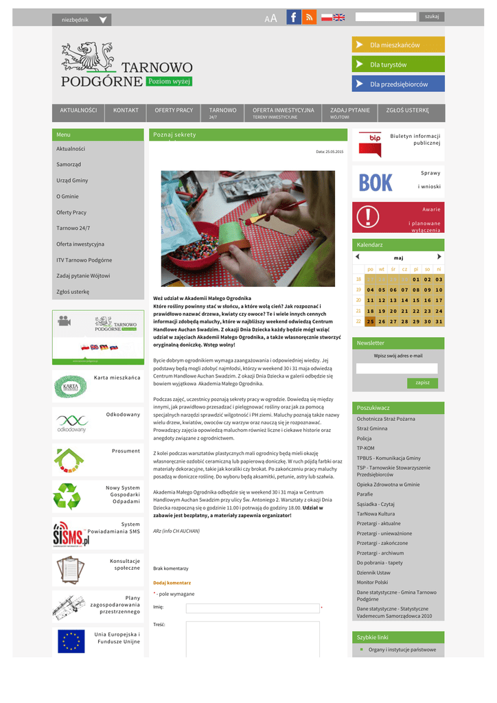 AA niezbędnik szukaj Dla mieszkańców Dla turystów Dla przedsiębiorców AKTUALNOŚCI KONTAKT Menu OFERTY PRACY TARNOWO OFERTA INWESTYCYJNA ZADAJ PYTANIE 24/7 TERENY INWESTYCYJNE WÓJTOWI ZGŁOŚ USTERKĘ Poznaj sekrety ogrodu! Aktualności Biuletyn informacji publicznej Data: 25.05.2015 Samorząd Sprawy Urząd Gminy i wnioski O Gminie Awarie Oferty Pracy i planowane wyłączenia Tarnowo 24/7 Oferta inwestycyjna Kalendarz maj ITV Tarnowo Podgórne po Zadaj pytanie Wójtowi Zgłoś usterkę Weź udział w Akademii Małego Ogrodnika Które rośliny powinny stać w słońcu, a które wolą cień? Jak rozpoznać i prawidłowo nazwać drzewa, kwiaty czy owoce? Te i wiele innych cennych informacji zdobędą maluchy, które w najbliższy weekend odwiedzą Centrum Handlowe Auchan Swadzim. Z okazji Dnia Dziecka każdy będzie mógł wziąć udział w zajęciach Akademii Małego Ogrodnika, a także własnoręcznie stworzyć oryginalną doniczkę. Wstęp wolny! Karta mieszkańca Odkodowany Prosument Nowy System Gospodarki Odpadami System Powiadamiania SMS śr cz pi so 19 04 05 06 07 08 09 10 20 11 12 13 14 15 16 17 21 18 19 20 21 22 23 24 22 25 26 27 28 29 30 31 Newsletter Wpisz swój adres e-mail zapisz Poszukiwacz Ochotnicza Straż Pożarna Straż Gminna Policja TP-KOM Z kolei podczas warsztatów plastycznych mali ogrodnicy będą mieli okazję własnoręcznie ozdobić ceramiczną lub papierową doniczkę. W ruch pójdą farbki oraz materiały dekoracyjne, takie jak koraliki czy brokat. Po zakończeniu pracy maluchy posadzą w doniczce roślinę. Do wyboru będą aksamitki, petunie, astry lub szałwia. TPBUS - Komunikacja Gminy TSP - Tarnowskie Stowarzyszenie Przedsiębiorców Opieka Zdrowotna w Gminie Akademia Małego Ogrodnika odbędzie się w weekend 30 i 31 maja w Centrum Handlowym Auchan Swadzim przy ulicy Św. Antoniego 2. Warsztaty z okazji Dnia Dziecka rozpoczną się o godzinie 11.00 i potrwają do godziny 18.00. Udział w zabawie jest bezpłatny, a materiały zapewnia organizator! Parafie Sąsiadka - Czytaj TarNowa Kultura Przetargi - aktualne ARz (info CH AUCHAN) Przetargi - unieważnione Przetargi - zakończone Przetargi - archiwum Konsultacje społeczne Plany zagospodarowania przestrzennego Do pobrania - tapety Brak komentarzy Dziennik Ustaw Dodaj komentarz Monitor Polski * - pole wymagane Dane statystyczne - Gmina Tarnowo Podgórne Imię: * Dane statystyczne - Statystyczne Vademecum Samorządowca 2010 Treść: Unia Europejska i Fundusze Unijne ni 27 28 29 30 01 02 03 Bycie dobrym ogrodnikiem wymaga zaangażowania i odpowiedniej wiedzy. Jej podstawy będą mogli zdobyć najmłodsi, którzy w weekend 30 i 31 maja odwiedzą Centrum Handlowe Auchan Swadzim. Z okazji Dnia Dziecka w galerii odbędzie się bowiem wyjątkowa Akademia Małego Ogrodnika. Podczas zajęć, uczestnicy poznają sekrety pracy w ogrodzie. Dowiedzą się między innymi, jak prawidłowo przesadzać i pielęgnować rośliny oraz jak za pomocą specjalnych narzędzi sprawdzić wilgotność i PH ziemi. Maluchy poznają także nazwy wielu drzew, kwiatów, owoców czy warzyw oraz nauczą się je rozpoznawać. Prowadzący zajęcia opowiedzą maluchom również liczne i ciekawe historie oraz anegdoty związane z ogrodnictwem. wt 18 Szybkie linki Organy i instytucje państwowe * Mapa Gminy Strony samorządowe Wpisz kod: * Stowarzyszenia i kluby amatorskie Powiat poznański Wyślij Zresetuj Ciekawostki 1 miejsce w Wielkopolsce dla Wójta. Wójt Tadeusz Czajka otrzymał tytuł Samorządowego Lidera Regionu w województwie wielkopolskim. Centrum Wspierania Organizacji Pozarządowych Decydujmy Razem Katalog firm Nagrody Gminy partnerskie Livani Bardo Fronreute Ukmerge Rohrdorf Salcininkai Cologno al Serio Noordenveld Strona Gminy Tarnowo Podgórne wykorzystuje pliki cookies do przechowywania informacji. Są one pomocne przy określeniu preferencji użytkownika oraz przy zbieraniu statystyk aktywności na Gmina Tarnowo Podgórne 2014 Projekt i bez zmian ustawień oznacza zgodę na użycie stronie. W każdej chwili można zablokować lub ograniczyć umieszczanie cookies w danej przeglądarce internetowej. Kontynuowanie przeglądania strony wykonanie cookies. Dowiedz się więcej Zamknij 25.05.