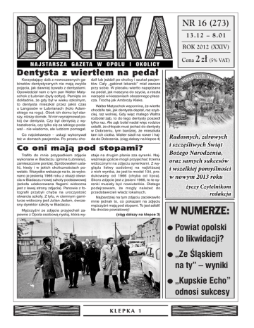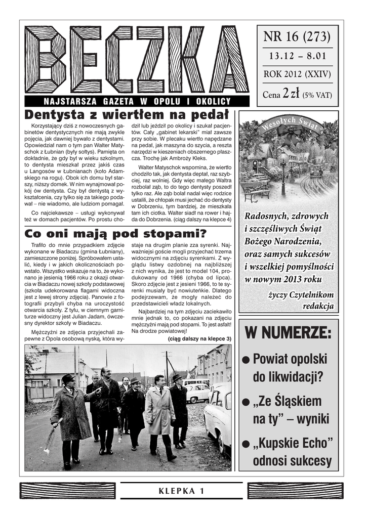 NR 16 (273) 13.12 – 8.01 ROK 2012 (XXIV) N A J S TA R S Z A G A Z E TA W O P O L U I O K O L I C Y Cena 2z∏ (5% VAT) Dentysta z wiert∏em na peda∏ Korzystajàcy dziÊ z nowoczesnych gabinetów dentystycznych nie majà zwykle poj´cia, jak dawniej bywa∏o z dentystami. Opowiedzia∏ nam o tym pan Walter Matyschok z ¸ubnian (by∏y so∏tys). Pami´ta on dok∏adnie, ˝e gdy by∏ w wieku szkolnym, to dentysta mieszka∏ przez jakiÊ czas u Langosów w ¸ubnianach (ko∏o Adamskiego na rogu). Obok ich domu by∏ starszy, ni˝szy domek. W nim wynajmowa∏ pokój ów dentysta. Czy by∏ dentystà z wykszta∏cenia, czy tylko si´ za takiego podawa∏ – nie wiadomo, ale ludziom pomaga∏. Co najciekawsze – us∏ugi wykonywa∏ te˝ w domach pacjentów. Po prostu cho- dzi∏ lub jeêdzi∏ po okolicy i szuka∏ pacjentów. Ca∏y „gabinet lekarski” mia∏ zawsze przy sobie. W plecaku wiert∏o nap´dzane na peda∏, jak maszyna do szycia, a reszta narz´dzi w kieszeniach obszernego p∏aszcza. Troch´ jak Ambro˝y Kleks. Walter Matyschok wspomina, ˝e wiert∏o chodzi∏o tak, jak dentysta depta∏, raz szybciej, raz wolniej. Gdy wi´c ma∏ego Waltra rozbola∏ zàb, to do tego dentysty poszed∏ tylko raz. Ale zàb bola∏ nadal wi´c rodzice ustalili, ˝e ch∏opak musi jechaç do dentysty w Dobrzeniu, tym bardziej, ˝e mieszka∏a tam ich ciotka. Walter siad∏ na rower i hajda do Dobrzenia. (ciàg dalszy na klepce 4) Co oni majà pod stopami? Trafi∏o do mnie przypadkiem zdj´cie wykonane w Biadaczu (gmina ¸ubniany), zamieszczone poni˝ej. Spróbowa∏em ustaliç, kiedy i w jakich okolicznoÊciach powsta∏o. Wszystko wskazuje na to, ˝e wykonano je jesienià 1966 roku z okazji otwarcia w Biadaczu nowej szko∏y podstawowej (szko∏a udekorowana flagami widoczna jest z lewej strony zdj´cia). Panowie z fotografii przybyli chyba na uroczystoÊç otwarcia szko∏y. Z ty∏u, w ciemnym garniturze widoczny jest Julian Jadam, ówczesny dyrektor szko∏y w Biadaczu. M´˝czyêni ze zdj´cia przyjechali zapewne z Opola osobowà nyskà, która wy- staje na drugim planie zza syrenki. Najwa˝niejsi goÊcie mogli przyjechaç trzema widocznymi na zdj´ciu syrenkami. Z wyglàdu listwy ozdobnej na najbli˝szej z nich wynika, ˝e jest to model 104, produkowany od 1966 (chyba od lipca). Skoro zdj´cie jest z jesieni 1966, to te syrenki musia∏y byç nowiuteƒkie. Dlatego podejrzewam, ˝e mog∏y nale˝eç do przedstawicieli w∏adz lokalnych. Najbardziej na tym zdj´ciu zaciekawi∏o mnie jednak to, co pokazani na zdj´ciu m´˝czyêni majà pod stopami. To jest asfalt! Na drodze powiatowej! (ciàg dalszy na klepce 3) W NUMERZE: ● Powiat opolski do likwidacji? ● „Ze Âlàskiem na ty” – wyniki ● „Kupskie Echo” odnosi sukcesy KLEPKA 1 FA K T Y* ● GUS zbada∏ w jaki odsetek firm korzysta z mo˝liwoÊci sk∏adania zamówieƒ przez sieç komputerowà. W 2010 Opolszczyzna mia∏a ostatnie miejsce w kraju. Tylko 10,2 proc. firm sk∏ada∏o zamówienia przez sieç komputerowà. Na pierwszym miejscu by∏o woj. mazowieckie (20,7 proc.). W 2011 wed∏ug GUS Opolszczyzna bardzo si´ poprawi∏a, bo za pomocà sieci komputerowej zamówienia sk∏ada∏o 15,2 proc. firm. Gorsze ni˝ Opolszczyzna by∏y ju˝ województwa Êwi´tokrzyskie (13,7) i podkarpackie (13,9). Najlepsze nadal by∏o mazowieckie (24,5). ● SpoÊród 27 paƒstw UE w III kwartale 2012 a˝ 14 odnotowa∏o spadek PKB w stosunku do III kwarta∏u 2011 – poinformowa∏ Eurostat. Najg∏´bszy spadek nastàpi∏ w Grecji (o 7,2 proc.), Portugalii (o 3,4 proc.) i S∏owenii (o 2,9 proc.). Kolejnych pi´ç paƒstw wykaza∏o wzrost mniejszy ni˝ jeden procent. Tylko pi´ç paƒstw odnotowa∏o wi´ksze wzrosty: Polska o 1,9 proc., S∏owacja o 2,5 proc., Litwa o 3,3 proc., Estonia o 3,4 proc. i ¸otwa o 5,3 proc. Brak danych dla trzech paƒstw. ● Chiny sà najwi´kszym na Êwiecie producentem jab∏ek. W 2010 zebra∏y ich 33,3 mln ton. Na drugim miejscu by∏y USA – 4,2 mln ton a dalej Turcja – 2,6 mln ton, W∏ochy – 2,2 mln ton i jako piàta Polska – 1,9 mln ton – informuje FAO. Chiny sà te˝ najwi´kszym producentem gruszek – 15,2 mln ton w 2010 (USA sà drugie z produkcjà 0,7 mln ton), Êliwek, brzoskwiƒ, nektaryn, grejfrutów i winogron, ale truskawki nie sà ich mocnà stronà (pierwsze miejsce nale˝y do USA, a Chin nie ma nawet w drugiej dziesiàtce). ● Stale roÊnie powierzchnia lasów w Polsce. W 1995 by∏o ich 8756 tys. hektarów a w 2011 ju˝ 9143 tys. hektarów. Najbardziej lesistym polskim województwem jest lubuskie, w którym 49,0 proc. powierzchni zajmujà lasy. Najmniej lesiste jest ∏ódzkie – lasy to 21,1 proc. powierzchni. Opolszczyzna, na której lasy to 26,5 proc. powierzchni, zajmuje 11 miejsce. * Wersja faktów obowiàzujàca w dniu zamkni´cia tego wydania „Beczki”. Powiat opolski do likwidacji? Na ciekawà publikacj´ trafi∏em w „Nowinach Nyskich” nr 48 z 27 listopada. Tekst zatytu∏owany by∏ „Niemodlin chce do Nysy”. Gmina Niemodlin nale˝y dziÊ do powiatu opolskiego i chyba êle si´ w nim czuje. Mieszkaƒcy tej gminy odnoszà wra˝enie, ˝e sà traktowani gorzej, bo nie sà gminà mniejszoÊci niemieckiej, a przecie˝ w powiecie opolskim mniejszoÊç niemiecka to wi´kszoÊç. W Niemodlinie twierdzà, ˝e choç le˝à bli˝ej Opola ni˝ Nysy, to do Nysy jadà krócej, bo droga jest lepsza. Widzà te˝ inne plusy Nysy. Burmistrz Niemodlina, Miros∏aw Stankiewicz twierdzi np., ˝e w nyskim starostwie za∏atwianie spraw jest szybsze ni˝ w opolskim. Widzi te˝ inne korzyÊci. Powiat opolski to 13 gmin wokó∏ Opola, ale bez Opola, bo ono jest oddzielnym powiatem. Nie brak opinii, ˝e to nie ma sensu i powiat opolski powinien byç jeden z Opolem w∏àcznie. DziÊ, gdy bud˝ety sà coraz bardziej napi´te, pomys∏ po∏àczenia Opola z powiatem opolskim mo˝e si´ komuÊ wydaç atrakcyjny. We w∏adzach cen- tralnych jest wsparcie dla idei 