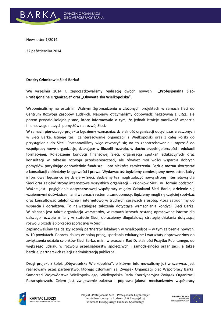 Newsletter 1/2014 22 października 2014 Drodzy Członkowie Sieci Barka! We wrześniu 2014 r. zapoczątkowaliśmy realizację dwóch nowych Profesjonalne Organizacje” oraz „Obywatelska Wielkopolska”. „Profesjonalna Sieć- Wspominaliśmy na ostatnim Walnym Zgromadzeniu o złożonych projektach w ramach Sieci do Centrum Rozwoju Zasobów Ludzkich. Najpierw otrzymaliśmy odpowiedź negatywną z CRZL, ale potem przyszło kolejne pismo, które informowało o tym, że jednak istnieje możliwość wsparcia finansowego naszych pomysłów na rozwój Sieci. W ramach pierwszego projektu będziemy wzmacniać działalność organizacji dotychczas zrzeszonych w Sieci Barka. Istnieje też zainteresowanie organizacji z Wielkopolski oraz z całej Polski do przystąpienia do Sieci. Postanowiliśmy więc otworzyć się na to zapotrzebowanie i zaprosić do współpracy nowe organizacje, działające w filozofii rozwoju, w duchu przedsiębiorczości i edukacji formacyjnej. Polepszenie kondycji finansowej Sieci, organizacja spotkań edukacyjnych oraz konsultacji w zakresie rozwoju przedsiębiorczości, ale również możliwości wsparcia dobrych pomysłów pozyskując odpowiednie fundusze – oto niektóre zamierzenia. Będzie można skorzystać z konsultacji z dziedziny księgowości i prawa. Wydawać też będziemy comiesięczny newsletter, który informował będzie co się dzieje w Sieci. Będziemy też mogli założyć nową stronę internetową dla Sieci oraz założyć strony internetowe wszystkich organizacji – członków Sieci, w formie podstron. Ważne jest pogłębienie dotychczasowej współpracy między Członkami Sieci Barka, dzielenie się wzajemnymi doświadczeniami w ramach systemu samopomocy. Będziemy mogli się częściej spotykać oraz konsultować telefonicznie i internetowo w trudnych sprawach z osobą, którą zatrudnimy do wsparcia i doradztwa. To najważniejsze założenia dotyczące wzmacniania kondycji Sieci Barka. W planach jest także organizacja warsztatów, w ramach których zostaną opracowane istotne dla dalszego rozwoju zmiany w statucie Sieci, opracujemy długofalową strategię działania dotyczącą rozwoju przedsiębiorczości społecznej w Sieci . Zaplanowaliśmy też dalszy rozwój partnerstw lokalnych w Wielkopolsce – w tym założenie nowych, w 10 powiatach. Poprzez dalszą wspólną pracę, spotkania edukacyjne i warsztaty doprowadzimy do zwiększenia udziału członków Sieci Barka, m.in. w pracach Rad Działalności Pożytku Publicznego, do większego udziału w rozwoju przedsiębiorstw społecznych i samodzielności organizacji, a także bardziej partnerskich relacji z administracją publiczną. Drugi projekt z kolei, „Obywatelska Wielkopolska”, o którym informowaliśmy już w czerwcu, jest realizowany przez partnerstwo, którego członkami są: Związek Organizacji Sieć Współpracy Barka, Samorząd Województwa Wielkopolskiego, Wielkopolska Rada Koordynacyjna Związek Organizacji Pozarządowych. Celem jest zwiększenie zakresu i poprawa jakości mechanizmów współpracy Projekt „Profesjonalna Sieć – Profesjonalne Organizacje” współfinansowany ze środków Unii Europejskiej w ramach Europejskiego Funduszu Społecznego administracji publicznej z organizacjami pozarządowymi w wielkopolskich jednostkach samorządu terytorialnego. W ramach projektu odbędą się, m.in. konferencje upowszechniające Model Współpracy Administracji Publicznej i Organizacji Pozarządowych oraz szkolenia. Ponadto odbędą się seminaria nt. integracji sektora organizacji obywatelskich, wyjazdy studyjne dla przedstawicieli administracji publicznej i organizacji obywatelskich, a także doradztwo indywidualne w zakresie wdrażania Modelu Współpracy Administracji Publicznej i Organizacji Pozarządowych. Francusko polski projekt pilotażowy na rzecz rozwoju przedsiębiorczości w owczarstwie We wrześniu br. podczas obchodów 25-lecia Barki, w Chudobczycach, podpisane zostało porozumienie między organizacją owczarzy francuskich Races Ovines des Massifs i Fundacją Barka, w zakresie rozwoju francuskich ras owiec w Polsce poprzez rozwijanie ich hodowli we współpracy z kolejnymi, polskimi Wspólnotami Lokalnymi. W wyniku tego owczarze francuscy skierowali list do Ministra Rolnictwa Francji podkreślając profesjonalizm i rzetelność Barki w dotychczasowej hodowli owcy Rasy Białej z Masywu Centralnego. Związek francuski Races Ovines des Massifs chce, by w polskich Wspólnotach Lokalnych rozwijała się hodowla sześciu ras francuskich, a długoletnia współpraca z Barką, jest gwarancją dla Francuzów, że odbędzie się to zgodnie z ich zasadami prowadzenia hodowli oraz inżynierii genetycznej. Projekt ma za zadanie stworzenie nowych miejsc pracy oraz podniesienie ekonomiki i jakości produkcji owiec w Polsce. Współpraca pomiędzy francuskimi hodowcami, a Fundacją Barka w Wielkopolsce trwa od 14 lat ; obecnie przybrała ona charakter formalnego partnerstwa z udziałem instytucji rządowych w Polsce i we Francji. Wielkopolskie Centrum Ekonomii Solidarnej i nowe Spółdzielnie Socjalne Fundacja Pomocy Wzajemnej Barka wraz partnerem Centrum PISOP realizuje od stycznia 2013 roku do czerwca 2015 roku projekt „Wielkopolskie Centrum Ekonomii Solidarnej”. Ekonomia społeczna to jeden ze sposobów określenia działalności gospodarczej, która łączy w sobie cele społeczne i ekonomiczne. Do podmiotów ekonomii społecznej zalicza się: organizacje pozarządowe, spółdzielnie, spółdzielnie socjalne, warsztaty terapii zajęciowej, centra integracji społecznej, kluby integracji społecznej, zakłady aktywności zawodowej, towarzystwa ubezpieczeń wzajemnych. Zadaniem Wielkopolskiego Centrum Ekonomii Solidarnej jest tworzenie przyjaznego klimatu do rozwoju ekonomii społecznej i zatrudnionych, dzięki temu, osób. Projekt realizowany jest w tzw. subregionie poznańskim (tj. na terenie m. Poznania oraz powiatów gnieźnieńskiego, grodziskiego, międzycho