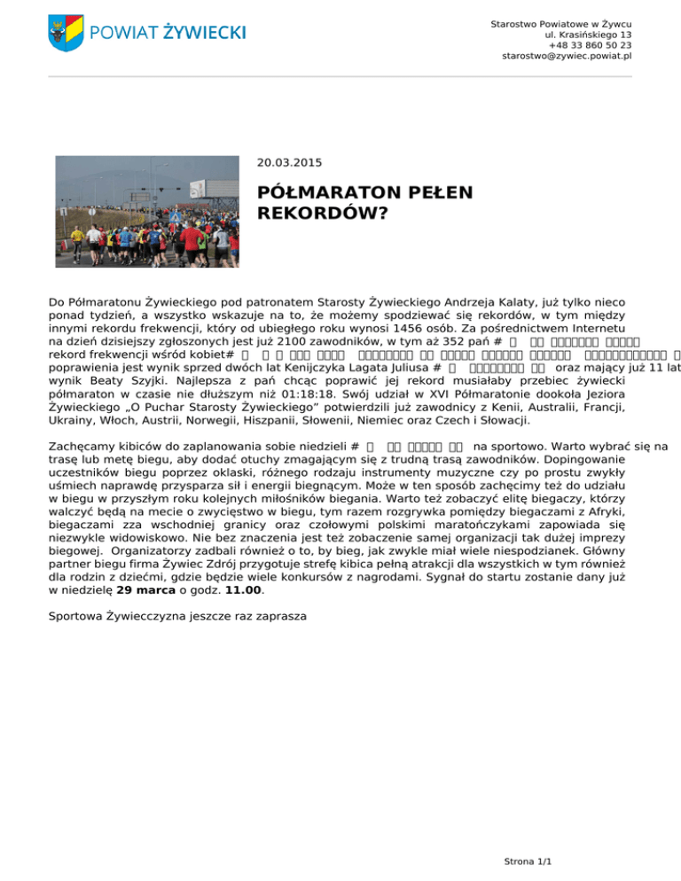 Starostwo Powiatowe w Żywcu ul. Krasińskiego 13 +48 33 860 50 23 [email protected] 20.03.2015 PÓŁMARATON PEŁEN REKORDÓW? Do Półmaratonu Żywieckiego pod patronatem Starosty Żywieckiego Andrzeja Kalaty, już tylko nieco ponad tydzień, a wszystko wskazuje na to, że możemy spodziewać się rekordów, w tym między innymi rekordu frekwencji, który od ubiegłego roku wynosi 1456 osób. Za pośrednictwem Internetu na dzień dzisiejszy zgłoszonych jest już 2100 zawodników, w tym aż 352 pań #℣佐⌡⌀琀漀 爀眀渀椀攁簀 戀礁䈀戀y rekord frekwencji wśród kobiet#℣䍐⌡⌀⸀ 䄀 挀稀礀 瀀愀搀渁Ԁ 爀攀欀漀爀搀礀Ⰰ 渀愀 欀琀爀攀 欀椀戀椀挀攀 挀稀攀欀愀樁Ԁ 渀愀樀戀愀爀搀稀椀攀樀㼀 䐀 poprawienia jest wynik sprzed dwóch lat Kenijczyka Lagata Juliusa #℣佐⌡⌀ 㨀 㘀㨀㠀⌡⍃倣℣ oraz mający już 11 lat wynik Beaty Szyjki. Najlepsza z pań chcąc poprawić jej rekord musiałaby przebiec żywiecki półmaraton w czasie nie dłuższym niż 01:18:18. Swój udział w XVI Półmaratonie dookoła Jeziora Żywieckiego „O Puchar Starosty Żywieckiego” potwierdzili już zawodnicy z Kenii, Australii, Francji, Ukrainy, Włoch, Austrii, Norwegii, Hiszpanii, Słowenii, Niemiec oraz Czech i Słowacji. Zachęcamy kibiców do zaplanowania sobie niedzieli #℣佐⌡⌀㈀㤀 洀愀爀挀愀⌡⍃倣℣ na sportowo. Warto wybrać się na trasę lub metę biegu, aby dodać otuchy zmagającym się z trudną trasą zawodników. Dopingowanie uczestników biegu poprzez oklaski, różnego rodzaju instrumenty muzyczne czy po prostu zwykły uśmiech naprawdę przysparza sił i energii biegnącym. Może w ten sposób zachęcimy też do udziału w biegu w przyszłym roku kolejnych miłośników biegania. Warto też zobaczyć elitę biegaczy, którzy walczyć będą na mecie o zwycięstwo w biegu, tym razem rozgrywka pomiędzy biegaczami z Afryki, biegaczami zza wschodniej granicy oraz czołowymi polskimi maratończykami zapowiada się niezwykle widowiskowo. Nie bez znaczenia jest też zobaczenie samej organizacji tak dużej imprezy biegowej. Organizatorzy zadbali również o to, by bieg, jak zwykle miał wiele niespodzianek. Główny partner biegu firma Żywiec Zdrój przygotuje strefę kibica pełną atrakcji dla wszystkich w tym również dla rodzin z dziećmi, gdzie będzie wiele konkursów z nagrodami. Sygnał do startu zostanie dany już w niedzielę 29 marca o godz. 11.00. Sportowa Żywiecczyzna jeszcze raz zaprasza Strona 1/1 Powered by TCPDF (www.tcpdf.org)