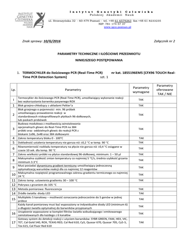 I n s t y t u t G e n e t y k i C z ł o w i e k a Polskiej Akademii Nauk _______________________________________________________________________ ul. Strzeszyńska 32 * 60-479 Poznań * tel. +48 61 6579263 fax +48 61 8233235 NIP: 781 174 57 37 www.igcz.poznan.pl Znak sprawy: 10/G/2016 Załącznik nr 2 PARAMETRY TECHNICZNE I ILOŚCIOWE PRZEDMIOTU NINIEJSZEGO POSTĘPOWANIA 1. TERMOCYKLER do ilościowego PCR (Real-Time PCR) nr kat. 1855196EM5 [CFX96 TOUCH RealTime PCR Detection System] szt. 1 Lp. I 1 2 3 Parametry Termocykler do ilościowego PCR (Real-Time PCR), umożliwiający wykonanie reakcji bez wykorzystania barwnika pasywnego ROX Blok grzejno-chłodzący z układami Peltier’a Blok grzejnego o pojemności min. 96 próbek umożliwiający prowadzenie reakcji w standardowych niskoprofilowych płytkach 96-dołkowych, lub paskach probówek Budowa modułowa z możliwością zainstalowania opcjonalnych głowic do Real-Time PCR na 384 próbki oraz oddzielnych głowic do reakcji PCR z blokami 1x96, 2x48 oraz 384 dołkowymi Zakres temperatury bloku 0 - 100°C 4 5 Dokładność ustalenia temperatury nie gorsza niż 0,2 C w temp. 90 C Równomierność rozkładu temperatury na płycie nie gorsza niż 0,4 C osiągane w 6 czasie 10 sek. dla temp. 90 C 7 Zakres wielkości próbki na płytce standardowej 96-dołkowej, minimum: 1 – 50 µl 8 9 10 Maksymalna szybkość zmian temperatury co najmniej 5 °C/s, średnia szybkość grzania minimum 3.3C Musi posiadać dynamiczny gradient termiczny umożliwiający jednoczesną optymalizację warunków reakcji dla co najmniej 12 reagentów Maksymalna rozpiętość programowalnego zakresu gradientu termicznego co najmniej 24 °C Zakres temp. ustawienia gradientu 30 – 100 C 11 12 Pokrywa z grzaniem do 105 C 13 Metoda pomiarowa: fluorescencja 14 Źródło światła: diody LED 15 16 17 Multipleks 5 kanałowy – możliwość oznaczania jednocześnie do 5 genów w jednej próbce Każdy kanał pomiarowy musi być wyposażony w indywidualne diody LED (minimum 6) o długości światła optymalnej do barwników przypisanych Urządzenie wyposażone w komplet filtrów światła wzbudzającego i emitowanego zainstalowanych dla każdego z 6 kanałów Gotowy system do detekcji reakcji z użyciem barwników: SYBR GREEN, FAM, HEX, VIC, TET, Cal Gold 540, ROX, TEXAS RED, Cal Red 610, Cy5, Quasar 670, Quasar 705, Cy5-5, Tex 615, Cal Fluor Red 610 Parametry wymagane TAK TAK TAK TAK TAK TAK TAK TAK TAK TAK TAK TAK TAK TAK TAK TAK TAK TAK Parametry oferowane TAK / NIE 18 Dodatkowy kanał dostosowany do techniki FRET (wzbudzenie FAM, detekcja HEX) TAK Kilka trybów rejestracji danych w tym opcja szybkiego pomiaru dla pojedynczego 19 kanału TAK Możliwość programowania płytki doświadczalnej przed, w trakcie lub po zakończeniu 20 pomiaru 21 Wyświetlacz z podglądem postępu przyrostu produktów reakcji PCR 22 Programowanie reakcji z panelu sterującego jak i z komputera PC 23 Połączenie do komputera poprzez port USB 2.0 TAK TAK TAK TAK Nielicencjonowane Oprogramowanie zapewniające akwizycję i obróbkę wyników z 24 możliwością instalacji na wielu komputerach 25 Tworzenie krzywej kalibracyjnej umożliwiającej oznaczania ilościowe 26 Analiza krzywej topnienia TAK TAK TAK Analiza względnego stężenia DNA „gene expression” poprzez pomiar CT lub CT z 27 wieloma genami referencyjnymi TAK Możliwość jednoczesnej analizy ekspresji genów dla próbek pochodzących z różnych 28 pomiarów. Opcja „gene study” do jednoczesnej analizy wyników badania ekspresji TAK genów pochodzących z różnych reakcji qPCR (tzw. Łączenie płytek podczas analizy) Analiza z zaprogramowanym punktem końcowym pomiaru „end-point” TAK 29 30 Analiza alleli (dyskryminacja alleli) TAK Możliwość eksportu zapisanych wyników analiz do innych aplikacji (Microsoft Excel, 31 Word, PowerPoint) TAK Oprogramowanie analizy krzywych topnienia wysokiej rozdzielczości (HRM) 32 umożliwiająca analizę SNP , posiadające funkcję shiftu temperaturowego krzywych 33 34 topnienia– licencja dwustanowiskowa Dodatkowa licencja na oprogramowanie do analizy genów referencyjnych qbase Plus dostarczana wraz z systemem Serwis gwarancyjny i pogwarancyjny urządzenia na terenie Polski wraz z czasem reakcji do 2 dni od momentu zgłoszenia awarii 37 Gwarancja na okres 24 miesięcy. 1. 2. 3. 4. TAK TAK TAK 2. JEDNOSTKA STERUJĄCA – laptop DELL V3558 Lp. TAK Parametry Procesor Klasa procesora Intel Core i3 Mobile Kod procesora i3-4005U Prędkość procesora 1,7 GHz Częstotliwość szyny QPI/DMI 5 GT/s Pojemność pamięci podręcznej 3 MB Technologia Hyperthreading Tak Technologia Intel vPro No Technologia Intel Wireless Display (WiDi) Obsługa pamięci masowych Rodzaj dysku Standardowy (nośnik magnetyczny) Pojemność dysku (HDD) 1 TB Prędkość obrotowa silnika 5400 obr./min Napędy wbudowane (zainstalowane) DVD±RW Pamięć Zainstalowana pamięć 4096 MB Rodzaj pamięci SODIMM DDR3L Częstotliwość szyny pamięci 1600 MHz Maksymalna wielkość pamięci 16384 MB Ilość banków pamięci 2 szt. Ilość wolnych banków pamięci 1 szt. Wyświetlacz LCD Przekątna ekranu LCD 15,6 cali szt. 1 Parametr wymagany TAK TAK TAK TAK Parametr oferowany 5. 6. 7. 8. 9. 10. Typ ekranu TFT HD [LED] AntiGlare Ekran dotykowy No Maksymalna rozdzielczość LCD 1366 x 76 Wbudowane układy Typ karty graficznej Intel HD Graphics 4400 Dodatkowe informacje n/t zainst. pamięci Przydzielana dynamicznie Karta dźwiękowa Zintegrowana/y Urządzenia wskazujące TouchPad Klawiatura numeryczna Interfejsy / Komunikacja Złącza zewn. • 1x USB 3.0 • 2x USB 2.0 • 1x 15-stykowe D-Sub (wyjście na monitor) • 1x RJ-45 (LAN) • 1x połączone wejście słuchawkowe i mikrofonowe • 1x DC-In (wejście zasilania) Bezprzewodowa karta sieciowa Tak Chipset bezprzewodowej karty sieciowej Intel Centrino Wireless-AC 3160 Typ bezprzewodowej karty sieciowej IEEE 802.11a/b/g/n/ac Bluetooth Tak Zainstalowany moduł WWAN/3G Nie Łączno