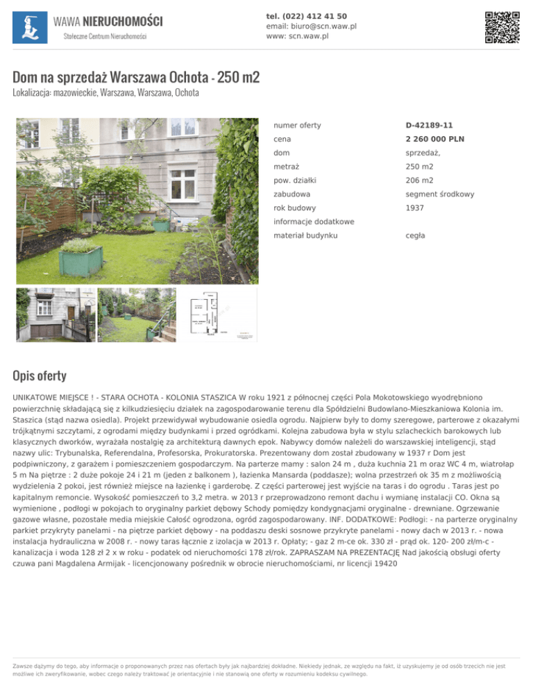 tel. (022) 412 41 50 email: [email protected] www: scn.waw.pl Dom na sprzedaż Warszawa Ochota - 250 m2 Lokalizacja: mazowieckie, Warszawa, Warszawa, Ochota numer oferty D-42189-11 cena 2 260 000 PLN dom sprzedaż, metraż 250 m2 pow. działki 206 m2 zabudowa segment środkowy rok budowy 1937 informacje dodatkowe materiał budynku cegła Opis oferty UNIKATOWE MIEJSCE ! - STARA OCHOTA - KOLONIA STASZICA W roku 1921 z północnej części Pola Mokotowskiego wyodrębniono powierzchnię składającą się z kilkudziesięciu działek na zagospodarowanie terenu dla Spółdzielni Budowlano-Mieszkaniowa Kolonia im. Staszica (stąd nazwa osiedla). Projekt przewidywał wybudowanie osiedla ogrodu. Najpierw były to domy szeregowe, parterowe z okazałymi trójkątnymi szczytami, z ogrodami między budynkami i przed ogródkami. Kolejna zabudowa była w stylu szlacheckich barokowych lub klasycznych dworków, wyrażała nostalgię za architekturą dawnych epok. Nabywcy domów należeli do warszawskiej inteligencji, stąd nazwy ulic: Trybunalska, Referendalna, Profesorska, Prokuratorska. Prezentowany dom został zbudowany w 1937 r Dom jest podpiwniczony, z garażem i pomieszczeniem gospodarczym. Na parterze mamy : salon 24 m , duża kuchnia 21 m oraz WC 4 m, wiatrołap 5 m Na piętrze : 2 duże pokoje 24 i 21 m (jeden z balkonem ), łazienka Mansarda (poddasze); wolna przestrzeń ok 35 m z możliwością wydzielenia 2 pokoi, jest również miejsce na łazienkę i garderobę. Z części parterowej jest wyjście na taras i do ogrodu . Taras jest po kapitalnym remoncie. Wysokość pomieszczeń to 3,2 metra. w 2013 r przeprowadzono remont dachu i wymianę instalacji CO. Okna są wymienione , podłogi w pokojach to oryginalny parkiet dębowy Schody pomiędzy kondygnacjami oryginalne - drewniane. Ogrzewanie gazowe własne, pozostałe media miejskie Całość ogrodzona, ogród zagospodarowany. INF. DODATKOWE: Podłogi: - na parterze oryginalny parkiet przykryty panelami - na piętrze parkiet dębowy - na poddaszu deski sosnowe przykryte panelami - nowy dach w 2013 r. - nowa instalacja hydrauliczna w 2008 r. - nowy taras łącznie z izolacja w 2013 r. Opłaty; - gaz 2 m-ce ok. 330 zł - prąd ok. 120- 200 zł/m-c kanalizacja i woda 128 zł 2 x w roku - podatek od nieruchomości 178 zł/rok. ZAPRASZAM NA PREZENTACJĘ Nad jakością obsługi oferty czuwa pani Magdalena Armijak - licencjonowany pośrednik w obrocie nieruchomościami, nr licencji 19420 Zawsze dążymy do tego, aby informacje o proponowanych przez nas ofertach były jak najbardziej dokładne. Niekiedy jednak, ze względu na fakt, iż uzyskujemy je od osób trzecich nie jest możliwe ich zweryfikowanie, wobec czego należy traktować je orientacyjnie i nie stanowią one oferty w rozumieniu kodeksu cywilnego. tel. (022) 412 41 50 email: [email protected] www: scn.waw.pl Lokalizacja Osoba kontaktowa Zofia Grzybek województwo mazowieckie powiat Warszawa [email protected] miasto Warszawa dzielnica Ochota Chętnie udzielę dodatkowych informacji związanych z tą ofertą. Zapraszam do kontaktu! tel. 725 56 56 05 Zawsze dążymy do tego, aby informacje o proponowanych przez nas ofertach były jak najbardziej dokładne. Niekiedy jednak, ze względu na fakt, iż uzyskujemy je od osób trzecich nie jest możliwe ich zweryfikowanie, wobec czego należy traktować je orientacyjnie i nie stanowią one oferty w rozumieniu kodeksu cywilnego.