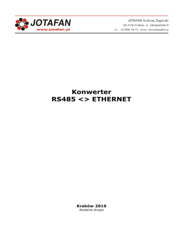 Konwerter RS485 <> ETHERNET Kraków 2016 Wydanie drugie 1. Opis ogólny Urządzenie umożliwia konwersję pomiędzy interfejsem RS485, a interfejsem Ethernet z galwaniczną separacją sygnałów. Kierunek transmisji na linii RS485 wybierany jest automatycznie (autodetekcja nadawania). Możliwy jest wybór prędkości transmisji (poprzez interfejs RS485) w zakresie od 115200 do 230400 bodów (inne prędkości na zamówienie). 2. Dane techniczne Szybkość transmisji: 115 200 ... 230 400 bodów Przełączanie kierunku transmisji RS485: Zasilanie: automatyczne 8..16VDC (max. 120mA) Sygnalizacja (diody LED): Gabaryty (bez przepustów, w mm, dł. × wys. × szer.): IO, TX, RX, PWR 160 × 80 × 58 Rys.1 Wygląd płyty konwertera wewnątrz obudowy 3. Lampki sygnalizacyjne W celu kontroli poprawności pracy urządzenie wyposażone jest w 6 lampek sygnalizacyjnych. Dwie lampki znajdują się przy gnieździe RJ-45 i oznaczają: ŻÓŁTA – sygnalizuje połączenie w sieci Ethernet ZIELONA – miga podczas transmisji w sieci Ethernet Pozostałe cztery znajdują się na płytce urządzenia i oznaczają: IO - kolor czerwony, sygnalizuje aktywność wyjścia GPIO1 modułu RX Ethernet - kolor zielony, zapala się w trakcie transmisji RS485 -> TX - kolor czerwony, zapala się w trakcie transmisji Ethernet -> RS485 PWR - kolor żółty, sygnalizuje zasilanie urządzenia 4. Opis wyprowadzeń - podłączenie urządzenia Wyprowadzenia na kostce zaciskowej (RS485): B– transmisja danych TRx- (zacisk B lub NET-) A+ – transmisja danych TRx+ (zacisk A lub NET+) +12V – potencjał dodatni zasilania 0V – potencjał odniesienia dla linii interfejsu RS485 EKR – ekran przewodu transmisyjnego W celu podłączenia urządzenia należy otworzyć jego obudowę odkręcając cztery śruby w pokrywie. Przewody należy wprowadzić przez przepusty kablowe, przy czym przewód Ethernet (bez wtyku) zaleca się wprowadzić przez większy z nich (PG-11), a przewód RS485 przez mniejszy (PG-9). Po ich wprowadzeniu przewód Ethernet należy zakończyć wtykiem RJ-45 i podłączyć do gniazda na płycie konwertera. Przewód RS485 zakończyć tulejkami kablowymi i podłączyć zgodnie z opisem do kostki zaciskowej. 5. Konfiguracja Ethernet urządzenia do pracy w sieci Konfiguracji urządzenia dokonuje się za pośrednictwem sieci Ethernet z wykorzystaniem dołączonego oprogramowania Digi_Discovery.exe i dowolnej przeglądarki internetowej (użytkownik: root, hasło: dbps). Szczegółowy opis konfiguracji znajduje się w pliku Konfiguracja sieci dla wgj-8.pdf na dołączonej płycie CD.
