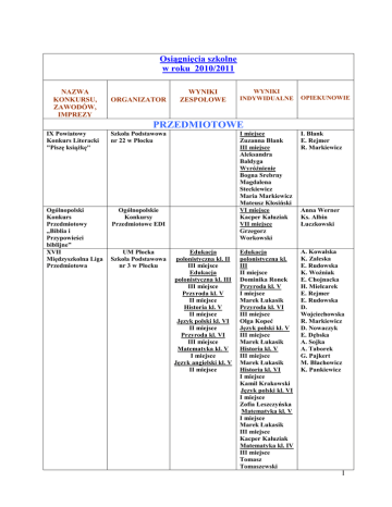 Osiągnięcia szkolne w roku 2010/2011 NAZWA KONKURSU, ZAWODÓW, IMPREZY ORGANIZATOR WYNIKI ZESPOŁOWE WYNIKI INDYWIDUALNE OPIEKUNOWIE PRZEDMIOTOWE IX Powiatowy Konkurs Literacki "Piszę ksiąŜkę" Szkoła Podstawowa nr 22 w Płocku Ogólnopolski Konkurs Przedmiotowy „Biblia i Przypowieści biblijne” XVII Międzyszkolna Liga Przedmiotowa Ogólnopolskie Konkursy Przedmiotowe EDI UM Płocka Szkoła Podstawowa nr 3 w Płocku I miejsce Zuzanna Blank III miejsce Aleksandra Bałdyga WyróŜnienie Bogna Srebrny Magdalena Steckiewicz Maria Markiewicz Mateusz Kłosiński VI miejsce Kacper Kałuziak VII miejsce Grzegorz Workowski Edukacja polonistyczna kl. II III miejsce Edukacja polonistyczna kl. III III miejsce Przyroda kl. V II miejsce Historia kl. V II miejsce Język polski kl. VI II miejsce Przyroda kl. VI III miejsce Matematyka kl. V I miejsce Język angielski kl. V II miejsce Edukacja polonistyczna kl. III II miejsce Dominika Ronek Przyroda kl. V I miejsce Marek Łukasik Przyroda kl. VI III miejsce Olga Kopeć Język polski kl. V III miejsce Marek Łukasik Historia kl. V III miejsce Marek Łukasik Historia kl. VI I miejsce Kamil Krakowski Język polski kl. VI I miejsce Zofia Leszczyńska Matematyka kl. V I miejsce Marek Łukasik III miejsce Kacper Kałuziak Matematyka kl. IV III miejsce Tomasz Tomaszewski I. Blank E. Rejmer R. Markiewicz Anna Werner Ks. Albin Łuczkowski A. Kowalska K. Zaleska E. Rudowska K. Woźniak E. Chojnacka H. Mielcarek E. Rejmer E. Rudowska D. Wojciechowska R. Markiewicz D. Nowaczyk E. Dębska A. Sojka A. Taborek G. Pajkert M. Błachowicz K. Pankiewicz 1 Multimedialny Konkurs Informatyczny „Taki jestem” Szkoła Podstawowa nr 22 w Płocku Ogólnopolska Olimpiada „Olimpus” Komitet Organizacyjny w Warszawie Ogólnopolski Konkurs Ekologiczny EKOPLANETA Komitet Organizacyjny w Warszawie - Międzyszkolny Konkurs JęzykowoInformatyczny „The British Royal Family” Konkurs „English easy” II Prywatna Szkoła Podstawowa ZOK „Profesor” w Płocku - III Międzyszkolny Konkurs JęzykowoInformatyczny „The British Royal Family” Ogólnopolski Konkurs Języka Angielskiego MIX 2011 British School Centrum Edukacji Szkolnej Warszawa - Język angielski kl. V II miejsce Katarzyna Wójkowska III miejsce Monika Wiewiórowska III miejsce Aleksandra Gościcka WyróŜnienie Michał Listopad Karolina Zaborska Laureaci – język polski Dominika Dzieńkowska Monika Wiewiórowska Oliwia Barańska Anna Raciniewska Kamil Szymczak Paula Franke Malwina Niewielska Karolina Figas WyróŜnienie za bardzo dobry wynik Monika Wiewiórowska Aleksandra Magnuszewska II miejsce Paula Franke I . Blank C. Piórkowski E. Dębska I. Kołodziejska E. Rudowska R. Markiewicz A. Sosnowska E. Chojnacka R. Bukowska M. Krystek C. Piórkowski II miejsce Klaudia Smulewicz WyróŜnienia Szymon Magierski Weronika Kalwasińska II miejsce Paula Franke J. Omińska V miejsce Dominika Dzieńkowska IX miejsce Tomasz Tomaszewski XII miejsce M. Błachowicz K. Pankiewicz A. Bielińska A. Boduch 2 Konkurs recytatorski „Pięknie być człowiekiem” – etap rejonowy Międzyszkolny Konkurs „Obudźmy wyobraźnię” Monika Wiewiórowska Ksawery Rychlicki XIII miejsce Natalia Krajewska Paweł Winiarek XIV miejsce Julia Walczak WyróŜnienie Zuzanna Blank MDK w Płocku SP 23 w Płocku III miejsce Agnieszka Synakowska Agnieszka Domagała Kamil Szymczak E. Rejmer Sosnowska A. SPORTOWE Współzawodnictwo Sportowe Szkół Podstawowych w roku szkolnym 2009/2010 Płocka Międzyszkolna Liga Młodzików Badmintona Turniej siatkówki dziewcząt w ramach kampanii "Zachowaj trzeźwy umysł" Płockie Igrzyska MłodzieŜy Szkolnej Sztafetowe Biegi Przełajowe XIX Bieg Tumski XVI Bieg Andrzejkowy XVI Jesienne Biegi Przełajowe z okazji Dnia Niepodległości UM Płocka SZS III miejsce Nagroda Prezydenta Miasta Płocka - nauczyciele wychowania fizycznego UKS "70" SMS UM Płocka VI miejsce - Szkoła Podstawowa nr 3 w Płocku II miejsce trener badmintona Małgorzata Sroka M. Parzuch MZOS Płock III miejsce dziewcząt - B. Samecka J. Grzywińska I miejsce Adrian Szczutowski IV miejsce Dominika Dzieńkowska Maciej Staś II miejsce Maciej Staś Dominika Dzieńkowska V miejsce Dorian Brągalski Klaudia Dziewanowska II miejsce Maciej Staś Adrian Szczutowski J. Grzywińska B. Samecka MZOS Płock MZOS Płock Szkoła Podstawowa w Podgórzu UKS „Borowik” J. Grzywińska B. Samecka J. Grzywińska B. Samecka 3 III miejsce Dominika Dzieńkowska Płockie Igrzyska MłodzieŜy Szkolnej Cztery Ognie Usportowione II Mazowiecki Turniej Minisiatkówki Volley Płock Mini Liga MZOS Płock IV miejsce śyrardów I miejsce II miejsce w kategorii dwójek siatkarskich II, III miejsce w kat. klas III I, III, IV, V miejsce w kat. klas IV III miejsce sztafeta chłopców Szkoła Podstawowa nr 22 w Płocku Volley Płock Zawody Pływackie o Puchar Starosty Ciechanowskiego III Grand Prix w Pływaniu o Puchar Viktorii Józefów Płocka Liga Pływacka Pływacki Związek Sportowy Okręgowa Liga Pływacka Warszawy i Mazowsza rocznik 1998 Otwarte Mistrzostwa Warszawy w pływaniu Pływacki Związek Sportowy Pływacki Związek Sportowy Pływacki Związek Sportowy A. Kruszewska M. Parzuch Olga Kinalskanajlepsza zawodniczka turnieju M. Parzuch I miejsce Piotr Sternak II miejsce Szymon Bregier Leonard Jędrycha Dominika Kowalska III miejsce Igor Makowski Michał Porwat Zofia Leszczyńska II miejsce Piotr Sternak J. Szyczkow P. Suliński J. Szyczkow P. Suliński I miejsce Dominika Kowalska Szymon Bregier Piotr Sternak Michał Porwat II miejsce Piotr Sternak Igor Makowski Natalia Szczepańska III miejsce Natalia Szczepańska szymon Bregier Dominika Dziewikowska Mateusz Piątkiewicz II miejsce III miejsce Piotr Sternak J. Szyczkow P. Suliński II miejsce Piotr Sternak Dominika Kowalska III miejsce Zofia Leszczyńska Dominika J. Szyczkow P. Suliński J. Szyczkow P. Suliński 4 Kowalska Międzyszkolne Zawody Sportowe „Wspinka 2010” Mikołajkowy Turniej Mini siatków