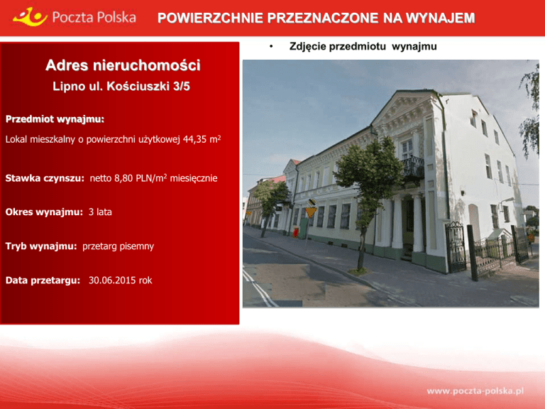 POWIERZCHNIE PRZEZNACZONE NA WYNAJEM - Adres nieruchomości Lipno ul. Kościuszki 3/5 Przedmiot wynajmu: Lokal mieszkalny o powierzchni użytkowej 44,35 m2 Stawka czynszu: netto 8,80 PLN/m2 miesięcznie Okres wynajmu: 3 lata Tryb wynajmu: przetarg pisemny Data przetargu: 30.06.2015 rok • Zdjęcie przedmiotu wynajmu Kliknij i zlokalizuj na mapie Opis przedmiotu wynajmu: • Pokoje • Toaleta i kuchnia Lokal mieszkalny usytuowany jest na 1 piętrze budynku stanowiącego własność Poczty Polskiej S.A. Składa się z 3 izb o łącznej powierzchni użytkowej 44,35 m², w tym powierzchni pokoi 33,49 m² (1 pokój 21,46 m², 2 pokój 12,03 m²), kuchni 8,09 m², łazienki z wc 2,77 m². Lokal wyposażony jest w instalacje: elektryczną, wodnokanalizacyjną, c.o. System centralnego ogrzewania – wspólna kotłownia na olej opałowy. W pomieszczeniach lokalu zamontowane są grzejniki panelowe żeberkowe. Stolarka okienna drewniana, oszklenie pełne. Drzwi wejściowe w stanie dobrym. Podłogi – w pokojach panele, w łazience i kuchni terakota. Lokal wyposażony w licznik energii elektrycznej. Ogólny stan techniczny określić można jako dobry. Opis nieruchomości: Miejscowość Lipno Ulica, nr budynku Kościuszki 3/5 Powierzchnia budynku, w których zlokalizowany jest przedmiot wynajmu 1163,10 m² Nr działki ewidencyjnej, obręb 1299/8, Lipno Księga wieczysta, Sąd Rejonowy, Nr Wydziału WL1L/00013848/6, prowadzoną przez Sąd Rejonowy w Lipnie, V Wydział Ksiąg Wieczystych w Lipnie. Stan prawny gruntu Użytkowanie wieczyste Poczty Polskiej S.A. Lokalizacja i dostępność komunikacyjna: Nieruchomość położona jest w m. Lipno, przy ul. Kościuszki 3/5 w województwie kujawsko-pomorskim, w powiecie lipnowskim. Miasto jest siedzibą gminy miejsko-wiejskiej, położone w odległości ok. 20 km do Włocławka i 50 km do Torunia. Gmina systematycznie rozwija się o czym świadczyć może ciągle rosnąca liczba osób, która decyduje się zamieszkać na terenie Gminy Lipno oraz zadowoleni mieszkańcy. Nieruchomość położona jest w centralnej części miejscowości. Bezpośrednie otoczenie nieruchomości stanowi zabudowa mieszkaniowa wielorodzinna, przychodnia lekarska, punkty usługowo-handlowe. W obrębie nieruchomości znajduje się Urząd Pocztowy. Miejscowość ma bezpośrednie połączenie z miastem Włocławek, Toruń i Warszawa poprzez komunikację miejską i komunikację prywatną (busy). • Mapa sytuacyjna miejscowości Opis nieruchomości: Nieruchomość zabudowana jest budynkiem głównym usługowo-mieszkalnych. OBWIESZCZENIE O PRZETARGU NA WYNAJEM LOKALU MIESZKALNEGO Wynajmujący: POCZTA POLSKA S.A. z siedzibą w Warszawie, 00-940 Warszawa, ul. Stawki 2. Prowadzący przetarg: Poczta Polska S.A., Pion Infrastruktury, Obszar Operacyjny ds. Nieruchomości w Gdańsku, ul. Targ Rakowy 7/8, 80-940 Gdańsk. Miejsce przeprowadzenia przetargu: Poczta Polska S.A. Pion Infrastruktury, Dział Administrowania Nieruchomościami i Konserwacji we Włocławku, ul. Chopina 54, 87-800 Włocławek, pokój nr 310, I piętro. Poczta Polska S.A. Pion Infrastruktury Obszar Operacyjny ds. Nieruchomości w Gdańsku ogłasza przetarg pisemny na najem lokalu mieszkalnego o powierzchni użytkowej 44,35 m², zlokalizowanego na I piętrze budynku mieszkalnousługowego położonego na nieruchomości gruntowej zabudowanej w miejscowości Lipno, ul. Kościuszki 3/5. Okres trwania umowy - 3 lata. Charakterystyka nieruchomości: Nieruchomość znajduje się w centralnej części miejscowości. W sąsiedztwie nieruchomości znajduje się zabudowa mieszkalna, usługowo-handlowa. Na parterze budynku znajduje się Urząd Pocztowy. Przedmiot najmu: Lokal mieszkalny o powierzchni użytkowej 44,35 m², składający się z 2 pokoi, kuchni, łazienki z wc. Lokal wyposażony jest w instalacje: elektryczną, wodno-kanalizacyjną, c.o. System centralnego ogrzewania – wspólna kotłownia na olej opałowy. W pomieszczeniach lokalu zamontowane są grzejniki panelowe żeberkowe. Stolarka okienna drewniana, oszklenie pełne. Drzwi wejściowe w stanie dobrym. Podłogi – w pokojach panele, w łazience i kuchni terakota. Lokal wyposażony w licznik energii elektrycznej. Ogólny stan techniczny określić można jako dobry. Wywoławcza stawka czynszu netto: wynosi 8,80 PLN/m2 miesięcznie. Postąpienia: nie dotyczy. Wadium: 1 170,84 zł (słownie: jeden tysiąc sto siedemdziesiąt złotych osiemdziesiąt cztery grosze). Szczegółowe informacje na temat przetargu i warunków najmu zostały zawarte w projekcie umowy najmu, z którymi można się zapoznać siedzibie Pionu Infrastruktury, Obszar Operacyjny ds. Nieruchomości w Gdańsku, Wydział Zarządzania Nieruchomościami, ul. Targ Rakowy 7/8, 80-940 Gdańsk, I piętro, pokój nr 109, tel. (58) 326-61-07 lub (54) 232-22-51 w godzinach od 8:00 do 14:00. Termin i miejsce składania ofert: 30.06.2015 rok do godz. 09:30. Miejsce: Poczta Polska S.A. Pion Infrastruktury, Dział Administrowania Nieruchomościami i Konserwacji we Włocławku, ul. Chopina 54, 87-800 Włocławek, pokój nr 310, I piętro. Termin i miejsce otwarcia ofert: 30.06.2015 rok, godz. 10:00. Miejsce: Poczta Polska S.A. Pion Infrastruktury, Dział Administrowania Nieruchomościami i Konserwacji we Włocławku, ul. Chopina 54, 87-800 Włocławek, pokój nr 310, I piętro. Warunkiem przystąpienia do przetargu jest: 1. Wpłata wadium przelewem na rachunek bankowy w Banku Pocztowym S.A. w Bydgoszczy nr konta: 85 1320 0019 0099 0718 2000 0025 w terminie do dnia: 29.06.2015 roku, przy czym jako termin wpłaty rozumiany jest termin uznania wpłaty na rachunku Poczty Polskiej S.A. z dopiskiem na przelewie w rubryce tytułem: „przetarg lokal mieszkalny Lipno ul. Kościuszki 3/5”. 2. Do dnia przetargu złożenie przez Oferenta podpisanego formularza ofertowego (druk nr 1) oraz dwóch oświadczeń (druk nr 2 i druk nr 3) i zaparafowanej umowy najmu. 3. W przypadku osobistego uczestnictwa w przetargu przedłożenie