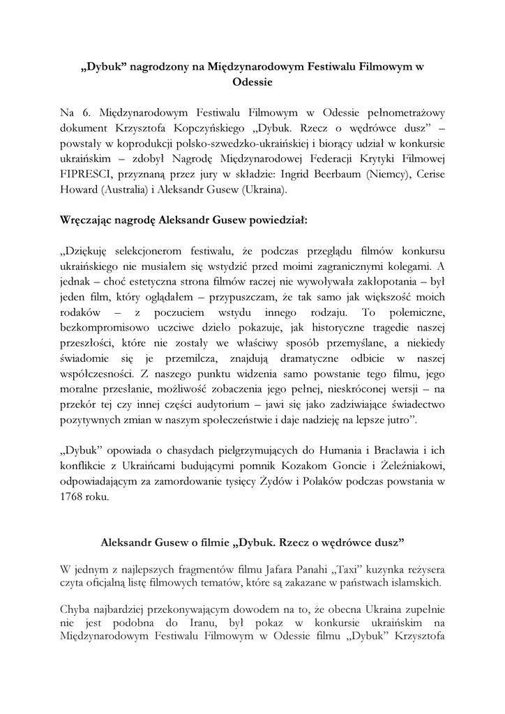 „Dybuk” nagrodzony na Międzynarodowym Festiwalu Filmowym w Odessie Na 6. Międzynarodowym Festiwalu Filmowym w Odessie pełnometrażowy dokument Krzysztofa Kopczyńskiego „Dybuk. Rzecz o wędrówce dusz” – powstały w koprodukcji polsko-szwedzko-ukraińskiej i biorący udział w konkursie ukraińskim – zdobył Nagrodę Międzynarodowej Federacji Krytyki Filmowej FIPRESCI, przyznaną przez jury w składzie: Ingrid Beerbaum (Niemcy), Cerise Howard (Australia) i Aleksandr Gusew (Ukraina). Wręczając nagrodę Aleksandr Gusew powiedział: „Dziękuję selekcjonerom festiwalu, że podczas przeglądu filmów konkursu ukraińskiego nie musiałem się wstydzić przed moimi zagranicznymi kolegami. A jednak – choć estetyczna strona filmów raczej nie wywoływała zakłopotania – był jeden film, który oglądałem – przypuszczam, że tak samo jak większość moich rodaków – z poczuciem wstydu innego rodzaju. To polemiczne, bezkompromisowo uczciwe dzieło pokazuje, jak historyczne tragedie naszej przeszłości, które nie zostały we właściwy sposób przemyślane, a niekiedy świadomie się je przemilcza, znajdują dramatyczne odbicie w naszej współczesności. Z naszego punktu widzenia samo powstanie tego filmu, jego moralne przesłanie, możliwość zobaczenia jego pełnej, nieskróconej wersji – na przekór tej czy innej części audytorium – jawi się jako zadziwiające świadectwo pozytywnych zmian w naszym społeczeństwie i daje nadzieję na lepsze jutro”. „Dybuk” opowiada o chasydach pielgrzymujących do Humania i Bracławia i ich konflikcie z Ukraińcami budującymi pomnik Kozakom Goncie i Żeleźniakowi, odpowiadającym za zamordowanie tysięcy Żydów i Polaków podczas powstania w 1768 roku. Aleksandr Gusew o filmie „Dybuk. Rzecz o wędrówce dusz” W jednym z najlepszych fragmentów filmu Jafara Panahi „Taxi” kuzynka reżysera czyta oficjalną listę filmowych tematów, które są zakazane w państwach islamskich. Chyba najbardziej przekonywającym dowodem na to, że obecna Ukraina zupełnie nie jest podobna do Iranu, był pokaz w konkursie ukraińskim na Międzynarodowym Festiwalu Filmowym w Odessie filmu „Dybuk” Krzysztofa Kopczyńskiego. Filmu, o którym aż chce się powiedzieć: „niewygodny”, „nieprzyjemny”, „spóźniony”. Film rzeczywiście można nazwać „spóźnionym” – takie obrazy powinny powstawać i być rozpowszechniane dawno temu. To być może pozwoliłoby uniknąć wielu problemów w naszej tragicznej teraźniejszości. Jedną z głównych zalet tego filmu, opowiadającego o relacjach pomiędzy chasydzkimi pielgrzymami i mieszkańcami Humania, nawet nie o przenikaniu się tych dwóch światów – które tak naprawdę wcale się nie przenikają, nie mieszają się, jak woda i oliwa – nawet nie o ich zderzeniu, ale o ocieraniu się, jest to, że można go nazwać zarówno antysemickim, jak i antyukraińskim, ponieważ mówi się w nim nie o charakterystycznych wadach konkretnych narodów, ale o naszym wspólnym, ogólnoludzkim przywiązaniu do stereotypów. A także o naszej niechęci do obcego, którego pochopnie określamy jako wroga, o niemożności pozbycia się naszych historycznych uprzedzeń i o źródłach ksenofobii. To film o naszej nieumiejętności zrozumienia i wybaczania, o braku chęci pokajania się. To film o dybukach, duszach, które nie mogą zaznać spokoju, duszach nieopłakanych ofiar naszej dramatycznej historii, za cierpienia których płacimy do dziś, bo nie potrafimy przyznać, że nasi przodkowie popełniali zbrodnie. Oczywiście na mnie – jako na chrześcijaninie i obywatelu Ukrainy – o wiele większe wrażenie zrobiły epizody ukraińskie niż chasydzkie […]. Nie ulega wątpliwości, że wypowiedzi zwykłych mieszkańców Humania o tym, że mordowanie Żydów przez wojska Chmielnickiego było ważnym etapem odzyskania przez Ukrainę niepodległości, można odbierać jako marginalne brednie, których nie należy traktować poważnie. Ale jak sobie poradzić z lekcją historii – mieszanką łzawego sentymentalizmu i rozkoszowania się opisami tortur, lekcji, na której każe się dzieciom uważać za bohaterów Gontę i Żeleźniaka? Muszę przyznać, że w porównaniu z tym moje szkolne wspomnienia o lekcjach gloryfikujących Dzierżyńskiego czy Pawlika Morozowa wypadają blado. Jaki może być system wartości w wojsku, kiedy żołnierzom, broniącym swoich pobratymców – Ukraińców, każe się brać przykład z Gonty i Żeleźniaka? Czego można się spodziewać po polityce kulturalnej kraju, w którym miejskie władze wznoszą pomnik kata miasta? Oczywiście Gonta nie zabił swoich zkatolicyzowanych dzieci i, o ile pamiętam, nie tylko próbował zapobiec rzezi, ale też uratował wiele osób. Cała jego wina polegała na tym, że ze szlachetnych pobudek oddał w ręce straszliwego wroga miasto, którego powinien był bronić. Ale zwykli mieszkańcy, nauczycielka i oficerowie czczą go właśnie jako bohatera poematu Szewczenki, przywódcę rzezi humańskiej i dzieciobójcę. Czego by można jednak się spodziewać po wizerunku Gonty – niech Bóg ma w opiece jego duszę – jeżeli nawet Krucyfiks jest tu oznaką przynależności etnicznej i środkiem, za pomocą którego można kogoś obrazić? Kto bardziej ucierpi – żyd, przeklinający Chrystusa, w którym nigdy nie widział Zbawiciela, a którego wizerunek pojawił się w miejscu dla niego świętym, czy „chrześcijanin”, próbujący wykorzystać symbol swojej wiary, symbol pokuty i ukorzenia się, symbol miłości i wybaczenia, do zaakcentowania wyższości swojego narodu, do upokorzenia obcych, do wywoływania nienawiści i konfliktów? W tym kontekście zburzenie pomnika Lenina w finale filmu wygląda niezbyt optymistycznie – widz już wie, że na opustoszałym cokole może stanąć pomnik innego mordercy. Powody do optymizmu jednak oczywiście są – przede wszystkim to, że w naszym kraju 