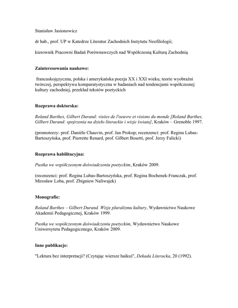 Stanisław Jasionowicz dr hab., prof. UP w Katedrze Literatur Zachodnich Instytutu Neofilologii; kierownik Pracowni Badań Porównawczych nad Współczesną Kulturą Zachodnią Zainteresowania naukowe: francuskojęzyczna, polska i amerykańska poezja XX i XXI wieku, teorie wyobraźni twórczej, perspektywa komparatystyczna w badaniach nad tendencjami współczesnej kultury zachodniej, przekład tekstów poetyckich Rozprawa doktorska: Roland Barthes, Gilbert Durand: visées de l'oeuvre et visions du monde [Roland Barthes, Gilbert Durand: spojrzenia na dzieło literackie i wizje świata], Kraków – Grenoble 1997. (promotorzy: prof. Danièle Chauvin, prof. Jan Prokop; recenzenci: prof. Regina LubasBartoszyńska, prof. Pierrette Renard, prof. Gilbert Bosetti, prof. Jerzy Falicki) Rozprawa habilitacyjna: Pustka we współczesnym doświadczeniu poetyckim, Kraków 2009. (recenzenci: prof. Regina Lubas-Bartoszyńska, prof. Regina Bochenek-Franczak, prof. Mirosław Loba, prof. Zbigniew Naliwajek) Monografie: Roland Barthes – Gilbert Durand. Wizje pluralizmu kultury, Wydawnictwo Naukowe Akademii Pedagogicznej, Kraków 1999. Pustka we współczesnym doświadczeniu poetyckim, Wydawnictwo Naukowe Uniwersytetu Pedagogicznego, Kraków 2009. Inne publikacje: "Lektura bez interpretacji? (Czytając wiersze haiku)", Dekada Literacka, 20 (1992). "Le statut de l'imagination dans la réflexion contemporaine sur le romanesque", [w:] Le romanesque français contemporain, Wydawnictwo Naukowe Uniwersytetu Śląskiego, Katowice 1994. "Poetyka czy wiele poetyk?", [w:] Włodzimierz Bolecki, Wojciech Tomasik (red.), Poetyka bez granic, Wydawnictwo IBL PAN, Warszawa, 1995. "L'immaturité éternelle chez Witold Gombrowicz", [w:] Danièle Chauvin (red.), L'imaginaire des âges de la vie, ELLUG, Grenoble, 1996. "Lecture sans interprétation? Réception des poèmes haïku comme modèle de la 'lecture idéale'", [w:] Regina Lubas-Bartoszyńska i Leszek Bednarczuk (red.), Prace Romanistyczne V, Wydawnictwo Naukowe WSP, Kraków, 1997. "Des structures formelles aux structures anthropologiques: l'exemple des Chats de Baudelaire", [w:] Barbara Sosień (red.), L'Espace, la théâtralité et l'imaginaire, Oficyna Wydawnicza Abrys, Kraków, 1998. "Gilbert Durand en Pologne", [w:] Bulletin de liaison des Centres de Recherches sur l'Imaginaire (hors série nr 1), Dijon, 1998. „Pustka jako figura transcendencji we francuskiej poezji XX wieku: Yves Bonnefoy, Philippe Jaccottet“, [w:] Regina Lubas-Bartoszyńska (red.), Annales Academiae Pedagogicae Cracoviensis, Studia Romanica I, Wydawnictwo Naukowe AP, Kraków 2001. "Skazany na autobiografię: z profesorem Philippe'em Lejeune'em rozmawiają pracownicy Katedry Literatur Zachodnioeuropejskich Instytutu Neofilologii AP", tłum. i oprac. Stanisław Jasionowicz: rozm: Stanisław Jasionowicz, Regina Lubas-Bartoszyńska, Teresa Kwaśna, Konspekt, nr 10, wiosna 2002. „Poszukiwanie spójności“, Konspekt, nr 11, lato 2002. „O wyobraźni“, Konspekt, nr 12, jesień 2002. „O słowach“, Konspekt, nr 13, zima 2002/2003. „Kilka uwag o czasie“, Konspekt, nr 14-15, wiosna-lato 2003. "Wiersze jesieni i zimy" (tłumaczenie wierszy Bertranda Degotta), [w:] Konspekt, nr 1415, wiosna-lato 2003. „Człowiek wśród liczb“, w: Konspekt, nr 16-17, jesień-zima 2003. „Intertekstualność w świetle badań nad wyobraźnią twórczą“, [w:] Barbara Sosień (red.), Intertekstualność i wyobraźniowość, Universitas, Kraków 2003. „L’espace-temps du jardin dans la poésie de Czesław Miłosz“, [w:] Barbara Sosień (red.), Imaginer le jardin, Wydawnictwo Naukowe Uniwersytetu Jagiellońskiego, Kraków 2003. „Nowi dzicy czyli antropologia w warunkach ponowoczesności“, [w:] Konspekt, nr 18, 2004. „Człowiek i (jego) pustka“, [w:] Konspekt, nr 19, 2004. "Construction and Deconstruction of Signs and Symbols", w: Transmigration Cracow New York. Myslowski – Puntos, Taller Boricua Gallery, New York, 2004, tłum. ang. Sabina Potaczek-Jasionowicz. „Czas ciała“, w: Konspekt, nr 20, 2005. „Bramy poza czas. Wyobraźnia w poszukiwaniu nowej transcendencji“, [w:] Jani Konstantinovski Puntos, Seven Gates to Eternity. Siedem wrót do wieczności, Muzeum Zamkowe w Malborku, Malbork 2005; tekst także w jęz. angielskim, tłum. Sabina Potaczek-Jasionowicz. „Archétype“, [w:] Questions de mythocritique. Dictionnaire, Danièle Chauvin, André Siganos et Philippe Walter (red.), Editions Imago, Paryż 2005. "Sfery poznania – interwencje Janiego Konstantinovskiego Puntosa", [w:] Puntos. Copernicus. (wersja w języku polskim i angielskim) Muzeum Uniwersytetu Jagiellońskiego Collegium Maius, Uniwersytet Jagielloński, Kraków, 2007; tekst także w jęz. angielskim. "Jani Konstantinovski Puntos – rys biograficzny", w: Puntos. Copernicus. Muzeum Uniwersytetu Jagiellońskiego Collegium Maius, Uniwersytet Jagielloński, Kraków, 2007; tekst także w jęz. angielskim. "Geometryczne wyobrażenie miasta", [w:] Ewa Wójcik-Konstantinovska, Odczytane geometrią (katalog wystawy), nakładem Galerii Artemis, Kraków, 2007. "Pustka jako kategoria antropologiczna we współczesnym doświadczeniu poetyckim", [w:] B. Faron (red.), Studia Historicolitteraria VIII, Wydawnictwo Naukowe Akademii Pedagogicznej, Kraków 2008; "Sprowadzić niebo pod ziemię – wielicka interwencja Puntosa", [w:] Puntos. Podziemne miasto (wersja w języku polskim i angielskim), Kopalnia Soli "Wieliczka" S.A., 2008. "Pragnienie zatraty jako współczesne doświadczenie poetyckie (Halina Poświatowska, Sylvia Plath, Henri Michaux)", Wydawnictwo Naukowe PAU, Kraków 2009. "'Po co są wierszyki'? O poezji Barbary Gruszki-Zych", "Topos", nr. 1-2 (122-123), 2012. "Jacob, Job et … Lazare. Les motifs bibliques dans la poésie de Tadeusz Różewicz", w: Presses Universitaires Paris-Sorbonne (oddano do druku). "Komparatystyka między Mickiewiczem a dniem dzisiejszym" (recenzja książki), w: "Wiek Dziewiętnasty" (odda