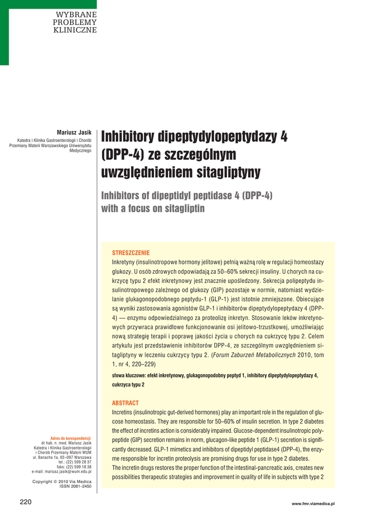 WYBRANE PROBLEMY KLINICZNE Mariusz Jasik Katedra i Klinika Gastroenterologii i Chorób Przemiany Materii Warszawskiego Uniwersytetu Medycznego Inhibitory dipeptydylopeptydazy 4 (DPP-4) ze szczególnym uwzględnieniem sitagliptyny Inhibitors of dipeptidyl peptidase 4 (DPP-4) with a focus on sitagliptin STRESZCZENIE Inkretyny (insulinotropowe hormony jelitowe) pełnią ważną rolę w regulacji homeostazy glukozy. U osób zdrowych odpowiadają za 50–60% sekrecji insuliny. U chorych na cukrzycę typu 2 efekt inkretynowy jest znacznie upośledzony. Sekrecja polipeptydu insulinotropowego zależnego od glukozy (GIP) pozostaje w normie, natomiast wydzielanie glukagonopodobnego peptydu-1 (GLP-1) jest istotnie zmniejszone. Obiecujące są wyniki zastosowania agonistów GLP-1 i inhibitorów dipeptydylopeptydazy 4 (DPP4) — enzymu odpowiedzialnego za proteolizę inkretyn. Stosowanie leków inkretynowych przywraca prawidłowe funkcjonowanie osi jelitowo-trzustkowej, umożliwiając nową strategię terapii i poprawę jakości życia u chorych na cukrzycę typu 2. Celem artykułu jest przedstawienie inhibitorów DPP-4, ze szczególnym uwzględnieniem sitagliptyny w leczeniu cukrzycy typu 2. (Forum Zaburzeń Metabolicznych 2010, tom 1, nr 4, 220–229) słowa kluczowe: efekt inkretynowy, glukagonopodobny peptyd 1, inhibitory dipeptydylopeptydazy 4, cukrzyca typu 2 ABSTRACT Incretins (insulinotropic gut-derived hormones) play an important role in the regulation of glucose homeostasis. They are responsible for 50–60% of insulin secretion. In type 2 diabetes the effect of incretins action is considerably impaired. Glucose-dependent insulinotropic polyAdres do korespondencji: dr hab. n. med. Mariusz Jasik Katedra i Klinika Gastroenterologii i Chorób Przemiany Materii WUM ul. Banacha 1a, 02–097 Warszawa tel.: (22) 599 28 37 faks: (22) 599 18 38 e-mail: [email protected] Copyright © 2010 Via Medica ISSN 2081–2450 220 peptide (GIP) secretion remains in norm, glucagon-like peptide 1 (GLP-1) secretion is significantly decreased. GLP-1 mimetics and inhibitors of dipeptidyl peptidase4 (DPP-4), the enzyme responsible for incretin proteolysis are promising drugs for use in type 2 diabetes. The incretin drugs restores the proper function of the intestinal-pancreatic axis, creates new possibilities therapeutic strategies and improvement in quality of life in subjects with type 2 www.fmr.viamedica.pl Mariusz Jasik Inhibitory dipeptydylopeptydazy 4 (DPP-4) ze szczególnym uwzględnieniem sitagliptyny diabetes. The aim of article was to present dipeptidyl peptidase IV inhibitors, with a focus on sitagliptin in treatment of type 2 diabetes. (Forum Zaburzeń Metabolicznych 2010, vol. 1, no 4, 220–229) key words: incretin effect, glucagon-like peptide 1, dipeptidyl peptidase IV inhibitors, type 2 diabetes ZABURZENIA EFEKTU INKRETYNOWEGO komórek b trzustki na zmiany glikemii, powo- W CUKRZYCY TYPU 2 dując, że w dalszych etapach choroby prze- Narastająca dysfunkcja czynności komórek bieg cukrzycy typu 2 staje się coraz bardziej beta trzustki to pierwszoplanowe zaburzenie niewyrównany. Przywrócenie działania inkre- u chorych na cukrzycę typu 2. Proces ten jest tyn przez leki inkretynowe stwarza nowe intensyfikowany znacznego stopnia insulino- możliwości nowoczesnej terapii wpływającej opornością tkanek obwodowych, najbardziej na poprawę wyrównania metabolicznego zaawansowaną u chorych z towarzyszącą nad- cukrzycy [1]. wagą bądź otyłością. Pogarszające się wyrównanie metaboliczne cukrzycy typu 2 jest za- GRUPA LEKÓW INKRETYNOWYCH tem efektem postępującego ograniczania Leki inkretynowe działają analogicznie jak zdolności komórek b trzustki do sekrecji od- inkretyny, zwiększając stężenie GLP-1, a w powiednich ilości insuliny i narastającej insu- konsekwencji insuliny uwalnianej przez linooporności. Szczegółowe poznanie pato- trzustkę w reakcji na spożywany posiłek, co genezy cukrzycy typu 2 pozwoliło ustalić, że umożliwia skuteczną kontrolę glikemii. istotne znaczenie w przebiegu tego schorze- Pierwszą grupę leków stanowią agoniści re- nia mają zaburzenia efektu inkretynowego, ceptora GLP-1 (eksenatyd i liraglutyd), któ- co umożliwiło zastosowanie nowej grupy le- rzy wpływają na poprawę efektu inkretynowe- ków inkretynowych. Inkretyny są uwalniane go przez stymulację receptora GLP-1. Podob- przez komórki K i L błony śluzowej jelita krę- nie jak endogenny GLP-1, również agoniści tego oraz okrężnicy i wykazują swój udział w receptora GLP-1 łączą się ze specyficznym regulacji uwalniania insuliny i glukagonu receptorem GLP-1, którego stymulacja pro- przez trzustkę w sposób zależny od wartości wadzi do wzrostu stężenia wewnątrzkomór- glikemii. Wzrost glikemii stymuluje nasilenie kowego cyklicznego adenozynomonofosfo- działania inkrety, a hipoglikemia prowadzi ranu (cAMP, cyclic adenosine monophospha- do zahamowania działania glukagonopodob- te) i aktywacji szlaków metabolicznych powo- nego peptydu 1 (GLP-1, glucagon-like pepti- dujących zależne od glikemii wydzielanie in- de 1), przeciwdziałając w ten sposób dalsze- suliny. Leki te powodują zwiększenie stęże- mu obniżaniu glikemii. U osób zdrowych nia hormonów inkretynowych, w szczególno- wpływ GLP-1 odpowiada za 50–60% poposił- ści GLP-1, który wykazuje następujące dzia- kowej sekrecji insuliny. W stanach przedcu- łania: stymuluje wydzielanie insuliny i hamu- krzycowych oraz w cukrzycy typu 2 sekrecja je wydzielanie glukagonu przez komórki a inkretyn jest zaburzona, co w efekcie prowa- wysp trzustkowych, sprzyja poprawie wrażli- dzi do ograniczenia aktywności GLP-1 i ma wości na insulinę, opóźnia opróżnianie żołąd- istotne znaczenie w patogenezie powstawa- ka, zmniejsza zapotrzebowanie na pokarm, nia niedoboru insuliny w cukrzycy typu 2. zwiększa masę komórek b trzustki oraz przed- Następstwem pogarszającego się działania łuża ich