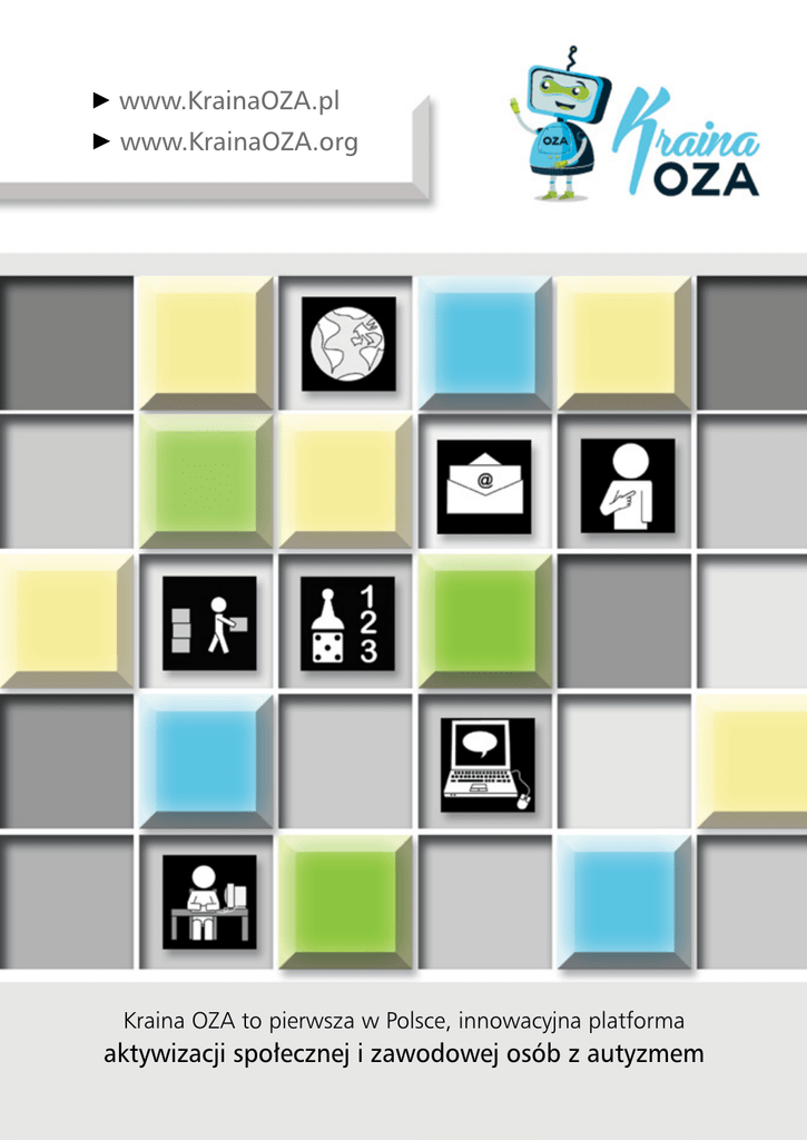▶ www.KrainaOZA.pl ▶ www.KrainaOZA.org Kraina OZA to pierwsza w Polsce, innowacyjna platforma aktywizacji społecznej i zawodowej osób z autyzmem Platforma Kraina OZA to miejsce w sieci, w którym spotykają się: osoby ze spektrum autyzmu oraz pracodawcy, studenci, pracownicy wyższych uczelni, rodzice, opiekunowie osób z autyzmem i wszyscy zainteresowani tematem. Nazwa Kraina OZA pochodzi od pierwszych liter słów: K R A Kariera Rozwój Aktywizacja O Z A Osób z Autyzmem I N Innowacyjność Niezależność A Akceptacja Platforma składa się z dwóch uzupełniających się stron internetowych: ▶ www.KrainaOZA.pl ▶ www.KrainaOZA.org • Strona www.KrainaOZA.pl służy włączeniu i aktywizacji społecznej oraz zawodowej osób z autyzmem. Treść i forma są dostosowane do potrzeb i zainteresowań jej użytkowników. Strona jest przyjazna, ma czytelną i zrozumiałą strukturę. Zawiera innowacyjne rozwiązania komunikacyjne: piktogramy, uproszczone teksty i opcję audio (odczytywania tekstu przez lektora). Zachęcamy do jej obejrzenia! • Strona www.KrainaOZA.org służy informowaniu oraz poszerzaniu wiedzy na temat autyzmu. Jest przeznaczona dla pracodawców, studentów (jako przyszłych pracodawców lub terapeutów), pracowników wyższych uczelni, rodziców, opiekunów i całego otoczenia osób z autyzmem. Stanowi ona źródło informacji i praktycznych narzędzi dla pracodawców otwartych na zarządzanie różnorodnością w swojej firmie. Załóż konto na stronie ▶ www.KrainaOZA.org Założenie konta pozwoli skorzystać ze wszystkich elementów i funkcji strony, między innymi z bezpłatnych szkoleń e-learningowych dla pracodawców. Szkolenia e-learningowe pozwalają użytkownikom platformy poszerzyć wiedzę z zakresu autyzmu, uzyskać informacje o możliwościach i korzyściach płynących z zatrudniania osób z autyzmem, poznać specyfikę pracy osób z autyzmem, komunikacji z nimi oraz ich funkcjonowania. Każdy użytkownik portalu – po uprzednim zalogowaniu – może wziąć udział w szkoleniu i dzięki temu rozwinąć swoje kompetencje. Pracodawcy mogą umieszczać na platformie oferty pracy dla osób ze spektrum autyzmu. Oferty te będą automatycznie ukazywać się także na stronie www.KrainaOZA.pl, w formie czytelnej dla osób z autyzmem. Rozwiązanie to pozwoli usprawnić komunikację między pracodawcami a potencjalnymi pracownikami z autyzmem. Na portalu www.KrainaOZA.org można znaleźć między innymi: informacje o przepisach prawa dotyczących zatrudniania osób z autyzmem, akty prawne w tym zakresie, aktualne informacje o działaniach podejmowanych w projekcie, o związanych z tematem konferencjach i innych wydarzeniach, opis dobrych praktyk firm, które już zarządzają różnorodnością poprzez zatrudnianie osób z autyzmem, listę miejsc przyjaznych osobom z autyzmem, interesujące artykuły, opracowania, wyniki badań i analiz, materiały edukacyjne i wspierające w zakładce „Możliwości rozwoju”, a także forum użytkowników. Platforma Kraina OZA została przetestowana i uruchomiona w 2014 roku. Przez kolejne lata będzie utrzymywana i rozbudowywana o nowe treści. Kraina OZA to portal pracodawców i pracowników o wyjątkowych możliwościach: szkolenia dla pracodawców informacje prawne artykuły i aktualności materiały edukacyjne przykłady dobrych praktyk formularz do zamieszczania ofert pracy mapa przyjaznych miejsc forum użytkowników link do www.KrainaOZA.pl Ze wszystkich funkcji portalu Kraina OZA można korzystać nieodpłatnie, bez ograniczeń. Portal utworzono w ramach innowacyjnego projektu pt. Edu-Autyzm, współ- finansowanego ze środków Unii Europejskiej w ramach Programu Operacyjnego Kapitał Ludzki i realizowanego przez Fundację Wspólnota Nadziei we współpracy z Małopolskim Związkiem Pracodawców Lewiatan, belgijskim stowarzyszeniem WAI-NOT oraz flamandzkim uniwersytetem Thomas More (KU Leuven). Projekt współfinansowany ze środków Unii Europejskiej w ramach Europejskiego Funduszu Społecznego CZŁOWIEK – NAJLEPSZA INWESTYCJA