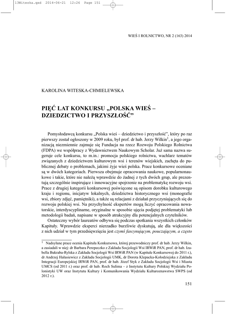 13Witeska.qxd 2014-06-21 12:26 Page 151 WIEŚ I ROLNICTWO, NR 2 (163) 2014 KAROLINA WITESKA-CHMIELEWSKA PIĘĆ LAT KONKURSU „POLSKA WIEŚ – DZIEDZICTWO I PRZYSZŁOŚĆ” Pomysłodawcą konkursu „Polska wieś – dziedzictwo i przyszłość”, który po raz pierwszy został ogłoszony w 2009 roku, był prof. dr hab. Jerzy Wilkin1, a jego organizacją niezmiennie zajmuje się Fundacja na rzecz Rozwoju Polskiego Rolnictwa (FDPA) we współpracy z Wydawnictwem Naukowym Scholar. Już sama nazwa sugeruje cele konkursu, to m.in.: promocja polskiego rolnictwa, wachlarz tematów związanych z dziedzictwem kulturowym wsi i terenów wiejskich, zachęta do publicznej debaty o problemach, jakimi żyje wieś polska. Prace konkursowe oceniane są w dwóch kategoriach. Pierwsza obejmuje opracowania naukowe, popularnonaukowe i takie, które nie należą wprawdzie do żadnej z tych dwóch grup, ale prezentują szczególnie inspirujące i innowacyjne spojrzenie na problematykę rozwoju wsi. Prace z drugiej kategorii konkursowej poświęcone są opisom dorobku kulturowego kraju i regionu, inicjatyw lokalnych, dziedzictwa historycznego wsi (monografie wsi, zbiory zdjęć, pamiętniki), a także są relacjami z działań przyczyniających się do rozwoju polskiej wsi. Na przychylność ekspertów mogą liczyć opracowania nowatorskie, interdyscyplinarne, oryginalne w sposobie ujęcia podjętej problematyki lub metodologii badań, napisane w sposób atrakcyjny dla potencjalnych czytelników. Ostateczny wybór laureatów odbywa się podczas spotkania wszystkich członków Kapituły. Wprawdzie eksperci nierzadko burzliwie dyskutują, ale dla większości z nich udział w tym przedsięwzięciu jest czymś fascynującym, pouczającym, a często 1 Nadsyłane prace ocenia Kapituła Konkursowa, której przewodniczy prof. dr hab. Jerzy Wilkin, a zasiadali w niej: dr Barbara Perepeczko z Zakładu Socjologii Wsi IRWiR PAN, prof. dr hab. Izabella Bukraba-Rylska z Zakładu Socjologii Wsi IRWiR PAN (w Kapitule Konkursowej do 2011 r.), dr Andrzej Hałasiewicz z Zakładu Socjologii UMK, dr Dorota Klepacka-Kołodziejska z Zakładu Integracji Europejskiej IRWiR PAN, prof. dr hab. Józef Styk z Zakładu Socjologii Wsi i Miasta UMCS (od 2011 r.) oraz prof. dr hab. Roch Sulima – z Instytutu Kultury Polskiej Wydziału Polonistyki UW oraz Instytutu Kultury i Komunikowania Wydziału Kulturoznawstwa SWPS (od 2012 r.). 151 13Witeska.qxd 2014-06-21 12:26 Page 152 także wzruszającym. Prace zgłaszane na konkurs są w większości autentycznym produktem serca i umysłu, a także w wielu przypadkach, ciężkiej pracy 2. Zwycięzca w każdej z kategorii otrzymuje nagrodę pieniężną w wysokości 5 tys. zł brutto, a wybrane prace zostają wydane w Wydawnictwie Naukowym Scholar3, zaś ich promocja odbywa się w pierwszej połowie następnego roku. Stałymi patronami medialnymi, wspierającymi Fundację w upowszechnianiu informacji o konkursie, są portale internetowe: kulturaludowa.pl; witrynawiejska.org.pl. W 2010 r. patronem honorowym został Polski Komitet ds. UNESCO, bo konkurs wpisuje się w jego cele związane z poszukiwaniem i wspieraniem dokumentowania kultury niematerialnej. Od 2011 r. promocje prac nagrodzonych w konkursie połączono z konwersatoriami „Polska wieś w XXI wieku”, związanymi z publikowanymi od 2000 r. przez FDPA co dwa lata raportami o stanie polskiej wsi. Tematyka konwersatoriów jest determinowana tematyką nagradzanych w danym roku prac konkursowych. TROCHĘ STATYSTYKI Na dotychczasowe pięć edycji konkursu wpłynęło łącznie 221 prac, większość w kategorii drugiej – zgłoszono do niej 156 opracowań, w pierwszej znalazło się ich 65. Wśród nadsyłanych prac dominują monografie wsi, pojawiają się sagi rodzinne, opowiadania i wiersze. Wśród autorów jest 53% kobiet. Ponieważ od dwóch lat uczestnicy konkursu podają swój wiek, wiemy, że średnia wieku uczestników to w przypadku pierwszej kategorii – 33 lata, a drugiej – 47 lat. Najwięcej uczestników mieszka w województwie lubelskim (z tego regionu pochodzi ok. 15% osób), za nim jest województwo mazowieckie (12%), następnie kujawsko-pomorskie (10%). Najmniejsze zainteresowanie konkursem stwierdzono w województwach: łódzkim (3%) oraz lubuskim (4%), pomorskim (4%), podlaskim (4%), opolskim (4%), dolnośląskim (4%). Raz zdarzyło się, że w szranki o konkursowe laury stanął uczestnik z Berlina. Najchętniej opisywany obszar to także Lubelszczyzna – poświęcono jej 18% zgłoszonych prac, prawie o połowę mniej dotyczyło województwa kujawsko-pomorskiego (10%) i podkarpackiego (8%). Najrzadziej przedmiotem opisu stają się wsie z województw: lubuskiego (3%), pomorskiego (3%), łódzkiego (3%), podlaskiego (4%) i opolskiego (4%). Uczestnicy najchętniej piszą o historii własnej wsi. Często pojawiają się także prace dotyczące wpływu funduszy unijnych na rozwój konkretnych miejscowości. Wśród prac nie brakuje takich, które wzruszały, zatrzymywały na dłużej, rozbudzały emocje, wywoływały dyskusję, pozwoliły uchylić rąbka tajemnicy wsi znanych i mniej rozpoznawalnych. 2 J. Wilkin, 2012: Wstęp [w:] A. Paprot, Kształtowanie się świadomości kulturowej mieszkańców Starej Kościelnicy po 1945 roku, Wydawnictwo Naukowe Scholar, Warszawa, s. 7. 3 Które odpowiada za redakcję i wydanie drukiem wybranych prac oraz ich dystrybucję do księgarń na terenie całej Polski. Wszystkie książki można również zakupić na stronie internetowej wydawnictwa. 152 13Witeska.qxd 2014-06-21 12:26 Page 153 Najwięcej jest monografii, tworzonych zazwyczaj przez zaangażowanych społecznie, działających na rzecz lokalnej wspólnoty mieszkańców, którzy czują wręcz przymus opowiadania o swoich miejscowościach. Wśród autorów są lokalni dziennikarze, radni, dyrektorzy szkół, prezesi stowarzyszeń, a nawet księża. Z ich prac przebija nieskrywane zaangażowanie w losy wsi i autentyczny zapa