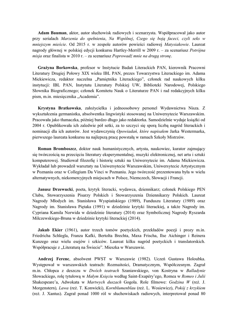 Adam Bauman, aktor, autor słuchowisk radiowych i scenarzysta. Współpracował jako autor przy serialach Marzenia do spełnienia, Na Wspólnej, Czego się boją faceci, czyli seks w mniejszym mieście. Od 2015 r. w zespole autorów powieści radiowej Matysiakowie. Laureat nagrody głównej w polskiej edycji konkursu Hartley-Merrill w 2009 r. – za scenariusz Potrójna misja oraz finalista w 2010 r. – za scenariusz Poprowadź mnie na drugą stronę. Grażyna Borkowska, profesor w Instytucie Badań Literackich PAN, kierownik Pracowni Literatury Drugiej Połowy XIX wieku IBL PAN, prezes Towarzystwa Literackiego im. Adama Mickiewicza, redaktor naczelna „Pamiętnika Literackiego”, członek rad naukowych kilku instytucji: IBL PAN, Instytutu Literatury Polskiej UW, Biblioteki Narodowej, Polskiego Słownika Biograficznego; członek Komitetu Nauk o Literaturze PAN i rad redakcyjnych kilku pism, m.in. miesięcznika „Academia”. Krystyna Bratkowska, założycielka i jednoosobowy personel Wydawnictwa Nisza. Z wykształcenia germanistka, absolwentka lingwistyki stosowanej na Uniwersytecie Warszawskim. Pracowała jako tłumaczka, później bardzo długo jako redaktorka. Samodzielnie wydaje książki od 2004 r. Opublikowała ich zaledwie pół setki, za to szczyci się sporą liczbą nagród literackich i nominacji dla ich autorów. Jest wydawczynią Opowiadań, które napisałem Jarka Westermarka, pierwszego laureata konkursu na najlepszą pracę powstałą w ramach Szkoły Mistrzów. Roman Bromboszcz, doktor nauk humanistycznych, artysta, naukowiec, kurator zajmujący się twórczością na przecięciu literatury eksperymentalnej, muzyki elektronicznej, net artu i sztuki komputerowej. Studiował filozofię i historię sztuki na Uniwersytecie im. Adama Mickiewicza. Wykładał lub prowadził warsztaty na Uniwersytecie Warszawskim, Uniwersytecie Artystycznym w Poznaniu oraz w Collegium Da Vinci w Poznaniu. Jego twórczość prezentowana była w wielu alternatywnych, niekomercyjnych miejscach w Polsce, Niemczech, Słowacji i Francji. Janusz Drzewucki, poeta, krytyk literacki, wydawca, dziennikarz; członek Polskiego PEN Clubu, Stowarzyszenia Pisarzy Polskich i Stowarzyszenia Dziennikarzy Polskich. Laureat Nagrody Młodych im. Stanisława Wyspiańskiego (1989), Funduszu Literatury (1989) oraz Nagrody im. Stanisława Piętaka (1991) w dziedzinie krytyki literackiej, a także Nagrody im. Cypriana Kamila Norwida w dziedzinie literatury (2014) oraz Symbolicznej Nagrody Ryszarda Milczewskiego-Bruna w dziedzinie krytyki literackiej (2014). Jakub Ekier (1961), autor trzech tomów poetyckich, przekładów poezji i prozy m.in. Friedricha Schlegla, Franza Kafki, Bertolta Brechta, Maxa Frischa, Ilse Aichinger i Reinera Kunzego oraz wielu esejów i szkiców. Laureat kilku nagród poetyckich i translatorskich. Współpracuje z „Literaturą na Świecie”. Mieszka w Warszawie. Andrzej Ferenc, absolwent PWST w Warszawie (1982). Uczeń Gustawa Holoubka. Występował w warszawskich teatrach: Rozmaitości, Dramatycznym, Współczesnym. Zagrał m.in. Chłopca z deszczu w Dwóch teatrach Szaniawskiego, von Kostryna w Balladynie Słowackiego, rolę tytułową w Małym Księciu według Saint-Exupéry’ego, Romea w Romeo i Julii Shakespeare’a, Adwokata w Martwych duszach Gogola. Role filmowe: Godzina W (reż. J. Morgenstern), Lawa (reż. T. Konwicki), Kornblumenblau (reż. L. Wosiewicz), Pokój z krzykiem (reż. J. Xantus). Zagrał ponad 1000 ról w słuchowiskach radiowych, interpretował ponad 80 książek. Laureat Złotego Mikrofonu 2010. Wykładowca Akademii Muzycznej w Łodzi, Dyrektor Artystyczny Sceny w Domu Literatury w Warszawie. Jacek Głażewski, historyk literatury, tłumacz. Pracuje w Instytucie Literatury Polskiej UW (Zakład Literatury i Kultury Epok Dawnych). Zajmuje się literaturą i kulturą XVII–XVIII wieku, a także relacjami między literaturą, polityką i historią. Opublikował książki: W żywiole tekstu. „Dworzanki” Jana Gawińskiego – próba lektury i interpretacji (Warszawa 2008) oraz Wariacje z powtórzeniami. Studia porównawcze z dziejów piśmiennictwa polskiego XVII wieku (Warszawa 2013). Joanna Jeziorska-Haładyj, doktor nauk humanistycznych, adiunkt w Zakładzie Poetyki, Teorii Literatury i Metodologii Badań Literackich UW. Autorka książki Tekstowe wykładniki fikcji. Na przykładzie reportażu i powieści autobiograficznej (2013) oraz artykułów publikowanych m.in. w „Pamiętniku Literackim” i „Tekstach Drugich”. Zajmuje się narratologią (teorie fikcji, gatunki pograniczne, powieść). Obecnie pracuje nad habilitacją poświęconą narracji drugoosobowej. Olga Hołownia (1978), anglistka i kulturoznawca, specjalizująca się w literaturze angielskiej i islandzkiej XX w., tłumaczka, badaczka literatury dla dzieci i młodzieży oraz problematyki performance’u. Jej „podwójny” doktorat (Wydział Anglistyki UW – Uniwersytet w Reykjavíku) dotyczył klisz we współczesnej poezji angielskiej i islandzkiej. Przełożyła wiele wierszy islandzkich na język polski oraz tłumaczyła poetów polskich na islandzki (m.in. wiersze Ewy Lipskiej). Organizowała na Islandii wiele imprez kulturalnych związanych z promocją polskiej literatury. Związana z Uniwersytetem w Reykjavíku (prowadziła tam w ostatnich latach kursy literatury polskiej oraz warsztaty na temat performance’u), w Polsce – z Instytutem im. Adama Mickiewicza. Olaf Krysowski (1969), dr hab. prof. UW, zajmuje się historią literatury oraz komparatystyką. Jego zainteresowania koncentrują się wokół twórczości Mickiewicza, Słowackiego i Krasińskiego. Obejmują związki literatury z różnymi tradycjami kulturowymi, przede wszystkim tymi, które rozwijały się na tzw. obszarach kresowych dawnej Rzeczypospolitej, a także relacje między poezją i malarstwem, słowem i obrazem. Jest autorem książek „Słońc ogromnych kręgi…” Malarskie inspiracje Słowackiego (2002), Tradyc