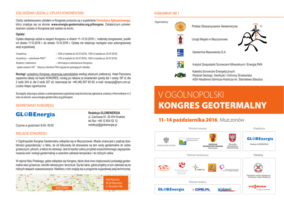 ZGŁOSZENIA UDZIAŁU, OPŁATA KONGRESOWA KOMUNIKAT NR 1 Osoby zainteresowane udziałem w Kongresie proszone są o wypełnienie Formularza Zgłoszeniowego, który znajduje się na stronie: www.energia-geotermalna.org.pl/kongres. Ostatecznym potwierdzeniem udziału w Kongresie jest wpłata na konto. Organizatorzy Polskie Stowarzyszenie Geotermiczne Opłata*: Opłata obejmuje udział w sesjach Kongresu w dniach 11–13.10.2016 r., materiały kongresowe, posiłki od obiadu 11.10.2016 r. do obiadu 13.10.2016 r. Opłata nie obejmuje noclegów oraz pokongresowej sesji wyjazdowej. Uczestnicy – 1200 zł (wpłata do 30.07.2016), 1350 zł (wpłata po 30.07.2016) Uczestnicy – członkowie PSG** – 1100 zł (wpłata do 30.07.2016), 1250 zł (wpłata po 30.07.2016) Studenci i doktoranci – informacja w sekretariacie Kongresu * Urząd Miejski w Mszczonowie Geotermia Mazowiecka S.A. Instytut Gospodarki Surowcami Mineralnymi i Energią PAN opłata zawiera VAT ** dotyczy członków PSG regularnie opłacających składkę Katedra Surowców Energetycznych Wydział Geologii, Geofizyki i Ochrony Środowiska AGH Akademia Górniczo-Hutnicza im. Stanisława Staszica Noclegi: uczestnicy Kongresu rezerwują samodzielnie według własnych preferencji. Hotel Panorama zapewnia rabaty na hasło KONGRES, nocleg po rabacie ze śniadaniem (pokój dla 1 osoby 197 zł, dla 2 osób 244 zł, dla 3 osób 327 zł), rezerwacje tel. +48 (46) 857 60 60, e-mail: [email protected]. Liczba miejsc ograniczona. Szczegóły dotyczące udziału w pokongresowej wyjazdowej sesji technicznej ogłoszone zostaną w Komunikacie nr 2 oraz na stronie: www.energia-geotermalna.org.pl/kongres SEKRETARIAT KONGRESU Redakcja GLOBENERGIA ul. Cechowa 51, 30-614 Kraków tel./fax: +48 12 654 52 12 [email protected] Czynne w godzinach 8:00–16:00 C V OGÓLNOPOLSKI KONGRES GEOTERMALNY 11–14 października 2016, Mszczonów Patronat honorowy Współpraca MIEJSCE KONGRESU V Ogólnopolski Kongres Geotermalny odbędzie się w Mszczonowie. Miasto znane jest z prężnej działalności gospodarczej i z faktu, że od kilkunastu lat stosowane są tam wody geotermalne do celów grzewczych, pitnych, a także do rekreacji. Jest to bardzo udany przykład wszechstronnego zagospodarowania wód i energii geotermalnej w szerokim zakresie temperatur i do różnych celów. W rejonie Niżu Polskiego, gdzie odbędzie się Kongres, także dwie inne miejscowości posiadają geotermalne sieci grzewcze, ośrodki rekreacyjne i lecznicze. Są też takie, gdzie projekty w tym zakresie są na różnych etapach zaawansowania. Niektóre z nich znajdą się w programie wyjazdowej sesji technicznej. MSZCZONÓW Hotel Panorama 96-320 Mszczonów ul. Tarczyńska 109a Marszałek Województwa Mazowieckiego Patronat merytoryczny Federacja Regionalnych Związków Gmin i Powiatów RP Redakcja GLOBENERGIA Partnerzy Państwowy Instytut Geologiczny – Państwowy Instytut Badawczy Patronat medialny ZAPROSZENIE MATERIAŁY KONGRESOWE Polskie Stowarzyszenie Geotermiczne, Miasto i Gmina Mszczonów, Geotermia Mazowiecka S.A. oraz Instytut Gospodarki Surowcami Mineralnymi i Energią PAN i Katedra Surowców Energetycznych Wydziału Geologii, Geofizyki i Ochrony Środowiska Akademii Górniczo-Hutniczej im. Stanisława Staszica zapraszają do udziału w V Ogólnopolskim Kongresie Geotermalnym, który odbędzie się w dniach 11–14 października 2016 r. w Mszczonowie. Poprzednie Kongresy odbyły się w latach 2007, 2009, 2011 i 2013. Były to najważniejsze krajowe spotkania środowiska naukowców i praktyków związanych z geotermią, które przysłużyły się przeglądowi stanu rozwoju, doświadczeń i perspektyw geotermii w naszym kraju, zintegrowały wiele osób i środowisk. Czas zatem na V Ogólnopolski Kongres Geotermalny. Uczestnicy Kongresu otrzymają egzemplarze recenzowanego czasopisma „Technika Poszukiwań Geologicznych. Geotermia i Zrównoważony Rozwój” zawierające referaty autorów zainteresowanych publikacją, a także abstrakty pozostałych tematów zgłoszonych na Kongres w formie drukowanej lub na nośniku elektronicznym. TPGGiZR jest notowana na Liście czasopism MNiSW (6 pkt/artykuł). Do udziału w Kongresie zapraszamy naukowców, praktyków, przedstawicieli instytucji rządowych i samorządów lokalnych, przedsiębiorców, inwestorów, firmy usługowe, doktorantów i studentów, a także inne osoby zainteresowane geotermią. Spotkajmy się w Mszczonowie! Organizatorzy V Ogólnopolskiego Kongresu Geotermalnego 2016 PROGRAM RAMOWY KONGRESU W dniach 11–13.10.2016 r. planowane są sesje: plenarne, techniczne, sesje z udziałem firm działających w branży geotermalnej, sesja okolicznościowa z okazji 10-lecia Polskiego Stowarzyszenia Geotermicznego, a w dniu 14.10.2016 r. – pokongresowa wyjazdowa sesja techniczna „Geotermia w centralnej Polsce” do wybranych obiektów geotermalnych (udział w tej sesji wymaga zgłoszenia oraz uiszczenia dodatkowej opłaty). ZGŁOSZENIA, NADSYŁANIE REFERATÓW I ABSTRAKTÓW • Zgłaszanie tytułów referatów i abstraktów na Kongres odbywa się poprzez wypełnienie Formularza Zgłoszeniowego na stronie www.energia-geotermalna.org.pl/kongres w terminie do dnia 15.05.2016 r. • Autorzy zainteresowani publikacją referatu w „Technice Poszukiwań Geologicznych. Geotermia i Zrównoważony Rozwój” proszeni są o nadesłanie pełnego tekstu referatu (zgodnie z wymogami redakcji dostępnymi na stronie czasopisma*) do dnia 15.05.2016 r. na adres: Redakcja „Techniki Poszukiwań Geologicznych. Geotermia i Zrównoważony Rozwój” ul. Wybickiego 7, 31-261 Kraków, [email protected] Referaty zostaną przesłane do recenzji, następnie Autorzy będą proszeni o ewentualne poprawki i odesłanie referatów po korekcie do Redakcji w terminie do dnia 15.06.2016 r. • Abstrakty referatów, których autorzy nie są zainteresowani ich publikacją w TPGGiZR należy przesłać do dnia 15.05.2016 r. na adres: [email protected] (maks. 1 strona A4 wra