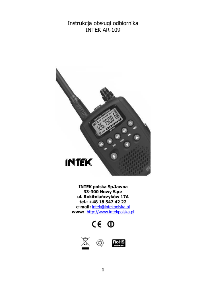Instrukcja obsługi odbiornika INTEK AR-109 INTEK polska Sp.Jawna 33-300 Nowy Sącz ul. Rokitniańczyków 17A tel.: +48 18 547 42 22 e-mail: [email protected] www: http://www.intekpolska.pl 1 UWAGA WAŻNE ! Jest wskazane aby uważnie przeczytać niniejszą instrukcje obsługi do końca przed użyciem produktu. To zabezpieczy użytkownika przed nieprawidłowym zabronionym w danym kraju używaniem odbiornika niezgodnie z Prawem Telekomunikacyjnym danego kraju. UWAGA WAŻNE ! Maksymalny zasięg odbioru bardzo zależy od terenu i warunków otoczenia i środowiska. Największy zasięg uzyskuje się w otwartej przestrzeni. Zasięg zawsze jest mniejszy w wypadku zabudowań i występujących w otoczeniu dużych struktur naturalnych lub sztucznych. AR-109 to kieszonkowych rozmiarów skaner - odbiornik przeznaczony w szczególności do monitorowania pasma lotniczego. Obejmuje on również pasmo VHF NFM używane przez radioamatorów, służby cywilne, marynarkę itd., oraz szerokie pasmo FM (88-108 MHz) czyli pasmo z działającymi komercyjnymi stacjami radiowymi. Wyposażony został w liczne funkcje takie jak podświetlenie wyświetlacza, który pokazuje pełne 7 cyfrowe wartości częstotliwości, jak cyfrowy SWR (pomiar sygnału przychodzącego), 99 miejsc pamięci i wiele więcej! Dostępne do odsłuchu jest : Pasmo lotnicze (komercyjne i ogólne) Pasmo amatorskie 144 MHz Policja Ambulansy Służby cywilne Straż pożarna Komercyjne stacje radiowe VHF Pasmo morskie VHF Band Funkcje i korzyści pomimo że radiotelefon wyposażony jest w zaawansowane funkcje, praca z nim jest wygodna dla użytkownika i można się z nimi zapoznać w ciągu kilku minut. Oto lista częstotliwości : Pasmo lotnicze Pasmo Pasmo radiowe VHF AM 118-137 MHz VHF NFM 137-175 MHz FM 88-108 MHz Oto lista funkcji : Podświetlanie LCD. Wyświetlacz LCD - 7 cyfrowy, pełna wartość częstotliwości. 99 programowalnych kanałów pamięci. Wskaźnik poziomu naładowania. Wskaźnik mocy sygnału. Blokada klawiatury. Sygnalizacja dźwiękowa klawiatury. 2 Układ oszczędzania baterii. Monitor. Funkcja pomijania kanałów przy skanowaniu. Funkcja opóźnienia. Funkcja automatycznego skanowania dwóch częstotliwości/kanałów pamięci Dual Watch. Gniazdo zewnętrznego zestawu słuchawkowego. Gniazdo ładowania. Pełny zestaw zawiera Należy uważnie sprawdzić zawartość otrzymanego zestawu z poniższą listą: 1 x Radiotelefon 1 x Gumowa antena 2 x Pakiet akumulatorowy 1.2V Ni-MH 1 x Ładowarka ścienna 230VAC 1 x Zaczep na pasek 1 x Podręcznik użytkownika (niniejszy) Instalacja i sprawdzanie baterii Instalacja i sprawdzanie baterii Odblokować zamek (18) pokrywy pojemnika i zdjąć pokrywę (17). Włożyć do wewnątrz 2 baterie alkaliczne typu AA lub odnawialne akumulatorki, zwracając szczególną uwagę na właściwą polaryzację wskazaną na dnie pojemnika. Umieścić ponownie pokrywę i zablokować ją (18). Włączyć skaner przekręcając gałkę OFF/VOL (2) i sprawdzić na wskaźniku (A) poziom naładowania baterii. 4 'kreski' oznacza pełne naładowanie, 3 normalne, 2 - w połowie, 1 – słabe. Gdy baterie osiągają niski poziom naładowania, wskaźnik (A) Należy naładować akumulatorki lub wymienić baterie. Ładowanie akumulatorków Gdy akumulatorki osiągają niski poziom naładowania, należy wyłączyć odbiornik i podłączyć ładowarkę do gniazda (8), a następnie do gniazda prądu zmiennego 230V; wskaźnik (A) będzie sygnalizował proces ładowania. Najlepsze funkcjonowanie akumulatorków uzyskuje się, jeśli ładowanie następuje wyłącznie po całkowitym ich wyładowaniu. Czas ładowania jest uzależniony od pojemności stosowanych akumulatorków i wynosi około 12 godzin na jeden zestaw akumulatorków Ni-MH (12001500mAh). Gdy ładowanie zakończy się, wyświetla się wskaźnik (A); należy wyjąć ładowarkę z gniazda prądu zmiennego i odłączyć od radiotelefonu. UWAGA ! 1. Można ładować wyłącznie akumulatorki Ni-MH (oraz Ni-CD). 2. Nigdy nie wolno podejmować prób ładowania baterii alkalicznych. Może to spowodować zniszczenie radiotelefonu a nawet wybuch baterii. 3. Przed przystąpieniem do ładowania zawsze należy wyłączyć radiotelefon. 4. Nie należy ładować akumulatorków dłużej niż 13-14 godzin, w celu uniknięcia przeładowania czy przegrzania, co może spowodować zniszczenie radiotelefonu. 5. Należy korzystać wyłącznie z załączonej ładowarki bądź oryginalnych 3 ładowarek INTEK’a. FUNKCJE POKRĘTEŁ I PRZYCISKÓW PANEL PRZEDNI 1. Antena 2. Earset Jack Gniazdo słuchawkowe, służące do przyłączenia słuchawek. Przed dostaniem się zanieczyszczeni do środka chroni gumowa przykrywka. OSTRZEŻENIE! Należy używać wyłącznie oryginalnych akcesorii. Przyłączenie i używanie innych niż oryginalne może spowodować poważne uszkodzenie radiotelefonu i utratę gwarancji. Przed włączeniem słuchawek należy zawsze ustawić głośność na minimum, aby uniknąć zniszczenia słuchawek czy uszkodzenia słuchu. 3. Włączanie/wyłączanie, regulacje głośności VOL/ON-OFF Pokrętło to służy do wyłączania i włączania radiotelefonu oraz regulacji głośności. 4. Regulacja poziomu SQ (Squelch) 4 Pokrętło SQL umożliwia wyciszenie odbiornika przez odcięcie zakłóceń tła, podczas gdy nie jest odbierany żaden sygnał. Należy przekręcać w prawo, aż do zaniknięcia zakłóceń. Aby odsłuchać słabe sygnały należy przekręcić gałką w lewo (otwarcie squelch). 5. Wyświetlacz LCD Duży wyświetlacz LCD z funkcją podświetlania światłem w kolorze pomarańczowym najlepiej jest widoczny w nocy. Wszystkie zaprogramowane i dostępne funkcje są wyświetlane w czterech wierszach oraz 10cio punktowy cyfrowy SWR oraz 4 punktowy wskaźnik poziomu naładowania baterii. Wyświetlacz LCD A. Wskaźnik poziomu naładowania baterii B. Ikona F (Funkcje dodatkowe) Ikona F (B) włącza się, po przyciśnięciu przycisku [F] funkcyjnego (13) C. Ikona AIR