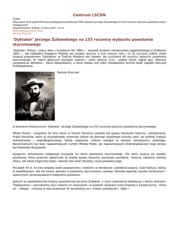 Centrum LSCDN Źródło: http://www.lscdn.pl/pl/informacja-pedagogiczn/publikacje/7585,Dyktator-Jerzego-Zulawskiego-na-153-rocznice-wybuchu-powstania-stycz niowego.html Wygenerowano: Sobota, 4 marca 2017, 14:23 Data publikacji 28.01.2016 Dariusz Kiszczak ‘Dyktator’ Jerzego Żuławskiego na 153 rocznicę wybuchu powstania styczniowego ‘Dyktator. Prolog i cztery akty z krwawych dni 1863 r.’ wyszedł drukiem Uniwersytetu Jagiellońskiego w Krakowie 1903 r., ale nakładem Księgarni Polskiej we Lwowie. Jeszcze w tym samym roku i to 22 stycznia (1903) miała miejsce prapremiera ‘Dyktatora’ w Teatrze Miejskim we Lwowie, dla uczczenia 40 rocznicy wybuchu powstania styczniowego. W rolach głównych wystąpili wybitni i znani aktorzy m.in.: Ludwik Solski zagrał gen. Mariana Langiewicza, Bohdana – Karol Adwentowicz, a Irena Solska (nie tylko młodopolska famme fatal) zagrała Henrykę Pustowojtównę. Dariusz Kiszczak O dramacie historycznym ‘Dyktator’ Jerzego Żuławskiego na 153 rocznicę wybuchu powstania styczniowego Młoda Polska - niespełna 30 letni okres w historii literatury polskiej był epoką niezwykle twórczą i wielobarwną. Prądy literackie, które ją ukształtowały zmierzały jednak do jednego wspólnego łożyska rzeki, do wielkiej tradycji wolnościowej i niepodległościowej, której wspaniały rozkwit nastąpił w okresie romantyzmu polskiego. Neoromantyzm był więc najważniejszym nurtem Młodej Polski, jak najważniejszym dramatopisarzem tego okresu był Stanisław Wyspiański. Apogeum romantyzmu krajowego przypada na okres powstania styczniowego. Dla wielu pisarzy po upadku powstania, które przecież zakończyło tę wielką epokę literacką, pozostało pamiętną historią, zapewne wielkiej ofiary, ale także tragicznej klęski, również idei walki zbrojnej, czynu powstańczego. Początek XX w. to kres kolejnej epoki pozytywizmu i realizmu w literaturze i pokolenia pisarzy, ludzi Kultury, którzy je współtworzyli. Ale nie koniec pamięci o powstaniu styczniowym, pamięci obrosłej legendą czynów heroicznych i walecznych, przekazywanych kolejnemu pokoleniu. Jednym ze spadkobierców tradycji powstańczej był Jerzy Żuławski, o czym zaświadcza dedykacja z tekstu dramatu: ‘Najlepszemu i ukochanemu ojcu mojemu te zasłyszane i w powieść związane echa krwawej a świętej burzy, którą on – chłopię – z bronią w reku przetrwał. W synowskiej czci i miłości poświęcam’. 1902 r. ‘Dyktator. Prolog i cztery akty z krwawych dni 1863 r.’ wyszedł drukiem Uniwersytetu Jagiellońskiego w Krakowie 1903 r., ale nakładem Księgarni Polskiej we Lwowie. Jeszcze w tym samym roku i to 22 stycznia (1903) miała miejsce prapremiera ‘Dyktatora’ w Teatrze Miejskim we Lwowie, dla uczczenia 40 rocznicy wybuchu powstania styczniowego. W rolach głównych wystąpili wybitni i znani aktorzy m.in.: Ludwik Solski zagrał gen. Mariana Langiewicza, Bohdana – Karol Adwentowicz, a Irena Solska (nie tylko młodopolska femme fatal) zagrała Henrykę Pustowojtównę. ‘Tuum fac et ne respicias finem’ (‘Rób swoje i nie patrz końca’) motto nie tylko dramatu ‘Dyktator’, ale i większości tekstów Jerzego Żuławskiego otwiera księgę wydarzeń z 1963: poprzedzających wybuch powstania styczniowego (prolog - dworek szlachecki w Sandomierskim) oraz zimowych miesięcy bitew i potyczek partii gen. Mariana Langiewicza: w Małgoszczy (akty 1 i 2) i Grochowiskami (akt 4); akt 3 przedstawia przyczyny decyzji i sam akt ogłoszenia Langiewicza dyktatorem powstania styczniowego. Struktura dzieła nawiązuje do budowy dramatu romantycznego (swobodna kompozycja, łamanie zasady decorum, fantastyczna i realistyczna motywacja wydarzeń, oniryzm czy wizyjność). W dramacie Żuławskiego istotny jest Prolog. Jest monologiem Nieznajomego, głosem postaci symbolicznej zapowiadającej spektakl powstańczych widm, dla których najważniejszą ideą było ‘za naszą wolność i za waszą’. Powstałe z grobów historyczne postaci mają przypomnieć współczesnemu pokoleniu pisarza ‘trzeźwych wnuków’ spuściznę wielkich i tragicznych ofiar. ‘Żuławskiego fascynuje problematyka czynu, splot trudności, jakim musi stawić czoła jednostka w walce o wolność, osobisty dramat wyboru w sytuacji tragicznej, a więc bez szans na pozytywny finał, tak jak nie miało szans powstanie roku 1863. A w związku z tym fascynuje umysłowość modernisty dramatyczne starcie historii z mitami polskiej kultury wypracowanymi przez romantyzm. Barbara Hirsz, Na rocznicę. ‘Dyktator’ Jerzego Żuławskiego ‘Pamiętnik Literacki : czasopismo kwartalne poświęcone historii i krytyce literatury polskiej’ 89/2, 93-107 s. 97. Opozycja pokoleniowa: ojcowie i dzieci, dziadkowie i wnuki jest w obecna w dramacie na kilku płaszczyznach: wpływach i dyskusjach na temat historii Polski. W akcie pierwszym, poprzedzającym wybuch powstania, postać Starego reprezentuje powstańców listopadowych i z tej perspektywy ocenia walkę zbrojną jako ‘krwawy Woli szaniec’. Podważa niejako możliwość zwycięstwa militarnego nad przeciwnikiem, ostrzega o kolejnych ofiarach. Atmosferę dworku szlacheckiego wypełnią nie tylko wspomnienia walk powstańczych 1831 i obawy, ale przede wszystkich przeczucia, wrażenia, lęki i mamidła odnoszące się do wielkich acz tragicznych najbliższych dni i miesięcy: ‘ Coś szczęknęło w lesie, mimo wichru słychać, krok, jak gdy kto niesie jaką ciężką…. Zdaje ci się pewno… Widzisz, i teraz wizję taką rzewną, taką świetlistą, rozkoszną, wyśnioną (Prolog, scena II). W Prologu wizje i niepokojące odgłosy nabierają kształtów realistycznych. Bohaterowie dzielą się wiadomościami o postaniu Rządu Narodowego w Warszawie, o restrykcyjnej wobec młodzieży brance do armii carskiej, o Puszczy Kampinoskiej pełnej zbiegów przed poborem, Postaci Ojca i Brata nie są skontrastowane, przeciwstawne, raczej odnoszą się do