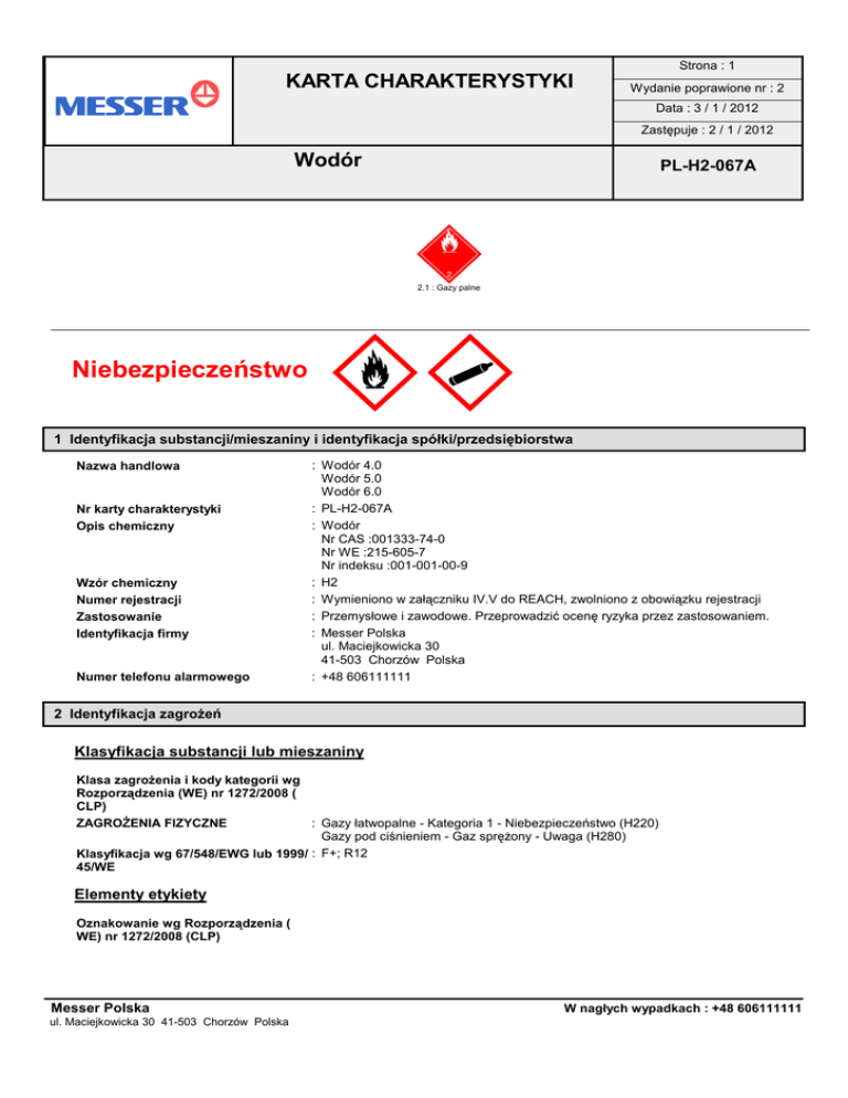 Strona : 1 KARTA CHARAKTERYSTYKI Wydanie poprawione nr : 2 Data : 3 / 1 / 2012 Zastępuje : 2 / 1 / 2012 Wodór PL-H2-067A m ó 2.1 : Gazy palne Niebezpieczeństwo —M M « 1 Identyfikacja substancji/mieszaniny i identyfikacja spółki/przedsiębiorstwa Nazwa handlowa Nr karty charakterystyki Opis chemiczny Wzór chemiczny Numer rejestracji Zastosowanie Identyfikacja firmy Numer telefonu alarmowego : Wodór 4.0 Wodór 5.0 Wodór 6.0 : PL-H2-067A : Wodór Nr CAS :001333-74-0 Nr WE :215-605-7 Nr indeksu :001-001-00-9 : H2 : Wymieniono w załączniku IV.V do REACH, zwolniono z obowiązku rejestracji : Przemysłowe i zawodowe. Przeprowadzić ocenę ryzyka przez zastosowaniem. : Messer Polska ul. Maciejkowicka 30 41-503 Chorzów Polska : +48 606111111 2 Identyfikacja zagrożeń Klasyfikacja substancji lub mieszaniny Klasa zagrożenia i kody kategorii wg Rozporządzenia (WE) nr 1272/2008 ( CLP) : Gazy łatwopalne - Kategoria 1 - Niebezpieczeństwo (H220) ZAGROŻENIA FIZYCZNE Gazy pod ciśnieniem - Gaz sprężony - Uwaga (H280) Klasyfikacja wg 67/548/EWG lub 1999/ : F+; R12 45/WE Elementy etykiety Oznakowanie wg Rozporządzenia ( WE) nr 1272/2008 (CLP) Messer Polska ul. Maciejkowicka 30 41-503 Chorzów Polska W nagłych wypadkach : +48 606111111 Strona : 2 KARTA CHARAKTERYSTYKI Wydanie poprawione nr : 2 Data : 3 / 1 / 2012 Zastępuje : 2 / 1 / 2012 Wodór PL-H2-067A 2 Identyfikacja zagrożeń (ciąg dalszy) Piktogramy określone Piktogramy określone Hasło ostrzegawcze Zwrot wskazujący rodzaj zagrożenia — M M « : Niebezpieczeństwo : H220 : Skrajnie łatwopalny gaz. H280 : Zawiera gaz pod ciśnieniem; ogrzanie grozi wybuchem. Zwrot wskazujący środki ostrożności : P210 : Przechowywać z dala od źródeł ciepła/iskrzenia/otwartego ognia/gorących - Zapobieganie powierzchni. – Palenie wzbronione. : P377 : W przypadku pożaru w wyniku wycieku gazu: Nie gasić, o ile nie można - Reagowanie bezpiecznie zahamować wycieku. P381 : Wyeliminować wszystkie źródła zapłonu, jeżeli jest to bezpieczne. : P403 : Przechowywać w dobrze wentylowanym miejscu. - Przechowywanie Oznakowanie wg 67/548/EWG lub 1999/45/WE : F+ : Produkt skrajnie łatwopalny Symbol(e) : R12 : Skrajnie łatwopalny. Zwrot(y) R : S9 : Przechowywać pojemnik w pomieszczeniu dobrze wentylowanym. Zwrot(y) S S16 : Nie przechowywać w pobliżu źródeł zapłonu - nie palić tytoniu. S33 : Zastosować środki ostrożności zapobiegające wyładowaniom elektrostatycznym. Inne zagrożenia : brak Inne zagrożenia 3 Skład/informacja o składnikach : Substancja. Substancja / Preparat Nazwa substancji Wodór : Zawartość 100 % Nr CAS 1333-74-0 Nr WE 215-605-7 Nr indeksu 001-001-00-9 Klasyfikacja NOTE 1 F+; R12 -----------------------------------------------Flam. Gas 1 (H220) Press. Gas (H280) nie zawiera innych składników lub zanieczyszczeń, które mogłyby mieć wpływ na klasyfikację produktu. Uwaga1 : Wymieniono w załączniku IV.V do REACH, zwolniono z obowiązku rejestracji Uwaga 2: Termin rejestracji nie upłynął Pełny tekst zwrotów R patrz sekcja 16. 4 Środki pierwszej pomocy Pierwsza pomoc - Wdychanie Messer Polska ul. Maciejkowicka 30 41-503 Chorzów Polska : Wysoka koncentracja gazu może spowodować uduszenie. Objawami mogą być utrata zdolności poruszania się oraz świadomości. Poszkodowany może nie zauważyć duszenia się. Wykorzystując aparaty oddechowe usunąć poszkodowaną osobę ze skażonego środowiska, przenieść na świeże powietrze. Ciepło okryć i zapewnić spokój. Wezwać lekarza. W przypadku zaniku oddechu zastosować sztuczne oddychanie. W nagłych wypadkach : +48 606111111 Strona : 3 KARTA CHARAKTERYSTYKI Wydanie poprawione nr : 2 Data : 3 / 1 / 2012 Zastępuje : 2 / 1 / 2012 Wodór PL-H2-067A 4 Środki pierwszej pomocy (ciąg dalszy) - Spożycie : Spożycie nie jest uważane za potencjalną drogę narażenia. 5 Postępowanie w przypadku pożaru Specyficzne zagrożenia Niebezpieczne produkty spalania Środki gaśnicze Odpowiednie środki gaśnicze Specjalistyczne metody Specjalny sprzęt ochronny dla strażaków : Narażenie na działanie ognia może spowodować rozerwanie / wybuch pojemnika. : brak : Mogą być stosowane wszystkie znane środki gaśnicze. : Zbiorniki narażone na działanie wysokiej temperatury chłodzić wodą z bezpiecznej odległości; jeśli to możliwe usunąć je z zagrożonego obszaru Nie gasić płomienia wypływającego gazu, chyba że jest to absolutnie konieczne. Może dojść do samoczynnego / wybuchowego powtórnego zapłonu. Gasić każdy inny pożar. : W zamkniętych pomieszczeniach stosować izolujące aparaty oddechowe. 6 Środki podejmowane w przypadku niezamierzonego uwolnienia do środowiska Indywidualne środki ostrożności Środki ostrożności w zakresie ochrony środowiska Metody oczyszczania : Przy wchodzeniu w obszar stosować izolujący aparat oddechowy chyba, że stwierdzono, iż atmosfera jest bezpieczna. Ewakuować teren. Zapewnić odpowiednią wentylację Należy uwzględnić ryzyko atmosfery wybuchowej. Wyeliminować źródła zapłonu. : Próbować zatrzymać wyciek. : Wentylować teren 7 Obchodzenie się z substancjami i mieszaninami oraz ich magazynowanie Obchodzenie się z materiałem Przechowywanie : Nie dopuścić do przedostania się wody do butli. Usunąć powietrze z układu przed wprowadzeniem gazu. Przedsięwziąć środki ostrożności zapobiegające statycznemu rozładowaniu. Zapobiegać powrotowi gazu do butli. Stosować tylko właściwie dobrane wyposażenie, które jest odpowiednie dla tego produktu, jego ciśnienia podawania i temperatury. W razie wątpliwości skontaktować się z dostawcą gazu. Trzymać z dala od źródeł zapłonu (włącznie z elektrycznością statyczną). Przestrzegać instrukcję dostawcy dotyczącą postępowania z pojemnikiem. : Przechowywać pojemnik w temperaturze poniżej 50°C w dobrze wentylowanym miejscu. Przechowywać z dala od gazów utleniających i innych środków utleniając