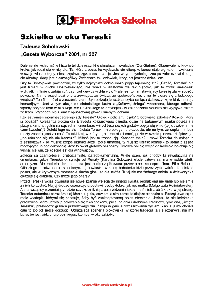 Szkieko w oku Tereski Tadeusz Sobolewski „Gazeta Wyborcza” 2001, nr 227 Dajemy si wcign w histori tej dziewczynki o ujmujcym wygldzie (Ola Gietner). Obserwujemy krok po kroku, jak rodzi si w niej zo. Ta, która z pocztku wydawaa si ofiar, w kocu staje si katem. Uwikana w swoje wasne bdy, nieszczliwa, zgwacona - zabija. Jest w tym psychologiczna prawda: czowiek staje si okrutny, kiedy jest nieszczliwy. Zwaszcza taki czowiek, który jest jeszcze dzieckiem. Czy to Dostojewski powiedzia, e tylko najwysze dobro moe poj tajemnic za? „Cze, Tereska” nie jest filmem w duchu Dostojewskiego, nie wnika w anatomi za tak gboko, jak to zrobi Kielowski w „Krótkim filmie o zabijaniu”, czy Królikiewicz w „Na wylot”- ale jest to film stawiajcy kwesti za w sposób powany. Na ile przychodzi ono z zewntrz, ze wiata, ze spoeczestwa, a na ile bierze si z ludzkiego wntrza? Ten film mówi o zaraeniu zem. Symbolizuje je rozbita szyba ranica dziewczynk w biaym stroju komunijnym. Jest w tym aluzja do diabelskiego lustra z „Królowej niegu” Andersena, którego odamki wpady przypadkiem w oko Kaja. Ale u Gliskiego to antybajka - w zakoczeniu szkieko nie wypywa razem ze zami. Wychodzi si z kina z opuszczon gow i suchymi oczami. Kto jest winien moralnej degrengolady Tereski? Ojciec - policjant i pijak? rodowisko szkolne? Koció, który j opuci? Koleanka zodziejka? Brzydota koszarowego osiedla, gdzie na betonowym murku pojada si pizz z kartonu, gdzie na ssiednim cmentarzu wród betonowych grobów popija si wino („pij duszkiem, nie czu kwacha”)? Defekt tego wiata - wiata Tereski - nie polega na brzydocie, ale na tym, e rzdzi nim bez reszty zasada „co za co”. To taki kraj, w którym ,,nie ma nic darmo”, gdzie w szkole pierwszaki piewaj: „ten umiech ci nic nie kosztuje”. Mio jest tu transakcj. Kochasz mnie? - mówi Tereska do chopaka z ssiedztwa - To musisz kogo ukara! Jeeli tobie ukradn, ty musisz ukra komu - to jedna z zasad rzdzcych t spoecznoci. Jest to wiat gboko bezbony: Tereska boi si wej do kocioa bo czuje si winna; nie wie, e koció jest dla winowajców. Zdjcia s czarno-biae, gruboziarniste, paradokumentalne. Wiele scen, jak choby ta rewelacyjna na cmentarzu, gdzie Tereska otrzymuje od Renaty (Karolina Sobczak) lekcj caowania, ma w sobie wielki autentyzm. Ale materia dokumentalna jest podporzdkowana przewrotnej koncepcji filmu. Film Roberta Gliskiego to odwrócenie katechetycznej powiastki, w której bohaterka idzie przez ycie wród diabelskich pokus, ale w krytycznym momencie sucha gosu anioa stróa. Tutaj nie ma adnego anioa, a dziewczynka okazuje si diabem. Czy moe jego ofiar? Przed Teresk wci otwieraj si nowe szanse wejcia do innego wiata, jednak ona nie umie lub nie mie z nich korzysta. Na jej drodze scenarzysta postawi osoby dobre, jak np. matka (Magorzata Roniatowska). Ale ci wszyscy rozumiejcy ludzie szybko znikaj z pola widzenia jakby nie mieli zrobi kroku w jej stron. Tereska natomiast coraz mielej kania si zu, zawiera z nim coraz cilejsze transakcje. Pocztkowo s to mae wystpki, którymi si popisuje, eby by zaakceptowan przez otoczenie. Jednak to nie koleanka grzesznica, która uczya j caowania si z chopakami, picia, palenia i drobnych kradziey, tylko ona, „wita Tereska”, przekroczy granic prawdziwego za. Zabija w gecie rozczarowania yciem. Zabija jakby chciaa cae to zo od siebie odrzuci. Odraajca sceneria blokowiska, w której tragedia ta si rozgrywa, nie ma barw, bo jest widziana przez kogo, kto nosi w oku szkieko. www.filmotekaszkolna.pl