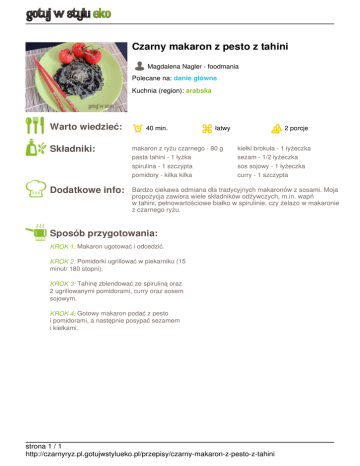Czarny makaron z pesto z tahini Magdalena Nagler - foodmania Polecane na: danie główne Kuchnia (region): arabska Warto wiedzieć: 40 min. łatwy 2 porcje Składniki: makaron z ryżu czarnego - 80 g pasta tahini - 1 łyżka spirulina - 1 szczypta pomidory - kilka kilka Dodatkowe info: Bardzo ciekawa odmiana dla tradycyjnych makaronów z sosami. Moja propozycja zawiera wiele składników odżywczych, m.in. wapń w tahini, pełnowartościowe białko w spirulinie, czy żelazo w makaronie z czarnego ryżu. kiełki brokuła - 1 łyżeczka sezam - 1/2 łyżeczka sos sojowy - 1 łyżeczka curry - 1 szczypta Sposób przygotowania: KROK 1: Makaron ugotować i odcedzić. KROK 2: Pomidorki ugrillować w piekarniku (15 minut/ 180 stopni). KROK 3: Tahinę zblendować ze spiruliną oraz 2 ugrillowanymi pomidorami, curry oraz sosem sojowym. KROK 4: Gotowy makaron podać z pesto i pomidorami, a następnie posypać sezamem i kiełkami. strona 1 / 1 http://czarnyryz.pl.gotujwstylueko.pl/przepisy/czarny-makaron-z-pesto-z-tahini Powered by TCPDF (www.tcpdf.org)