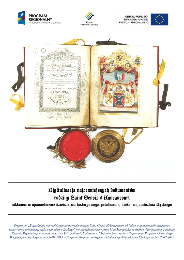 Digitalizacja najcenniejszych dokumentów rodziny Saint Genois d'Anneaucourt wkładem w upamiętnienie dziedzictwa historycznego południowej części województwa śląskiego Projekt pn. „Digitalizacja najcenniejszych dokumentów rodziny Saint Genois d’Anneaucourt wkładem w upamiętnienie dziedzictwa historycznego południowej części województwa śląskiego” jest współfinansowany przez Unię Europejską ze środków Europejskiego Funduszu Rozwoju Regionalnego w ramach Priorytetu IV „Kultura”, Działanie 4.1 Infrastruktura kultury Regionalnego Programu Operacyjnego Województwa Śląskiego na lata 2007-2013 – Programu Rozwoju Subregionu Południowego Województwa Śląskiego na lata 2007-2013 ARCHIVUM FAMILIAE SAINT GENOIS D’ANNEAUCOURT - historyczna charakterystyka zbioru archiwalnego W roku 1999 Jadwiga Roik z Jaworza podjęła szerokie historyczne badania dotyczące historii swej miejscowości wspólnie z Ryszardem Stanclikiem z Towarzystwa Miłośników Jaworza i Mariuszem Makowskim z Muzeum Śląska Cieszyńskiego. Badania te skoncentrowały się wokół roli i znaczenia dla historii Jaworza rodów Laszowskich i Saint Genois d’Anneaucourt. Kwerenda archiwalno-muzealna oraz terenowe poszukiwania doprowadziły do nawiązania kontaktu z żyjącymi w Austrii żeńskimi spadkobiercami tych rodów, w których posiadaniu znajdowało się cenne rodowe Archiwum. Rozmowy i ustalenia przeprowadzone pomiędzy spadkobiercami Saint Genois a Urzędem Gminy w Jaworzu i Muzeum Śląska Cieszyńskiego w Cieszynie doprowadziły do przekazania w formie depozytu Gminie Jaworze i Muzeum Archiwum rodowego. Nastąpiło to dnia 24.08.2005 roku w formie uroczystego podpisania Umowy Depozytu. Zbiory Archiwum znalazły swe miejsce w Muzeum Śląska Cieszyńskiego przy ul. Regera 6 w Cieszynie (Depozyt sygn. MC/Dep./680/1-89), kustoszem Archiwum został Mariusz Makowski. W skład Archiwum, liczącego 96 jednostek archiwalnych, wchodzą akta genealogiczne, rodzinne, majątkowe hrabiów Saint Genois oraz spokrewnionych i spowinowaconych z nimi szlacheckich rodzin, m.in. Cselestów z Cselestiny, Laszowskich z Laszowa, Logauów ze Starej Wsi, Trachów z Brzezia, Pröcklów z Proksdorfu czy Dworzaków z Boru. Są to dyplomy herbowe, kontrakty kupna-sprzedaży, korespondencja, drzewa genealogiczne, portrety, fotografie, akta gospodarcze, kroniki i inne. Akta te pochodzą z lat 1429–1976, a w odpisach od 1301 roku. Dotyczą w starszej części całego Śląska oraz terenów Francji, Hiszpanii i obecnej Belgii, zaś z XVIII i XIX wieku również Polski, Czech i Austrii. Archiwum zostało uporządkowane, zinwentaryzowane i umieszczone w profesjonalnych tekach i pudłach w muzealnym magazynie. W 2006 r. najcenniejszy zbiór dokumentów pergaminowych dzięki środkom finansowym Gminy Jaworze został poddany zabiegom konserwatorskim w Książnicy Cieszyńskiej (prace te przeprowadziły Łucja Brzerzycka i Anna Fedrizzi-Szostok). W 2009 roku Gmina Jaworze wraz z cieszyńskim Muzeum przystąpiła do realizacji projektu „Digitalizacja najcenniejszych dokumentów rodziny Saint Genois d’Anneaucourt wkładem w upamiętnienie dziedzictwa historycznego południowej części województwa śląskiego” współfinansowanego ze środków Europejskiego Funduszu Rozwoju Regionalnego w ramach RPO WSL 2007-2013. Efektem realizacji tego projektu jest digitalizacja Archiwum, jego opracowanie w formie list identyfikacyjnej, katalogu archiwaliów oraz niniejszego opisu Archiwum i jego charakterystyki. Ród Saint-Genois d’Anneaucourt należał do jednych z najstarszych belgijskich szlacheckich rodzin. Ich siedziby znajdowały się w regionie Hainaut (Hennegau) w zachodniej Belgii, pomiędzy Courtnay a Tournay, który wówczas podlegał królestwu Francji. Początki rodu datowane są na koniec XIII wieku. W roku 1280 protoplasta rodu Jean de Saint Genois złożył w kapitule w Denain dowody swego szlachectwa. Jean III de Saint Genois, który w 1396 r. walczył przeciwko Turkom u boku Jana Nieustraszonego, otrzymał od niego herb. Towarzyszył także burgundzkiemu księciu Filipowi Dobremu podczas wyprawy krzyżowej, za co wynagrodzony został dominium Grand-Breucqe. Jego wnuk Simon de Saint Genois – pułkownik króla Francji, a równocześnie cesarski szambelan, był w 1464 roku wyniesiony przez cesarza Fryderyka III do stanu baronowskiego. Ród Saint Genois podzielił się w połowie XVI wieku na dwie linie, starszą belgijską i młodszą śląską. Założycielem belgijskiej linii był Arnold III (zmarły 1586), którego wnuk Charles François I otrzymał w 1655 roku od hiszpańskiego króla tytuł hrabiego, potwierdzony przez cesarza w 1786 roku. Ród kontynuował jego bratanek Nicolas François, który otrzymał tytuł hrabiowski w roku 1676. Gałąź ta żyła w Belgi, gdzie posiadała liczne dobra. Kiedy François Joseph VI (zmarły 1816) ożenił się z hrabianką Marią Anną von Morzin (zmarła 1821), ród częściowo przeniósł się do Czech, gdzie w Pradze urodził się ostatni przedstawiciel tej gałęzi po mieczu, hrabia Rudolf Saint Genois (17901876). Młodsza, śląska linia, wywodziła się od Jeana IV. Jego wnuk, baron Filip VII Karol Saint Genois d’Anneaucourt (zmarły 1683), oficer w służbie cesarskiej, podczas wojny trzydziestoletniej dostał się do Księstwa Cieszyńskiego. Przez ożenek z Heleną Pröckl von Procksdorf (1633-1703) - córką Maksymiliana, sekretarza ostatniej cieszyńskiej Piastówny, księżnej Elżbiety Lukrecji – został właścicielem wsi Bażanowice, zakupił kilka innych majątków, a przede wszystkim wszedł w szeregi cieszyńskiej szlachty. Ród ten niebawem rozrósł się, poczynił liczne koligacje z cieszyńską szlachtą i stał się właścicielem wielu dóbr w Księstwie Cieszyńskim. Jego wnuk Arnold baron Saint Genois (1734-1804) poprzez ożenek z Julią Beatą Laszowską herbu Nałęcz w 1793 roku wszedł w posiadanie Jaworza. Julia odziedziczyła J
