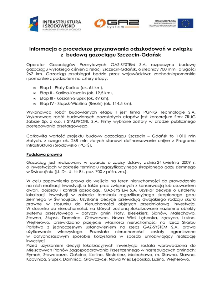 Informacja o procedurze przyznawania odszkodowań w związku z budową gazociągu Szczecin-Gdańsk Operator Gazociągów Przesyłowych GAZ-SYSTEM S.A. rozpoczyna budowę gazociągu wysokiego ciśnienia relacji Szczecin-Gdańsk, o średnicy 700 mm i długości 267 km. Gazociąg przebiegał będzie przez województwa: zachodniopomorskie i pomorskie z podziałem na cztery etapy: • • • • Etap I - Płoty-Karlino (ok. 64 km), Etap II - Karlino-Koszalin (ok. 19,5 km), Etap III - Koszalin-Słupsk (ok. 69 km), Etap IV - Słupsk-Wiczlino (Reszki) (ok. 114,5 km). Wykonawcą robót budowlanych etapu I jest firma PGNIG Technologie S.A. Wykonawcą robót budowlanych pozostałych etapów jest konsorcjum firm: ZRUG Zabrze Sp. z o.o. i STALPROFIL S.A. Firmy wybrane zostały w drodze publicznego postępowania przetargowego. Całkowita wartość projektu budowy gazociągu Szczecin – Gdańsk to 1 010 mln złotych, z czego ok. 268 mln złotych stanowi dofinansowanie unijne z Programu Infrastruktura i Środowisko (POIiŚ). Podstawa prawna Gazociąg jest realizowany w oparciu o zapisy Ustawy z dnia 24 kwietnia 2009 r. o inwestycjach w zakresie terminalu regazyfikacyjnego skroplonego gazu ziemnego w Świnoujściu (j.t. Dz. U. Nr 84, poz. 700 z późn. zm.). W celu zapewnienia prawa do wejścia na teren nieruchomości do prowadzenia na nich realizacji inwestycji, a także prac związanych z konserwacją lub usuwaniem awarii, dojazdu i kontroli gazociągu, GAZ-SYSTEM S.A. uzyskał decyzje o ustaleniu lokalizacji inwestycji w zakresie terminalu regazfikacyjnego skroplonego gazu ziemnego w Świnoujściu. Uzyskane decyzje przewidują dwojakiego rodzaju skutki prawne w stosunku do nieruchomości objętych przedmiotową inwestycją. W stosunku do nieruchomości, na których zostaną zlokalizowane naziemne obiekty systemu przesyłowego – dotyczy gmin Płoty, Biesiekierz, Sianów, Malechowo, Sławno, Słupsk, Damnica, Główczyce, Nowa Wieś Lęborska, Łęczyce, Luzino, Wejherowo, przewidziano przejęcie własności nieruchomości na rzecz Skarbu Państwa z jednoczesnym ustanowieniem na rzecz GAZ-SYSTEM S.A. prawa użytkowania wieczystego. Pozostałe nieruchomości zostały ograniczone w dotychczasowym sposobie korzystania w sposób umożliwiający realizację inwestycji. Przed uzyskaniem decyzji lokalizacyjnych inwestycja została wprowadzona do Miejscowych Planów Zagospodarowania Przestrzennego w następujących gminach: Rymań, Sławoborze, Gościno, Karlino, Biesiekierz, Malechowo, m. Sławno, Sławno, Kobylnica, Słupsk, Damnica, Główczyce, Nowa Wieś Lęborska, Luzino, Wejherowo. Ostateczna decyzja Wojewody Zachodniopomorskiego i Pomorskiego o ustaleniu lokalizacji inwestycji ograniczająca Właściciela lub Użytkownika wieczystego nieruchomości w dotychczasowym sposobie jej korzystania, stanowi podstawę do dokonania wpisu w księdze wieczystej. Część z Właścicieli nieruchomości/Użytkowników wieczystych w gminach: Płoty, Rymań, Słowenkowo, Gościno i Karlino przed wejściem w życie w/w specustawy gazowej zawarła z Inwestorem umowy o ustanowieniu służebności przesyłu oraz umowy o udostępnieniu gruntu w celu budowy infrastruktury technicznej celu publicznego. Umowy te zachowują swą ważność i będą realizowane przez Inwestora. Ponadto również dla przedmiotowej Inwestycji Wojewoda Zachodniopomorski i Wojewoda Pomorski wydali decyzje o pozwoleniu na budowę. Decyzja o ustaleniu lokalizacji inwestycji, wydana w trybie ustawy z dnia 24 kwietnia 2009 roku o inwestycjach w zakresie terminalu regazyfikacyjnego skroplonego gazu ziemnego w Świnoujściu (j. t. Dz. U. z 2009 r. nr 84, poz. 700 z póź. zm.), zapewnia GAZSYSTEM S.A. prawo dysponowania nieruchomościami na cele budowlane i stanowi podstawę po wykonaniu robót budowlanych do wszczęcia i prowadzenia postępowania administracyjnego w sprawie ustalenia odszkodowania przez Wojewodę Zachodniopomorskiego i Pomorskiego. W stosunku do nieruchomości ograniczonych w dotychczasowym sposobie korzystania, zgodnie z rozporządzeniem Ministra Gospodarki z dnia 30 lipca 2001 roku w sprawie warunków technicznych, jakim powinny odpowiadać sieci gazowe (DZ.U. nr 97, poz. 1055) dla realizowanego gazociągu Szczecin-Gdańsk, Wojewoda Zachodniopomorski i Wojewoda Pomorski wyznaczyli strefę kontrolowaną 12metrową (po 6 metrów od osi gazociągu) poza terenami leśnymi oraz 4 metry (po 2 metry od osi gazociągu na stronę) w terenach leśnych. W strefie tej nie wolno wznosić budynków, urządzać stałych składów i magazynów, sadzić drzew oraz podejmować działalności mogącej zagrozić trwałości gazociągu podczas eksploatacji. Na okres budowy gazociągu zajęciu podlegać będzie pas montażowy o szerokości 26 metrów poza obszarami leśnymi (z obowiązkiem doprowadzenia terenu, po zakończeniu budowy, do stanu poprzedniego) oraz 18-metrowym w terenach leśnych, a w lasach na terenach szczególnie chronionych pas montażowy zawężono do 10,5 metrów. Procedura ustalenia odszkodowań Tryb postępowania mającego na celu ustalenie odszkodowania z tytułu szkód spowodowanych budową infrastruktury gazowej rozpoczyna pisemne zawiadomienie Właściciela nieruchomości/Użytkownika wieczystego przez Inwestora o rozpoczęciu robót budowlanych i terminie zajęcia nieruchomości. Przystępując do realizacji inwestycji, po uprzednim zawiadomieniu Właściciela nieruchomości/Użytkownika wieczystego o rozpoczęciu budowy, zostanie wytyczona przez geodetę trasa gazociągu i zasięg placu budowy. Następnie zostanie sporządzony protokół komisyjnego opisu stanu nieruchomości i powstałych szkód w związku z budową gazociągu. Protokół ma na celu zinwentaryzowanie nieruchomości przed rozpoczęciem budowy oraz po jej zakończeniu, pod kątem istniejących upraw, znajdującej się zieleni, w tym drzew i krzewów, oraz innych elementów zagospodarowania działki oraz szkód powstałych w związku z przeprowadzoną budową. Z
