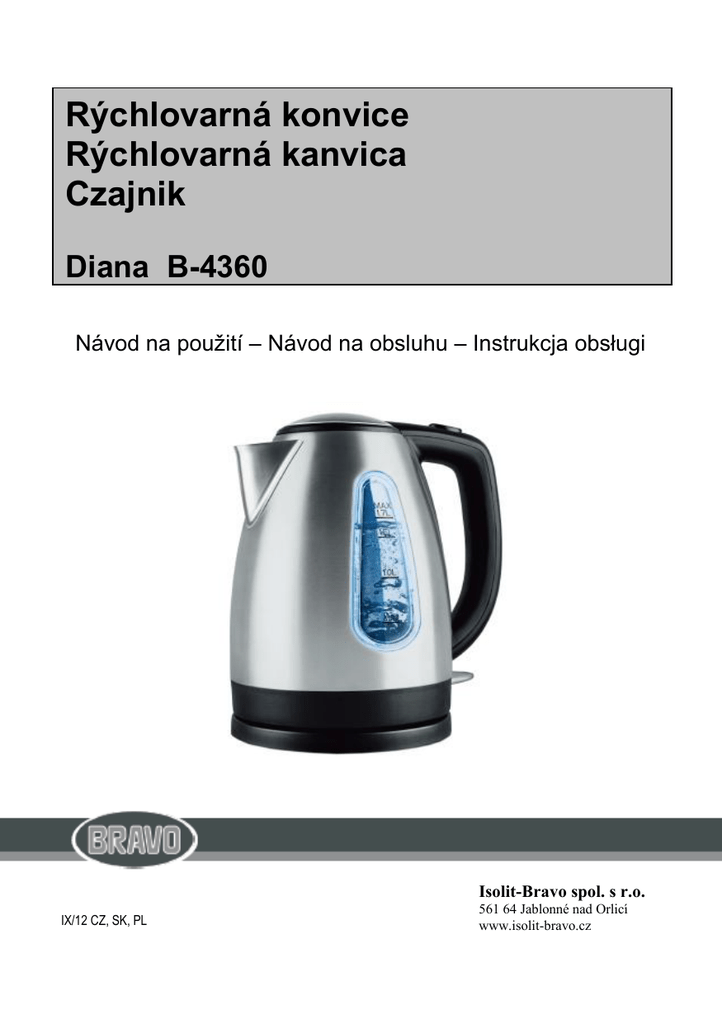 ČESKY................................................................................. ...SLOVENSKY... .... ............. Rýchlovarná konvice Rýchlovarná kanvica Czajnik Diana B-4360 Návod na použití – Návod na obsluhu – Instrukcja obsługi Isolit-Bravo spol. s r.o. 561 64 Jablonné nad Orlicí www.isolit-bravo.cz IX/12 CZ, SK, PL -1- ČESKY................................................................................. ...SLOVENSKY... ČESKY………………...........................................................3 - 10 SLOVENSKY ……………....................................................3 - 10 SEZNAM SERVISŮ/ZOZNAM SERVISOV ……………… 9 - 10 POLSKI .............................................................................11 - 13 WYKAZ SERVISOW………………………………………….……14 KARTA GWARANCYJNA.........................................................15 ZÁRUČNÍ LIST/ ZÁRUČNÝ LIST.............................................16 -2- .... ............. ČESKY................................................................................. ...SLOVENSKY... .... ............. Vážíme si, že jste si pořídili tento výrobek a věříme, že Vám bude dlouhá léta dobrým pomocníkem. Vážime si, že ste si zaobstarali tento výrobok a veríme, že Vám bude dlhé roky dobrým pomocníkom. Předpokládané použití: Rychlovarná konvice je určena k vaření pitné vody. Nesmí být použita k ohřevu jiných tekutin (víno, ovocné šťávy, apod.). Tento spotřebič je určen pro použití v domácnosti a podobných prostorech jako jsou: kuchyňské kouty v obchodech, kancelářích a ostatních pracovištích spotřebiče používané v zemědělství spotřebiče používané hosty v hotelích a motelech a jiných obytných oblastech spotřebiče používané v podnicích zajišťujících nocleh se snídaní Bezpečnostní upozornění: • Přečtěte si, prosím, před použitím konvice všechny instrukce v návodu. Uschovejte si návod pro možnost pozdějšího použití. • Přístroj není určen pro používání osobami (včetně dětí), jimž fyzická, smyslová, nebo mentální neschopnost či nedostatek zkušeností a znalostí zabraňuje v bezpečném používání přístroje, pokud na ně nebude dohlíženo, nebo pokud nebyly instruovány ohledně použití přístroje osobou zodpovědnou za jejich bezpečnost. • Napájecí přívod veďte mimo prostory, kde se chodí a jezdí! • Pokud konvici nepoužíváte, odpojte ji od el. sítě vyjmutím vidlice napájecího přívodu ze zásuvky! • Napájecí přívod chraňte před ostrými hranami. • Ujistěte se, že napětí na typovém štítku souhlasí s napětím v síti v místě připojení. • Je-li konvice přeplněna, může dojít k vystříknutí horké vody. • Konvici používejte jen k účelům, ke kterým je určena a jak je popsáno v návodu. Jiné použití než je doporučeno výrobcem může způsobit požár nebo úraz elektrickým proudem. • Konvici používejte pouze s dodanou základnou, který musí být vždy suchý a čistý. Základnu nedávejte na kovový povrch nebo na kovový podnos, pokud je konvice připojena v síti. Základnu nelze používat k jiným účelům. • Konvice by měla být vypnuta před zapojením a vypojením ze sítě. Nikdy netahejte za napájecí přívod při vytahování vidlice ze zásuvky. • Konvici nezapínejte, pokud v ní není voda, jinak může dojít k poškození topného tělesa. • Konvici umisťujte na pevný a stabilní povrch, který odolává zvýšené teplotě. Jinak používejte ochrannou podložku. • Konvici nepoužívejte v blízkosti plynových hořáků, Predpokladané použitie: Rýchlovarná kanvica je určená na varenie pitnej vody. Nesmie byť použitá na ohrev iných tekutín (víno, ovocné šťavy, apod). Tento spotrebič je je určený pre použitie v domácnosti a podobných priestoroch ako sú: Kuchynské kúty v obchodoch, kanceláriách a ostatných pracoviskách Spotrebiče používané v poľnohospodárstve Spotrebiče používané hosťami v hoteloch a moteloch a iných obytných oblastiach Spotrebiče používanév podnikoch zabezpečujúce nocľah s raňajkami. Bezpečnostné upozornenie: • Prečítajte si, prosím, pred použitím kanvice všetky inštrukcie v návode. Uschovajte si návod pre možnosť neskoršieho použitia. • Prístroj nie je určený pre používanie osobami (vrátane detí), ktorým fyzická, zmyslová, alebo mentálna neschop nosť či nedostatok skúseností a znalostí zabraňuje v bezpečnom používaní prístroja, pokiaľ na ne nebude dohliadané, alebo pokiaľ neboli inštruované ohľadne použitia prístroja osobou zodpovednou za ich bezpečnosť. • Nap. prívod veďte mimo priestory, kade sa chodí a jazdí! • Pokiaľ kanvicu nepoužívate, odpojte ju od el. siete vytiahnutím vidlice napájacieho prívodu zo zásuvky! • Napájací prívod chráňte pred ostrými hranami. • Uistite sa, že napätie na typovom štítku súhlasí s napätím v sieti v mieste pripojenia • Ak je kanvica preplnená, môže dôjsť k vystreknutiu horúcej vody. • Kanvicu používajte len k účelom, ku ktorým je určená a ako je popísané v návode. Iné použitie než je doporučené výrobcom môže spôsobiť požiar alebo úraz el. prúdom. • Kanvicu používajte len s dodaným podstavcom, ktorý musí byť vždy suchý a čistý. Podstavec nedávajte na kovový povrch alebo na kovový podnos, pokiaľ je kanvica pripojená v sieti. Podstavec sa nedá používať k iným účelom. • Kanvica by mala byť vypnutá pred zapojením a vypojením zo siete. Nikdy neťahajte za napájací prívod pri vyťahovaní vidlice zo zásuvky. • Kanvicu nezapínajte, pokiaľ v nej nie je voda, inak môže dôjsť k poškodeniu varného telesa. • Kanvicu umiestňujte na pevných a stabilných povrchoch, ktoré odolávajú zv