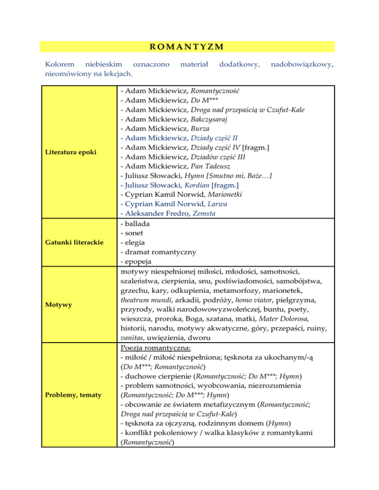 ROMANTYZM Kolorem niebieskim oznaczono nieomówiony na lekcjach. Literatura epoki Gatunki literackie Motywy Problemy, tematy materiał dodatkowy, nadobowiązkowy, - Adam Mickiewicz, Romantyczność - Adam Mickiewicz, Do M*** - Adam Mickiewicz, Droga nad przepaścią w Czufut-Kale - Adam Mickiewicz, Bakczysaraj - Adam Mickiewicz, Burza - Adam Mickiewicz, Dziady część II - Adam Mickiewicz, Dziady część IV [fragm.] - Adam Mickiewicz, Dziadów część III - Adam Mickiewicz, Pan Tadeusz - Juliusz Słowacki, Hymn [Smutno mi, Boże…] - Juliusz Słowacki, Kordian [fragm.] - Cyprian Kamil Norwid, Marionetki - Cyprian Kamil Norwid, Larwa - Aleksander Fredro, Zemsta - ballada - sonet - elegia - dramat romantyczny - epopeja motywy niespełnionej miłości, młodości, samotności, szaleństwa, cierpienia, snu, podświadomości, samobójstwa, grzechu, kary, odkupienia, metamorfozy, marionetek, theatrum mundi, arkadii, podróży, homo viator, pielgrzyma, przyrody, walki narodowowyzwoleńczej, buntu, poety, wieszcza, proroka, Boga, szatana, matki, Mater Dolorosa, historii, narodu, motywy akwatyczne, góry, przepaści, ruiny, vanitas, uwięzienia, dworu Poezja romantyczna: - miłość / miłość niespełniona; tęsknota za ukochanym/-ą (Do M***; Romantyczność) - duchowe cierpienie (Romantyczność; Do M***; Hymn) - problem samotności, wyobcowania, niezrozumienia (Romantyczność; Do M***; Hymn) - obcowanie ze światem metafizycznym (Romantyczność; Droga nad przepaścią w Czufut-Kale) - tęsknota za ojczyzną, rodzinnym domem (Hymn) - konflikt pokoleniowy / walka klasyków z romantykami (Romantyczność) - podróż, tułaczka, kontemplacja przyrody (Sonety krymskie; Hymn) - poznawanie swojego „ja”, wędrówka w głąb siebie (Sonety krymskie; Hymn) - odkrywanie sensu świata, dociekanie istoty bytu (Sonety krymskie; Hymn; Marionetki; Romantyczność) Dziadów część IV Adama Mickiewicza: - portret bohatera werterycznego (Gustaw) - przeżywanie nieszczęśliwej miłości, cierpienia duchowe - przyczyny i okoliczności samobójstwa Gustawa Dziadów część III Adama Mickiewicza: - portret bohatera romantycznego (Konrad) - metamorfoza bohatera - martyrologia narodu polskiego zilustrowana w opowieściach więźniów oraz historii Cichowskiego i Rollisona - koncepcja poety romantycznego; poeta-kreator, poetademiurg; rola poezji - idea prometeizmu niepodległościowego - postawa Konrada i Księdza Piotra wobec Boga - walka dobra ze złem; walka o duszę Konrada – psychomachia - koncepcja zbawienia świata (według Wielkiej Improwizacji oraz Widzenia Księdza Piotra) - problem mesjanizmu narodowego (hasło: „Polska Chrystusem narodów”) - portret, postawy i ocena narodu polskiego – „towarzystwo stolikowe” i „towarzystwo przy drzwiach” - problem władzy; despotyzm carski - rola świata nadprzyrodzonego - mechanizmy rządzące historią - problem winy i kary Pan Tadeusz Adama Mickiewicza: - portret zbiorowy szlachty - ojczyzna, mała ojczyzna, arkadia - idealizacja przyrody - spór, kłótnia, walka, bitwa - miłość, romans, małżeństwo, zaręczyny - Soplicowo jako wzór dworu szlacheckiego - Jacek Soplica jako synteza losów narodu polskiego i bohater romantyczny - rola przedmiotów, rekwizytów, pamiątek Pojęcia kluczowe Ikoniczne teksty kultury Literatura pomocnicza (opracowania) romantyzm, irracjonalizm, ludowość, orientalizm, mistycyzm, profetyzm, epistemologia, weltschmerz, bohater werteryczny (werteryzm), bohater romantyczny, prometeizm, martyrologia, mesjanizm, synkretyzm, oniryzm, psychomachia, improwizacja, idealizacja, ironia romantyczna, tragizm, szekspiryzm - Johann Heinrich Füssli, Szaleństwo Kate - Caspar David Friedrich, Wędrowiec ponad chmurami - Caspar David Friedrich, Dwaj mężczyźni obserwujący księżyc - Théodore Géricault, Tratwa „Meduzy” - Caspar David Friedrich, Opactwo w dąbrowie - Ludwig Ferdinand Schnorr von Carolsfeld, Upadek ze skały - Michał Elwiro Andriolli, wybór grafik do Pana Tadeusza - Julian Antonisz, Pan Tadeusz. Księga I. Gospodarstwo [film] - Maria Janion, Projekt krytyki fantazmatycznej [fragm.] - Marta Piwińska, Miłość romantyczna [fragm.] - Alina Kowalczykowa, Zasmucający urok ruin [fragm.] - Alina Witkowska, [Pielgrzym w świecie natury] - Jan Błoński, Polski raj [fragm.] - Alina Witkowska, Mickiewicz. Słowo i czyn [fragm.] - Stanisław Falkowski, Arka (Po co i jak „Pan Tadeusz” uczy bycia sobą?) [fragm.] - Maria Janion, Zmierzch paradygmatu [fragm.] - Stanisław Makowski, Ludowość romantyczna [fragm.] - Jerzy Grotowski, [„Dziady” jako model teatru nowoczesnego]