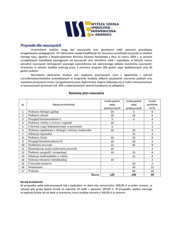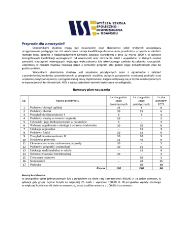 Przyroda dla nauczycieli Uczestnikami studiów mogą być nauczyciele oraz absolwenci szkół wyższych posiadający przygotowanie pedagogiczne. Ich ukończenie nadaje kwalifikacje do nauczania przedmiotu przyroda w szkołach różnego typu, zgodnie z Rozporządzeniem Ministra Edukacji Narodowej z dnia 12 marca 2009 r. w sprawie szczegółowych kwalifikacji wymaganych od nauczycieli oraz określenia szkół i wypadków, w których można zatrudnić nauczycieli niemających wyższego wykształcenia lub ukończonego zakładu kształcenia nauczycieli. Uczestnicy w ramach studiów realizują przez 3 semestry program 300 godzin zajęć dydaktycznych oraz 60 godzin praktyk. Warunkiem ukończenia studiów jest uzyskanie pozytywnych ocen z egzaminów i zaliczeń z przedmiotów/modułów przewidzianych w programie studiów, odbycie pozytywnie ocenionej praktyki oraz uzyskanie pozytywnej oceny z przygotowanej pracy dyplomowej. Zajęcia odbywają się w trybie niestacjonarnym w wyznaczonych terminach (ok. 40% z wykorzystaniem technik kształcenia na odległość). Ramowy plan nauczania Lp. Nazwa przedmiotu 1 2 3 4 5 6 7 8 9 10 11 12 13 14 15 16 17 Podstawy biologii ogólnej Podstawy chemii Przegląd bioróżnorodności I Podstawy wiedzy o świecie i regionie Człowiek i jego funkcjonowanie w przyrodzie Wybrane zagadnienia z ekologii i ochrony środowiska Edukacja regionalna Podstawy fizyki Przegląd bioróżnorodności II Dydaktyka przyrody Ekonomiczne teorie zachowania przyrody Podstawy geografii i oceanologii Edukacja multimedialna w szkole Ochrona własności intelektualnej Ćwiczenia terenowe Seminarium Praktyka Razem Liczba godzin zajęć teoretycznych 15 10 5 10 5 10 10 10 15 10 10 10 120 Liczba godzin zajęć praktycznych 5 15 5 10 15 15 10 45 15 15 10 20 60 240 Liczba punktów ECTS 6 6 4 2 2 6 3 6 5 9 2 6 4 2 2 15 10 90 Koszty kształcenia: W przypadku opłat jednorazowych lub z podziałem na dwie raty semestralne: 900,00 zł za jeden semestr, w sytuacji gdy grupa będzie liczyła co najmniej 25 osób + wpisowe 100,00 zł. W przypadku wpłaty czesnego w większej liczbie rat niż dwie w semestrze, koszt studiów wzrasta o 100,00 zł za semestr.