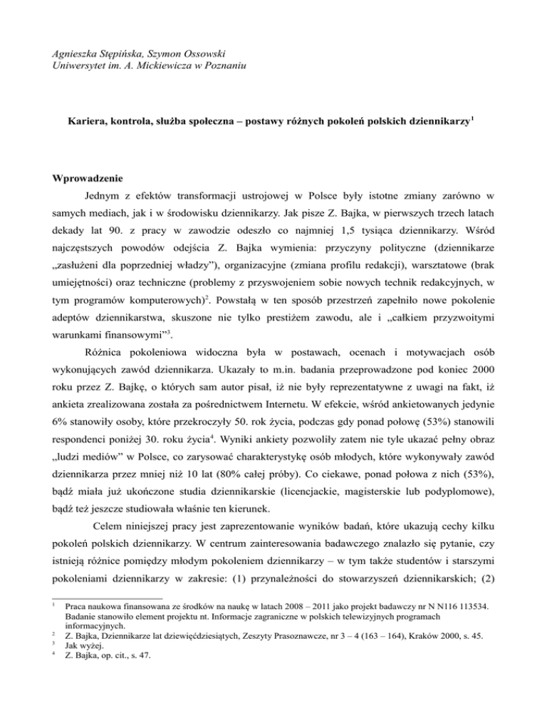 Agnieszka Stępińska, Szymon Ossowski Uniwersytet im. A. Mickiewicza w Poznaniu Kariera, kontrola, służba społeczna – postawy różnych pokoleń polskich dziennikarzy 1 Wprowadzenie Jednym z efektów transformacji ustrojowej w Polsce były istotne zmiany zarówno w samych mediach, jak i w środowisku dziennikarzy. Jak pisze Z. Bajka, w pierwszych trzech latach dekady lat 90. z pracy w zawodzie odeszło co najmniej 1,5 tysiąca dziennikarzy. Wśród najczęstszych powodów odejścia Z. Bajka wymienia: przyczyny polityczne (dziennikarze „zasłużeni dla poprzedniej władzy”), organizacyjne (zmiana profilu redakcji), warsztatowe (brak umiejętności) oraz techniczne (problemy z przyswojeniem sobie nowych technik redakcyjnych, w tym programów komputerowych)2. Powstałą w ten sposób przestrzeń zapełniło nowe pokolenie adeptów dziennikarstwa, skuszone nie tylko prestiżem zawodu, ale i „całkiem przyzwoitymi warunkami finansowymi”3. Różnica pokoleniowa widoczna była w postawach, ocenach i motywacjach osób wykonujących zawód dziennikarza. Ukazały to m.in. badania przeprowadzone pod koniec 2000 roku przez Z. Bajkę, o których sam autor pisał, iż nie były reprezentatywne z uwagi na fakt, iż ankieta zrealizowana została za pośrednictwem Internetu. W efekcie, wśród ankietowanych jedynie 6% stanowiły osoby, które przekroczyły 50. rok życia, podczas gdy ponad połowę (53%) stanowili respondenci poniżej 30. roku życia4. Wyniki ankiety pozwoliły zatem nie tyle ukazać pełny obraz „ludzi mediów” w Polsce, co zarysować charakterystykę osób młodych, które wykonywały zawód dziennikarza przez mniej niż 10 lat (80% całej próby). Co ciekawe, ponad połowa z nich (53%), bądź miała już ukończone studia dziennikarskie (licencjackie, magisterskie lub podyplomowe), bądź też jeszcze studiowała właśnie ten kierunek. Celem niniejszej pracy jest zaprezentowanie wyników badań, które ukazują cechy kilku pokoleń polskich dziennikarzy. W centrum zainteresowania badawczego znalazło się pytanie, czy istnieją różnice pomiędzy młodym pokoleniem dziennikarzy – w tym także studentów i starszymi pokoleniami dziennikarzy w zakresie: (1) przynależności do stowarzyszeń dziennikarskich; (2) 1 2 3 4 Praca naukowa finansowana ze środków na naukę w latach 2008 – 2011 jako projekt badawczy nr N N116 113534. Badanie stanowiło element projektu nt. Informacje zagraniczne w polskich telewizyjnych programach informacyjnych. Z. Bajka, Dziennikarze lat dziewięćdziesiątych, Zeszyty Prasoznawcze, nr 3 – 4 (163 – 164), Kraków 2000, s. 45. Jak wyżej. Z. Bajka, op. cit., s. 47. form zatrudnienia; (3) ocena organizacji medialnej, (4) ocena poziomu swobody w doborze tematów, (5) poziomu zadowolenia z pracy, (6) ważności poszczególnych aspektów pracy dziennikarza, (7) ważność zadań mediów. Ponadto, przeprowadzona została analiza wpływu wykształcenia dziennikarskiego na ocenę ważności poszczególnych zadań mediów. Próba badawcza Prezentowane dane pochodzą z wywiadów przeprowadzonych w grupie 329 dziennikarzy pracujących w mediach o zasięgu ogólnokrajowym (gazety, tygodniki i miesięczniki, stacje radiowe, kanały telewizyjne oraz agencje prasowe i media on line). Ankieta została przeprowadzona przez Pentor Research International Poznań na zlecenie autorów tej pracy na przełomie października i listopada 2009 roku. Z uwagi na poważne trudności z ustaleniem nawet szacunkowej liczby osób wykonujących zawód dziennikarza w Polsce5, próba została skonstruowana w oparciu o dane dotyczące liczby organizacji medialnych danego typu podane w Almanachu Mediów i Reklamy (2007/2008). Przyjmując jako zasadę procentową reprezentację poszczególnych typów mediów obliczono, iż 12 procent próby powinni stanowić dziennikarze codziennej prasy drukowanej, 23 procent – dziennikarze z tygodników, 23 procent – z miesięczników, 15 procent – dziennikarze telewizyjni, 17 procent – radiowi, 8 procent – dziennikarze pracujący dla mediów internetowych oraz 1 procent – dziennikarze pracujący dla agencji informacyjnych. Pierwotnie zakładana liczba wywiadów wynosiła 300. Z uwagi jednak na trudności związane z dostępem do dziennikarzy telewizyjnych, zebrane przez Pentor dane zawierały jedynie 5 procent, zamiast zakładanych 15 procent, danych pochodzących od tej grupy ludzi mediów. Stąd też, autorzy artykułu skontaktowali się z grupą 30 losowo wybranych dziennikarzy telewizyjnych z prośbą o wypełnienie tej samej ankiety 6. Dzięki temu możliwe stało się osiągnięcie zakładanego składu próby, reprezentatywnego dla środowiska polskich dziennikarzy. Profil demograficzny polskich dziennikarzy W pierwszej kolejności warto przyjrzeć się cechom społeczno – demograficznym dziennikarzy polskich. O ile wśród badanych w roku 2000 przez Z. Bajkę dziennikarzy, 35% stanowiły kobiety, o tyle w prezentowanym badaniu kobiety stanowiły łącznie ponad 41% ankietowanych. Co więcej, jak pokazują dane zebrane w Tabeli 1, proporcje te różnią się w zależności od typu mediów. I tak, największa reprezentacja kobiet charakteryzuje agencje informacyjne i miesięczniki, podczas gdy najmniejsza: media on-line oraz tygodniki. Dane te 5 6 Z. Bajka podaje, iż w początkach 1990 roku liczbę dziennikarzy szacowano na ponad 11 tys., zaś 10 lat później około 18 – 20 tysięcy. Zob. Z. Bajka, op. cit., s. 42. Z grupy wspomnianych 30 osób, jedna odmówiła udziału w badaniu. odzwierciedlają w pewnym stopniu strukturę rynku prasy drukowanej, na którym wśród najpoczytniejszych miesięczników dominują tytuły skierowane do kobiet, podczas gdy wśród najpoczytniejszych tygodników znaleźć można także tytuły popularne wśród mężczyzn i przez mężczyzn w dużym stopniu redagowane (m. in. Angora, Newsweek, Auto Świat, czy też Wprost)7. Z badań wynika także, iż najmłodsi są dziennikarze 
