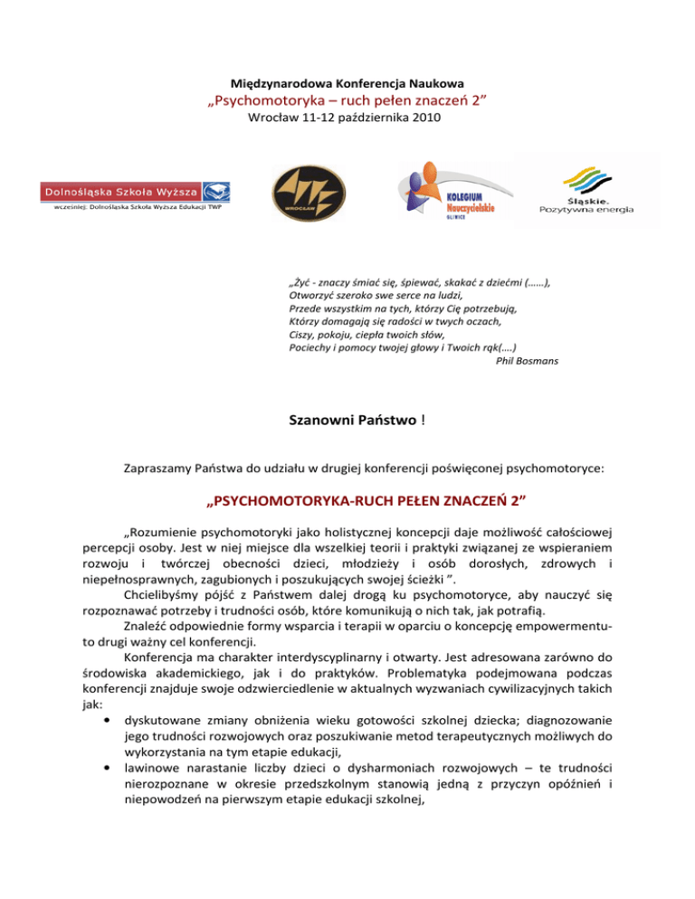 Międzynarodowa Konferencja Naukowa „Psychomotoryka – ruch pełen znaczeń 2” Wrocław 11-12 października 2010 „Żyć - znaczy śmiać się, śpiewać, skakać z dziećmi (……), Otworzyć szeroko swe serce na ludzi, Przede wszystkim na tych, którzy Cię potrzebują, Którzy domagają się radości w twych oczach, Ciszy, pokoju, ciepła twoich słów, Pociechy i pomocy twojej głowy i Twoich rąk(….) Phil Bosmans Szanowni Państwo ! Zapraszamy Państwa do udziału w drugiej konferencji poświęconej psychomotoryce: „PSYCHOMOTORYKA-RUCH PEŁEN ZNACZEŃ 2” „Rozumienie psychomotoryki jako holistycznej koncepcji daje możliwość całościowej percepcji osoby. Jest w niej miejsce dla wszelkiej teorii i praktyki związanej ze wspieraniem rozwoju i twórczej obecności dzieci, młodzieży i osób dorosłych, zdrowych i niepełnosprawnych, zagubionych i poszukujących swojej ścieżki ”. Chcielibyśmy pójść z Państwem dalej drogą ku psychomotoryce, aby nauczyć się rozpoznawać potrzeby i trudności osób, które komunikują o nich tak, jak potrafią. Znaleźć odpowiednie formy wsparcia i terapii w oparciu o koncepcję empowermentuto drugi ważny cel konferencji. Konferencja ma charakter interdyscyplinarny i otwarty. Jest adresowana zarówno do środowiska akademickiego, jak i do praktyków. Problematyka podejmowana podczas konferencji znajduje swoje odzwierciedlenie w aktualnych wyzwaniach cywilizacyjnych takich jak: • dyskutowane zmiany obniżenia wieku gotowości szkolnej dziecka; diagnozowanie jego trudności rozwojowych oraz poszukiwanie metod terapeutycznych możliwych do wykorzystania na tym etapie edukacji, • lawinowe narastanie liczby dzieci o dysharmoniach rozwojowych – te trudności nierozpoznane w okresie przedszkolnym stanowią jedną z przyczyn opóźnień i niepowodzeń na pierwszym etapie edukacji szkolnej, zwiększone ryzyko chorób cywilizacyjnych, zmian zwyrodnieniowych i chorób układu krążenia powoduje konieczność podjęcia działań profilaktycznych i promujących ruch jako sposób na utrzymanie zdrowia i właściwej kondycji w każdym okresie życia, • urzeczywistnienie idei edukacji włączającej wiąże się z potrzebą poszukiwania takich metod pracy grupowej, które wyzwalałyby kreatywność i gotowość do współdziałania wszystkich dzieci Właśnie psychomotoryka może zainspirować do rozwiązania zasygnalizowanych problemów oraz pomóc „(…)otworzyć szeroko swe serce na ludzi(…)”. W konferencji wezmą udział wybitni specjaliści z Polski, Austrii i Niemiec. Referat inauguracyjny wygłosi prof. Renate Zimmer z Uniwersytetu w Osnabrück. • Informacje organizacyjne a) udział czynny: opłata konferencyjna wynosi 500 zł lub 150 Euro (uczestnicy zagraniczni). W tej cenie mieści się: publikacja, czynny udział w obradach, uczestnictwo w 2 warsztatach, materiały konferencyjne, obiady, uroczysta kolacja. b) udział bierny: opłata wynosi 300 zł Cena obejmuje: udział w obradach plenarnych, 2 warsztatach oraz obiady Uroczysta kolacja płatna dodatkowo 100zł. Tematyka warsztatów dnia 11.10.2010 r.: 1. Metoda Dobrego Startu w pracy z dzieckiem o specjalnych potrzebach edukacyjnych (Polska- prof. M. Bogdanowicz) 2. Wizualizacja i praca z ciałem w trosce o dobrostan człowieka dorosłego (Polska- prof. L. Kulmatycki) 3. Psychomotoryczne gry i zabawy z małą ilością materiału - warsztat adresowany do fachowców pracujących z dziećmi o specjalnych potrzebach edukacyjnych w wieku 611 lat (Niemcy - dr A. Majewski) 4. Budowanie mostów ku ludziom z demencją(Austria- mgr T. Zak) 5. Terapia psychomotoryczna dziecka z dysharmonią rozwojową (Belgia- mgr B. Zychowicz ) 6. Motopedagogika porusza ciało i umysł dziecka z ADHD ( Austria - mgr E. Gstöttner) Prosimy o przesłanie wypełnionego formularza oraz abstraktu do dnia 15 maja 2010 roku pocztą elektroniczną na adres: [email protected] Streszczenie max. 400 wyrazów, format MS Word. Wszyscy uczestnicy konferencji mają możliwość skorzystania z noclegów (płatne dodatkowo z własną rezerwacją na hasło „PSYCHOMOTORYKA”) Proponowane hotele: • • • „Duet” ul. Św. Mikołaja 47-48, 230 zł nocleg, (ze śniadaniem) „Diament” ul. Muchoborska 10, 200 zł nocleg, (ze śniadaniem) „Wieniawa” ul. Gajowicka 130, 160 zł nocleg, (ze śniadaniem). Opłatę konferencyjną proszę przekazać do dnia 30 czerwca 2010 r. na numer konta: 33 1090 2402 0000 0006 1001 1564 BZ WBK XIII odział we Wrocławiu Dolnośląska Szkoła Wyższa, ul. Wagonowa 9, 53-609 Wrocław Ważne: w tytule wpłaty należy podać: „Konferencja Psychomotoryka” oraz dane personalne osoby, której wpłata dotyczy. Miejsce konferencji: Dolnośląska Szkoła Wyższa, gmach Wydziału Nauk Pedagogicznych, ul. Strzegomska 55, Wrocław. Komitet Naukowy Konferencji: Dr hab. Małgorzata Sekułowicz, prof. DSW Prof. dr hab. Julian Migasiewicz Prof. dr hab. Marek Woźniewski Dr hab. Marek Heine, prof. DSW Dr hab. Lesław Kulmatycki, prof. AWF Dr Jerzy Lipowczyk Komitet organizacyjny: Dr Marzena Tomko-Gwoździewicz - przewodnicząca Dr Bożena Bartosik Dr Agata Nowak Mgr Maria Flanczewska-Wolny Mgr Jolanta Gnitecka Mgr Aneta Kochanowicz – sekretarz (kontakt: 660-275-957) Mgr Anna Suchon Przewodnicząca Komitetu Naukowego dr hab. Joanna Kruk-Lasocka, prof. DSW