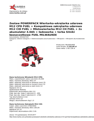KARBA B.Karczewski i Wspólnicy Sp.J. ul. Fabryczna 14 53-609 Wrocław Zapraszamy do sklepu www.karba.com.pl tel. +48 71 724-24-65 tel. +48 71 718-20-03 Zestaw POWERPACK Wiertarko-wkrętarka udarowa M12 CPD FUEL + Kompaktowa zakrętarka udarowa M12 CID FUEL + Młotowiertarka M12 CH FUEL + 2x akumulator 4.0Ah + ładowarka + torba Silniki bezszczotkowe FUEL MILWAUKEE kod produktu: 4933447307 kategoria: Główne kategorie > Elektronarzędzia akumulatorowe > Wkrętarki > Wkrętarki akumulatorowe 12V Producent: MILWAUKEE Cena brutto: 2 235,60 zł Cena netto: 1 817,56 zł Dane techniczne Wkrętarki M12 CPD: Maks. częstotliwość udaru (ud./min) 25,500 Maks. moment obrotowy (Nm) 37 Maks. zdolność wiercenia w drewnie (mm) 25 Maks. zdolność wiercenia w murach (mm) 13 Maks. zdolność wiercenia w stali (mm) 13 Napięcie (V) 12 Opakowanie Walizka Pojemność akumulatora (Ah) 2.0 Pręd. bez obc. bieg 1 (obr/min) 0 - 450 Pręd. bez obc. bieg 2 (obr/min) 0 - 1700 Typ akumulatora Li-ion Uchwyt (mm) 13 Waga z akumulatorem (kg) 1.3 Dane techniczne Zakrętarki M12 CID: Częst. udaru (ud./min) 2700/3550 Maks. moment obrotowy (Nm) 19/135 Napięcie (V) 12 Pojemność akumulatora (Ah) 2 Ah strona: 1/2 wydrukowano: 04-03-2017 http://www.karba.com.pl/zestaw-powerpack-wiertarko-wkretarka-udarowa-m12-cpd-fuel-kompaktowa-zakretarka-udarowa Prędkość bez obciążenia (obr/min) 1200/2650 Typ akumulatora Li-ion Dane techniczne Młotowiertarki M12 CH: Moc udaru 1,1J 2 tryby pracy z udarem lub bez Niskie wibracje 4,3 m/s² Wiercenie do 13mm Silnik 12V Obrotu 0-900 i 0-6200 obr/min Bezszczotkowy silnik POWERSTATE™ zaprojektowany i zbudowany przez Milwaukee® daje do 10x dłuższą żywotność silnika, do 2x większą siłę oraz do 2x więcej czasu pracy Inteligentna elektronika Milwaukee® REDLINK PLUS™: dostarcza najbardziej zaawansowane cyfrowe zabezpieczenie przeciążeniowe dla narzędzia i akumulatora i wyjątkowo zwiększa wydajność narzędzia pod obciążeniem Akumulator REDLITHIUM-ION™ zapewnia do 20% większą siłę, do 2x więcej czasu pracy, do 2x większą trwałość oraz działa do -20° C w porównaniu do innych technologii litowo-jonowych Indywidualne monitorowanie cel optymalizuje czas pracy narzędzia i zapewnia długotrwałą żywotność baterii Zestaw zawiera: Kompaktowa wiertarko-wkrętarka M12 CPD FUEL Kompaktowa zakrętarka udarowa M12 CID FUEL Młotowiertarka SDS-Plus M12 CH FUEL 2x akumulator M12 4.0 Ah Ładowarka 80min Torba Wymagana rejestracja na stronie producenta strona: 2/2 wydrukowano: 04-03-2017 http://www.karba.com.pl/zestaw-powerpack-wiertarko-wkretarka-udarowa-m12-cpd-fuel-kompaktowa-zakretarka-udarowa