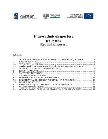 Przewodnik eksportera po rynku Republiki Austrii Spis treści 1. 1.1. 1.2. 1.3. 2. 2.1. 2.2. 2.3. 2.4. 2.5. 3. 4. 4.1. WSPÓŁPRACA GOSPODARCZA POLSKI Z REPUBLIKĄ AUSTRII................... 2 SPECYFIKA RYNKU................................................................................................... 2 WYMIANA HANDLOWA ........................................................................................... 2 MOŻLIWOŚCI EKSPORTOWE BRANŻ I TOWARÓW (W RAMACH JEDNOLITEGO RYNKU EUROPEJSKIEGO) ........................................................... 5 KWESTIE PRAWNE .................................................................................................... 6 SYSTEM PODATKOWY ............................................................................................. 6 ZAMÓWIENIA PUBLICZNE ...................................................................................... 7 OCHRONA WŁASNOŚCI PRZEMYSŁOWEJ ......................................................... 10 ROZSTRZYGANIE SPORÓW, WINDYKACJA NALEŻNOŚCI ............................ 10 DOSTĘP DO RYNKU................................................................................................. 11 PRZEDSIĘWZIĘCIA TARGOWO – WYSTAWIENNICZE .................................... 12 WAŻNE ADRESY I LINKI ........................................................................................ 12 AMBASADA RP I POZOSTAŁE PLACÓWKI DYPLOMATYCZNE .................... 12 1 1. WSPÓŁPRACA GOSPODARCZA POLSKI Z REPUBLIKĄ AUSTRII 1.1. SPECYFIKA RYNKU Republika Austrii jest państwem położonym w Europie Środkowej. Austria jest federacją dziewięciu krajów związkowych o populacji ponad 8.3 mln. Od stycznia 1995 r. jest członkiem Unii Europejskiej. Należy też do strefy Euro. Austria jest krajem uprzemysłowionym, z małym rynkiem wewnętrznym. Dlatego handel zagraniczny jest tu szczególnie ważny. Do najważniejszych partnerów handlowych należą: Niemcy, Włochy, USA, Szwajcaria i Francja. 1.2. WYMIANA HANDLOWA Handel zagraniczny odgrywa w gospodarce Austrii kluczową rolę. W przypadku eksportu jest on gwarantem utrzymania wielu miejsc pracy. Co drugie miejsce pracy w Austrii zależy bezpośrednio lub pośrednio od dostaw towarów i usług do zagranicznych odbiorców. Według wyliczeń Austriackiej Federalnej Izby Gospodarczej (Wirtschaftskammer Österreich) każde 5 EUR, spośród 10 wypracowanych w gospodarce narodowej, pochodzi z eksportu realizowanego przez austriackie firmy uczestniczące w międzynarodowej wymianie towarowej. Zauważalna od lata malejąca liczba nowych zamówień z zagranicy znalazła odzwierciedlenie w danych eksportowych. Wprawdzie odnotowano wzrost eksportu towarów jeszcze we wrześniu o widoczne 8,7%, to jednocześnie nastąpił spadek o ponad 3% w stosunku do poprzedniego miesiąca. Import spadł nawet o 5% w stosunku do sierpnia, ale był na plusie o 7,7% do poprzedniego roku. W ciągu pierwszych 9 miesięcy 2011r. eksport towarów austriackich wzrósł do 91,1mld euro i tym samych był o 14,2% większy niż w roku 2010 r. Import wzrósł w tym czasie nawet o 17,3% do 97,1mld euro. Po 9 miesiącach deficyt w bilansie handlowym podwoił się w stosunku do roku poprzedniego na prawie 6mld euro. Powstały brak równowagi w handlu towarami dotyczy prawie wyłącznie handlu z krajami Unii Europejskiej, natomiast handel z krajami spoza UE był prawie całkowicie zrównoważony. Wymiana handlowa Polska – Austria Austriacka gospodarka, a szczególnie wymiana towarowa i współpraca inwestycyjna, jest bardzo mocno powiązana z Unią Europejską, w tym z nowymi krajami członkowskimi takimi jak Polska. Rokrocznie do nowych członków Unii Europejskiej trafia ok. jedna piąta austriackiego eksportu, a inwestycje austriackich firm w tych krajach ciągle rosną. Polski eksport do Austrii w 2011 roku szacowany jest na 2,34 miliardów Euro (wzrost o 23%), polski import z Austrii w 2011 roku szacowany jest na 3,35 miliardów Euro (wzrost o 21,8 %) 2 Zaprezentowane dane wskazują na rekordowe obroty w handlu zagranicznym pomiędzy Polską i Austrią. Pomimo ogólnoświatowej recesji gospodarczej wymiana handlowa w 2011 roku osiągnęła wolumen 5,6 - 5, 7 miliarda Eur, i należy do najwyższej jaką te dwa kraje osiągnęły. Istotnym czynnikiem jest również ponad 20 procentowy wzrost wzajemnych obrotów ( eksport - wzrost o 23%, import wzrost o 21,8 Polski handel zagraniczny z Austrią w tys. Euro Eksport styczeńgrudz. [(T)..tymczasowo (O)...ostatecznie] styczeńgrudz. styczeńgrudz. Import styczeńwrzes. styczeńwrzes. styczeńgrudz. styczeńgrudz. styczeńgrudz. styczeńwrzes. styczeńwrzes. 2008 (O) 2009 (O) 2010 (O) 2010 (O) 2011 (T) 2008 (O) 2009 (O) 2010 (O) 2010 (O) 2011 (T) 0 żywność i żyjące zwierzęta 1 Napoje i tytoń 247.228 164.210 169.627 118.361 147.505 110.882 109.606 121.308 88.424 101.195 24.286 41.390 62.303 45.784 73.570 16.945 7.695 7.994 4.670 10.398 2 Surowce (poza żywnością i paliwami mineral.) 3 Paliwa mineralne, smary 4 Zwierzęce i roślinne oleje, tłuszcze, wosk 5 Produkty chemiczne inne niewymienione 6 Towary przetworzone 7 Maszyny, urządzenia mech. i pojazdy 8 Inne wyroby gotowe 9 Towary inne niewymienione Razem 76.391 48.180 69.586 52.003 59.260 29.222 25.568 33.194 23.917 27.557 454.946 219.322 295.930 235.783 320.148 32.507 17.955 24.131 17.078 23.801 5.843 10.319 13.800 8.258 7.082 8.261 8.961 7.086 5.569 3.763 105.987 118.712 128.804 96.348 129.147 430.549 411.363 470.310 343.245 443.905 461.390 296.609 415.126 308.633 433.142 890.047 649.921 803.938 580.306 729.975 494.943 414.873 464.322 328.853 423.071 1.434.490 936.587 985.798 689.330 956.859 270.719 241.474 272.431 199.698 228.052 301.504 254.817 270.849 192.112 251.558 2.931 5.007 3.942 2.856 15.960 16.290 25.526 20.558 11.838 26.997 2.144.664 1.560.096 1.895.871 1.396.577 1.836.937 3.270.697 2.448.000 2.745.165 1.956.491 2.576.006 WYMIANA HANDLOWA POLSKA - AUSTRIA OKRES / LATA Polsk