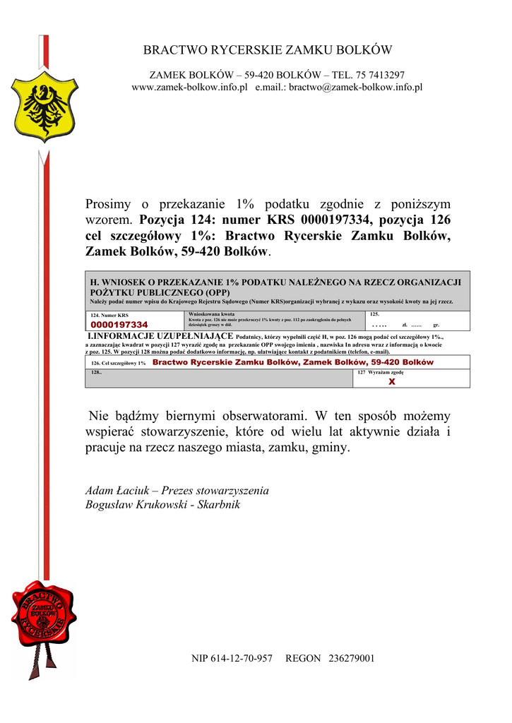 BRACTWO RYCERSKIE ZAMKU BOLKÓW ZAMEK BOLKÓW – 59-420 BOLKÓW – TEL. 75 7413297 www.zamek-bolkow.info.pl e.mail.: [email protected] Prosimy o przekazanie 1% podatku zgodnie z poniższym wzorem. Pozycja 124: numer KRS 0000197334, pozycja 126 cel szczegółowy 1%: Bractwo Rycerskie Zamku Bolków, Zamek Bolków, 59-420 Bolków. H. WNIOSEK O PRZEKAZANIE 1% PODATKU NALEŻNEGO NA RZECZ ORGANIZACJI POŻYTKU PUBLICZNEGO (OPP) Należy podać numer wpisu do Krajowego Rejestru Sądowego (Numer KRS)organizacji wybranej z wykazu oraz wysokość kwoty na jej rzecz. 124. Numer KRS 0000197334 Wnioskowana kwota 125. Kwota z poz. 126 nie może przekroczyć 1% kwoty z poz. 112 po zaokrągleniu do pełnych dziesiątek groszy w dół. ….. zł. …… gr. I.INFORMACJE UZUPEŁNIAJĄCE Podatnicy, którzy wypełnili część H, w poz. 126 mogą podać cel szczegółowy 1%., a zaznaczając kwadrat w pozycji 127 wyrazić zgodę na przekazanie OPP swojego imienia , nazwiska In adresu wraz z informacją o kwocie z poz. 125. W pozycji 128 można podać dodatkowo informację, np. ułatwiające kontakt z podatnikiem (telefon, e-mail). 126. Cel szczegółowy 1% Bractwo Rycerskie Zamku Bolków, Zamek Bolków, 59-420 Bolków 127 Wyrażam zgodę 128.. X Nie bądźmy biernymi obserwatorami. W ten sposób możemy wspierać stowarzyszenie, które od wielu lat aktywnie działa i pracuje na rzecz naszego miasta, zamku, gminy. Adam Łaciuk – Prezes stowarzyszenia Bogusław Krukowski - Skarbnik NIP 614-12-70-957 REGON 236279001