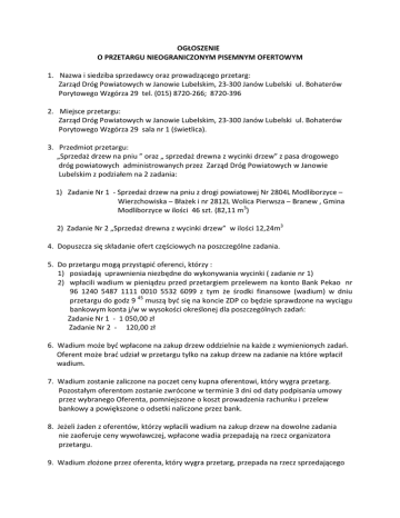 OGŁOSZENIE O PRZETARGU NIEOGRANICZONYM PISEMNYM OFERTOWYM 1. Nazwa i siedziba sprzedawcy oraz prowadzącego przetarg: Zarząd Dróg Powiatowych w Janowie Lubelskim, 23-300 Janów Lubelski ul. Bohaterów Porytowego Wzgórza 29 tel. (015) 8720-266; 8720-396 2. Miejsce przetargu: Zarząd Dróg Powiatowych w Janowie Lubelskim, 23-300 Janów Lubelski ul. Bohaterów Porytowego Wzgórza 29 sala nr 1 (świetlica). 3. Przedmiot przetargu: „Sprzedaż drzew na pniu ” oraz „ sprzedaż drewna z wycinki drzew” z pasa drogowego dróg powiatowych administrowanych przez Zarząd Dróg Powiatowych w Janowie Lubelskim z podziałem na 2 zadania: 1) Zadanie Nr 1 - Sprzedaż drzew na pniu z drogi powiatowej Nr 2804L Modliborzyce – Wierzchowiska – Błażek i nr 2812L Wolica Pierwsza – Branew , Gmina Modliborzyce w ilości 46 szt. (82,11 m3) 2) Zadanie Nr 2 „Sprzedaż drewna z wycinki drzew” w ilości 12,24m3 4. Dopuszcza się składanie ofert częściowych na poszczególne zadania. 5. Do przetargu mogą przystąpić oferenci, którzy : 1) posiadają uprawnienia niezbędne do wykonywania wycinki ( zadanie nr 1) 2) wpłacili wadium w pieniądzu przed przetargiem przelewem na konto Bank Pekao nr 96 1240 5487 1111 0010 5532 6099 z tym że środki finansowe (wadium) w dniu przetargu do godz 9 45 muszą być się na koncie ZDP co będzie sprawdzone na wyciągu bankowym konta j/w w wysokości określonej dla poszczególnych zadań: Zadanie Nr 1 - 1 050,00 zł Zadanie Nr 2 - 120,00 zł 6. Wadium może być wpłacone na zakup drzew oddzielnie na każde z wymienionych zadań. Oferent może brać udział w przetargu tylko na zakup drzew na zadanie na które wpłacił wadium. 7. Wadium zostanie zaliczone na poczet ceny kupna oferentowi, który wygra przetarg. Pozostałym oferentom zostanie zwrócone w terminie 3 dni od daty podpisania umowy przez wybranego Oferenta, pomniejszone o koszt prowadzenia rachunku i przelew bankowy a powiększone o odsetki naliczone przez bank. 8. Jeżeli żaden z oferentów, którzy wpłacili wadium na zakup drzew na dowolne zadania nie zaoferuje ceny wywoławczej, wpłacone wadia przepadają na rzecz organizatora przetargu. 9. Wadium złożone przez oferenta, który wygra przetarg, przepada na rzecz sprzedającego Regulamin Sprzedaży drzew na pniu z pasa drogowego dróg powiatowych Powiatu Janowskiego administrowanych przez Zarząd Dróg Powiatowych w Janowie Lubelskim Przedmiotem przetargu jest „„Sprzedaż drzew na pniu ” oraz „ sprzedaż drewna z wycinki drzew” z pasa drogowego dróg powiatowych administrowanych przez Zarząd Dróg Powiatowych w Janowie Lubelskim z podziałem na 2 zadania: 1) Zadanie Nr 1 - Sprzedaż drzew na pniu z drogi powiatowej Nr 2804L Modliborzyce – Wierzchowiska – Błażek i nr 2812L Wolica Pierwsza – Branew , Gmina Modliborzyce w ilości 46 szt. (82,11 m3) 2) Zadanie Nr 2 „Sprzedaż drewna z wycinki drzew” w ilości 12,24m3 1. Dopuszcza się składanie ofert częściowych na poszczególne zadania. 2. Drzewa przeznaczone do wycinki i sprzedaży „na pniu” określone w zadaniu nr 1 zostały oznaczone kolejnymi numerami farbą koloru pomarańczowego 3. Masa drzew w poszczególnych zadaniach została oszacowana przez uprawnionego brakarza i jest ostateczna. 4. Lokalizacja, gatunek oraz masa ogółem w rozbiciu na poszczególne sortymenty drewna wykazana jest w „Wykazie drzew przeznaczonych do wycinki w roku 2015”, stanowiącym integralną część regulaminu. 5. Sprzedaż drewna z wycinki drzew określona w zadaniu Nr 2 nastąpi po wycince drzew z drogi powiatowej Nr 2802L Zarajec – Potok Wielki przez Wykonawcę robót budowlanych który realizował będzie przebudowę drogi . Masa drewna ujęta w tym zadaniu obejmuje tylko sprzedaż drewna użytkowego. 6. Do przetargu mogą przystąpić oferenci, którzy : 1) posiadają uprawnienia niezbędne do wykonywania wycinki drzew (zadanie nr 1) 2) wpłacili wadium w pieniądzu przed przetargiem przelewem na konto Bank Pekao nr 96 1240 5487 1111 0010 5532 6099, z tym że środki finansowe (wadium) w dniu przetargu do godz. 9 45 muszą być na koncie ZDP co będzie sprawdzone na wyciągu bankowym z w/w konta, w wysokości określonej dla poszczególnych zadań: Zadanie Nr 1 - 1 050,00 zł Zadanie Nr 2 - 120,00 zł 7. Wadium może być wpłacone na zakup drzew oddzielnie na każde z wymienionych zadań. Oferent może brać udział w przetargu tylko na zakup drzew na zadanie na które wpłacił wadium. 8. Wadium zostanie zaliczone na poczet ceny kupna oferentowi, który wygra przetarg. Pozostałym oferentom zostanie zwrócone w terminie 3 dni od daty podpisania umowy przez wybranego Oferenta, pomniejszone o koszt prowadzenia rachunku i przelew bankowy a powiększone o odsetki naliczone przez bank. 9. Jeżeli żaden z oferentów, którzy wpłacili wadium na zakup drzew na pniu na zadania nr 1 lub na zakup drewna na zadanie nr 2 nie zaoferuje ceny wywoławczej, wpłacone wadia przepadają na rzecz organizatora przetargu. 10. Wadium złożone przez oferenta, który wygra przetarg, przepada na rzecz sprzedającego w przypadku: - nie zapłacenia ceny nabycia w ustalonym terminie - nie podpisania umowy sprzedaży. 11. Cena wywoławcza wynosi odpowiednio: Zadanie Nr 1 – 10 717,95 zł Zadanie Nr 2 - 1 254,20 zł 12. Wszelkie koszty związane z pozyskaniem zakupionego drzewa tj. zabezpieczenie i oznakowanie terenu przyległego na czas wycinki drzew i uprzątnięcia gałęzi, wypłata odszkodowań za ewentualne szkody wyrządzone podczas wycinki, ewentualne wyłączenia linii energetycznych lub telekomunikacyjnych oraz uprzątnięcie drzew i gałęzi ponosi Kupujący. 13. Uprawniony do kontaktów z oferentami : Kazimiera Duda tel. (15) 87 20 266; 87 03 96 w dni robocze tj. poniedziałek - piątek w godz.800 - 1400 14. Oferty należy złożyć w zamkniętej kopercie opieczętowanej i opatrzonej napisem: „Sprzedaż drzew na pniu– Zadanie nr 1” lub „ Sprzedaż drewna z wycinki drzew – 