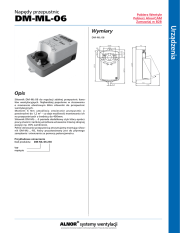 Napędy przepustnic Pobierz Wentyle Pobierz AlnorCAM Zamawiaj w B2B DM-ML-06 Urządzenia Wymiary DM-ML-06 0 30 90 0 90 60 30 60 Opis Siłownik DM-ML-06 do regulacji zdalnej przepustnic kanałów wentylacyjnych. Najbardziej popularne w stosowaniu o momencie obrotowym 6Nm siłowniki do przepustnic wentylacyjnych. Moment 6 Nm umożliwia otwieranie przepustnic o powierzchni do 1,2 m2 – co daje możliwość montowania ich na przepustnicach o średnicy do 400mm. Siłownik DM-ML-...-S posiada dodatkowy styk który oprócz pracy otwórz / zamknij umożliwia ustawienie trzeciej skrajnej pozycji np. 45% zamkniecie. Pełne sterowanie przepustnicą otrzymujemy montując siłownik DM-ML-...-RS, który przystosowany jest do płynnego zamykania i otwierania za pomocą potencjometru. Przykładowe oznaczenie Kod produktu: DM-ML-06-230 typ napięcie http://www.alnor.com.pl/produkty_pl/rekuperacja-–-centrale-wentylacyjne.html ALNOR® systemy wentylacji jest prawnie chronionym znakiem i technicznym patentem. Prawo do zmian zastrzeżone. Napędy przepustnic Pobierz Wentyle Pobierz AlnorCAM Zamawiaj w B2B DM-ML, DM-FL Urządzenia Wymiary DM-ML-06 0 90 30 90 0 60 30 60 DM-ML-08 Siłowniki z serii DM-ML oraz DM-FL przeznaczone są do napędzania przepustnic jednopłaszczyznowych okrągłych i wielopłaszczyznowych prostokątnych. 100 82 50 27 0 90 60 30 60 128 30 180 0 typ napięcie 90 Przykładowe oznaczenie Kod produktu: DM-FL-05- 230 20 35 4 Opis 68 DM-FL-05 http://www.alnor.com.pl/produkty_pl/rekuperacja-–-centrale-wentylacyjne.html ALNOR® systemy wentylacji jest prawnie chronionym znakiem i technicznym patentem. Prawo do zmian zastrzeżone. >95 Napędy przepustnic Pobierz Wentyle Pobierz AlnorCAM Zamawiaj w B2B Urządzenia DM-ML, DM-FL Dane techniczne Typ siłownika Zasilanie Zalecane średnice Ød / max powierzchnia m2 Moment obrotowy [Nm] Czas ruchu [s] Zakres ruchu [o] Zacisk uniwersalny [mm] DM-ML-06-24 AC/DC 24V 80 - 400 mm 1,2 m2 6 40 0 - 95 ø 6 - 16 □ 8 - 12 DM-ML-06-24-S AC/DC 24V 80 - 400 mm 1,2 m2 6 40 0 - 95 ø 6 - 16 □ 8 - 12 DM-ML-06-24-RS AC/DC 24V 80 - 400 mm 1,2 m2 6 40 0 - 95 ø 6 - 16 □ 8 - 12 DM-ML-06-230 AC 230V 80 - 400 mm 1,2 m2 6 40 0 - 95 ø 6 - 16 □ 8 - 12 DM-ML-06-230-S AC 230V 80 - 400 mm 1,2 m2 6 40 0 - 95 ø 6 - 16 □ 8 - 12 DM-ML-06-230-RS AC 230V 80 - 400 mm 1,2 m2 6 40 0 - 95 ø 6 - 16 □ 8 - 12 DM-ML-08-24 AC/DC 24V 200 - 630 mm 1.5 m2 8 30 0 - 95 ø 10 - 20 □ 10 - 16 DM-ML-08-230 AC 230V 200 - 630 mm 1.5 m2 8 30 0 - 95 ø 10 - 20 □ 10 - 16 DM-FL-05-24 AC/DC 24V 80 - 355 mm 1,0 m2 5 50 - 70 0 - 95 ø 10 - 16 □ 7 - 11 DM-FL-05-230 AC 230V 80 - 355 mm 1,0 m2 5 50 - 70 0 - 95 ø 10 - 16 □ 7 - 11 http://www.alnor.com.pl/produkty_pl/rekuperacja-–-centrale-wentylacyjne.html ALNOR® systemy wentylacji jest prawnie chronionym znakiem i technicznym patentem. Prawo do zmian zastrzeżone. Napędy przepustnic Pobierz Wentyle Pobierz AlnorCAM Zamawiaj w B2B Urządzenia DM-ML-06 Dane techniczne DM-ML-06-24 / DM-ML-06-24-S / DM-ML-06-230 / DM-ML-06-230-S 1 2 3 1 2 3 a 21 N L AC100...230V N b 22 23 24 25 26 L AC24V DC24V Zamknij/Otwórz Resistance load 3A, 230V Inductive load 1.5A, 230V The actuator in the Oo position 3-punktowe DM-ML-06-24-RS / DM-ML-06-230-RS 1 2 3 Y1 AC/DC24V 20% DC48V 10% 4 U 1 2 3 N L AC100...230V 0(2)...10V 0(4)...20mA 0(2)...10V 4 5 Y1 U 0(2)...10V 0(4)...20mA 0(2)...10V DM-ML-06-24 / DM-ML-06-24-S DM-ML-06-230 / DM-ML-06-230-S DM-ML-06-24-RS DM-ML-06-230-RS zasilanie AC 24 V 50/60 Hz AC 230 V 50/60 Hz moc pobierana 2,0 W 3,2 W dobór przewodu 4,4 VA 4,4 VA przekrój przewodu max. 2,0mm2 max. 2,0mm2 moment obrotowy 6 Nm 6 Nm kierunek obrotu wybierane przełącznikiem wybierane przełącznikiem kąt obrotu 0 - 90° (max. 95°) 0 - 90° (max. 95°) typ DC 24 V czas obrotu 40 s 40 s poziom dźwięku 45 dB (A) 45 dB (A) wskaźnik położenia mechaniczny mechaniczny stopień ochrony temperatura otoczenia IP 44 - 20 ... + 50°C IP 44 - 20 ... + 50°C dopuszczalna wilgotność 95% RH, bez kondensacji, EN 60730-1 95% RH, bez kondensacji, EN 60730-1 ochrona przez przeciążeniem automatyczna automatyczna S - dodatkowy styk pomocniczy dający sygnał np. o pełnym otwarciu przepustnicy http://www.alnor.com.pl/produkty_pl/rekuperacja-–-centrale-wentylacyjne.html RS - płynna regulacja otwarcia/zamknięcia sygnałem od 2 do 10V ALNOR® systemy wentylacji jest prawnie chronionym znakiem i technicznym patentem. Prawo do zmian zastrzeżone.