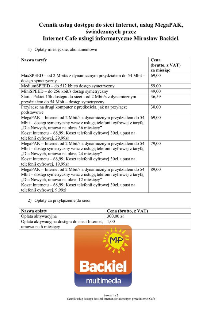 Cennik usług dostępu do sieci Internet, usług MegaPAK, świadczonych przez Internet Cafe usługi informatyczne Mirosław Backiel. 1) Opłaty miesięczne, abonamentowe Nazwa taryfy MaxSPEED – od 2 Mbit/s z dynamicznym przydziałem do 54 Mbit – dostęp symetryczny MediumSPEED – do 512 kbit/s dostęp symetryczny MiniSPEED – do 256 kbit/s dostęp symetryczny Start - Pakiet 15h dostępu do sieci - od 2 Mbit/s z dynamicznym przydziałem do 54 Mbit – dostęp symetryczny Przyłącze na drugi komputer z prędkością, jak na przyłącze podstawowe MegaPAK – Internet od 2 Mbit/s z dynamicznym przydziałem do 54 Mbit – dostęp symetryczny wraz z usługą telefonii cyfrowej z taryfą „Dla Nowych, umowa na okres 36 miesięcy” Koszt Internetu – 68,99; Koszt telefonii cyfrowej 30zł, upust na telefonii cyfrowej, 29,99zł MegaPAK – Internet od 2 Mbit/s z dynamicznym przydziałem do 54 Mbit – dostęp symetryczny wraz z usługą telefonii cyfrowej z taryfą „Dla Nowych, umowa na okres 24 miesięcy” Koszt Internetu – 68,99; Koszt telefonii cyfrowej 30zł, upust na telefonii cyfrowej, 19,99zł MegaPAK – Internet od 2 Mbit/s z dynamicznym przydziałem do 54 Mbit – dostęp symetryczny wraz z usługą telefonii cyfrowej z taryfą „Dla Nowych, umowa na okres 12 miesięcy” Koszt Internetu – 68,99; Koszt telefonii cyfrowej 30zł, upust na telefonii cyfrowej, 9,99zł Cena (brutto, z VAT) za miesiąc 69,00 59,00 49,00 36,59 30,00 69,00 79,00 89,00 2) Opłaty za przyłączenie do sieci Nazwa opłaty Cena (brutto, z VAT) Opłata aktywacyjna 300,00 zł Opłata aktywacyjna dostępu do sieci Internet, 1,00 umowa na 6 miesięcy Strona 1 z 2 Cennik usług dostępu do sieci Internet, świadczonych przez Internet Cafe 3) Inne opłaty Nazwa usługi Bezpodstawne wezwanie serwisu Naprawa instalacji uszkodzonej z winy abonenta Pierwsza konfiguracja systemu klienta do pracy w sieci Druga i następne konfiguracje systemu klienta do pracy w sieci Ilustrowany przewodnik konfiguracji komputera klienta do pracy w sieci Inne, nigdzie nie wymienione Zmiana taryfy z wyŜszej na niŜszą w czasie trwania umowy terminowej Zmiana taryfy z wyŜszej na niŜszą Zamian taryfy z niŜszej na wyŜszą Zawieszenie dostępu do sieci. Zawieszenie korzystania z usługi MegaPAK Cena (brutto, z VAT) 35zł za rozpoczętą godzinę pracy serwisu Ustalane indywidualnie Bezpłatna 35zł za rozpoczętą godzinę pracy serwisu Bezpłatny Ustalane indywidualnie 150,00 20,00 bezpłatnie 50% średniej kwoty opłat za ostatnie 6 miesięcy Płatne 99% opłaty abonamentowej Backiel Multimedia XXX lecia „obok biedronki” 68-100 śagań www.backiel.com.pl 068 410 2006 068 377 2006 [email protected] Strona 2 z 2 Cennik usług dostępu do sieci Internet, świadczonych przez Internet Cafe