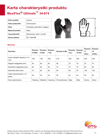 Karta charakterystki produktu MaxiFlex® Ultimate™ 34-874 Kolor powłoki Czarna Kolor podszewki Ciemnoszara Wzór Powlekany spód dłoni, ściągacz Materiał powłoki Nitryl Typ podszewki Bezszwowa, nylon i Lycra® Numer patentu EP 1 608 808 Wymiary Rozmiar Rozmiar Rozmiar 5 (XXS) 6 (XS) 7 (S) 185 195 205 Długość nadgarstka (mm) 55 60 Szerokość nadgarstka (mm) 65 Szerokość dłoni (mm) Rozmiary Łączna długość rękawicy (+/-5 mm) Ciężar rękawicy/para (+/-5 gram) Kolor wykończenia Rozmiar 8 (M) Rozmiar Rozmiar Rozmiar Rozmiar 11 12 (XXL) (XXXL) 225 230 240 70 70 70 75 70 75 75 80 80 82 84 94 97 100 105 34 40 42 44 46 50 Żółty Czarny Green 9 (L) 10 (XL) 215 220 65 65 65 65 75 80 28 30 Fioletowy Niebieski Czerwony Pomarańczowy Biały Niniejszy dokument stanowi własność ATG®, a zawarte w nim informacje stanowią zastrzeżone informacje ATG® Lanka (Pvt) Ltd. Spur Road 7, Phase 2 - IPZ, Katunayake - Sri Lanka - T +94-11-48389000 - F +94-11-2253887 - E [email protected] 1/4 Karta charakterystki produktu MaxiFlex® Ultimate™ 34-874 Wyniki testów EN Test Jednostka notyfikowana EN 420: 2003 + A1: 2009 EN 388: 2003 Wynik/zaliczenie Tak SATRA 4131 EN 374-3: 2003 - EN 374-2: 2003 - EN 407: 2004 - EN 511: 2006 - EN 1149: 2006 nd. EN 10819 nd. 1935/2004/WE (kontakt z żywnością w EU) Pomyślny FDA sekcja 177.2600 (kontakt z żywnością w USA) SATRA Pomyślny EN 14362-2: 2003 Pomyślny Jeżeli rękawica ze względu na swoją konstrukcję nie spełnia wymagań normy EN 420 w zakresie wymiarów dłoni, wówczas taka rękawica jest klasyfikowana jako rękawica „do zastosowań specjalnych”. Typowe parametry użytkowe EN 420 Sprawność manipulacyjna Stopień 5 EN 420 pH 5.95 EN 388 A. Odporność na ścieranie > 8000 Cycles EN 388 B. Odporność na przecięcia > 1.2 index EN 388 C. Odporność na przedarcie > 50 Niutonów EN 388 D. Odporność na przebicie > 20 Niutonów EN 14362-2 barwniki azowe Nie wykryto obecności amin (<30'mg/kg) Niniejszy dokument stanowi własność ATG®, a zawarte w nim informacje stanowią zastrzeżone informacje ATG® Lanka (Pvt) Ltd. Spur Road 7, Phase 2 - IPZ, Katunayake - Sri Lanka - T +94-11-48389000 - F +94-11-2253887 - E [email protected] 2/4 Karta charakterystki produktu MaxiFlex® Ultimate™ 34-874 HandCare® Skin Health Alliance Dermatologially Accredited Tak REACH compliant Tak OekoTex® 100 Certyfikacja Preparat Sanitized Tak Właściwości szczególne Bez silikonu Tak Food contact Tak (FDA, EC 1935/2004) Opakowanie Liczba par w torebce foliowej 12 Liczba kartonów 144 Wymiary kartonu (mm) 500 X 295 x 270 Niniejszy dokument stanowi własność ATG®, a zawarte w nim informacje stanowią zastrzeżone informacje ATG® Lanka (Pvt) Ltd. Spur Road 7, Phase 2 - IPZ, Katunayake - Sri Lanka - T +94-11-48389000 - F +94-11-2253887 - E [email protected] 3/4 Karta charakterystki produktu MaxiFlex® Ultimate™ 34-874 Waga Size 5 Size 6 Size 7 Size 8 Size 9 Size 10 Size 11 Size 12 (XXS) (XS) (S) (M) (L) (XL) (XXL) (XXXL) Masa brutto (kg) 5.1 5.4 6 6.8 7.1 7.4 7.7 8.2 Masa kartonu (kg) 1 1 1 1 1 1 1 1 Masa netto (kg) 4.1 4.4 5 5.8 6.1 6.4 6.7 7.2 Rozmiary Data publikacji: 08.12.2014 Niniejszy dokument stanowi własność ATG®, a zawarte w nim informacje stanowią zastrzeżone informacje ATG® Lanka (Pvt) Ltd. Spur Road 7, Phase 2 - IPZ, Katunayake - Sri Lanka - T +94-11-48389000 - F +94-11-2253887 - E [email protected] 4/4