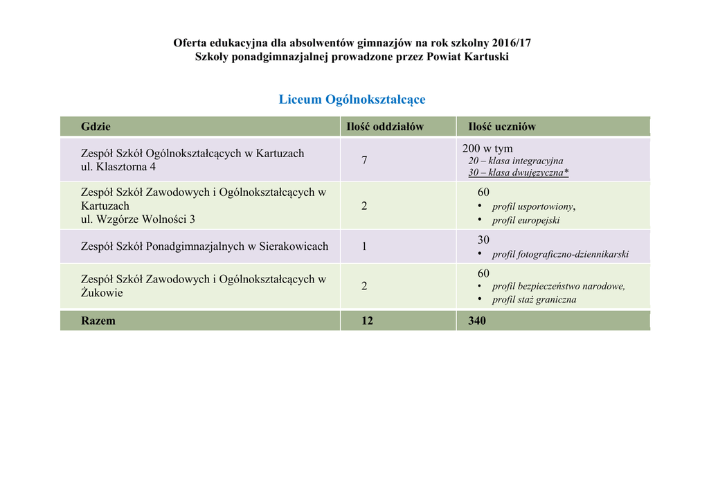 Oferta edukacyjna dla absolwentów gimnazjów na rok szkolny 2016/17 Szkoły ponadgimnazjalnej prowadzone przez Powiat Kartuski Liceum Ogólnokształcące Gdzie Zespół Szkół Ogólnokształcących w Kartuzach ul. Klasztorna 4 Ilość oddziałów Ilość uczniów 200 w tym 7 20 – klasa integracyjna 30 – klasa dwujęzyczna* Zespół Szkół Zawodowych i Ogólnokształcących w Kartuzach ul. Wzgórze Wolności 3 2 60 • profil usportowiony, • profil europejski Zespół Szkół Ponadgimnazjalnych w Sierakowicach 1 30 • profil fotograficzno-dziennikarski Zespół Szkół Zawodowych i Ogólnokształcących w Żukowie 2 • Razem 12 340 60 • profil bezpieczeństwo narodowe, profil staż graniczna Oferta edukacyjna dla absolwentów gimnazjów na rok szkolny 2016/17 Szkoły ponadgimnazjalnej prowadzone przez Powiat Kartuski Zasadnicza Szkoła Zawodowa Gdzie Zawód Ilość oddziałów Ilość uczniów Zespół Szkół Technicznych w Kartuzach ul. Mściwoja II 24 elektryk fryzjer mechanik pojazdów sam. ślusarz stolarz wielozawodowa 1 1 1 1 0,5 1,5 30 30 30 30 15 45 Zespół Szkół Zawodowych i Ogólnokształcących w Kartuzach, ul. Wzgórze Wolności 3 sprzedawca wielozawodowa 1 1 30 30 Zespół Szkół Ponadgimnazjalnych w Przodkowie wielozawodowa 1 30 Zespół Szkół Ponadgimnazjalnych w Somoninie kucharz wielozawodowa 0,5 1,5 15 45 Zespół Szkół Zawodowych i Ogólnokształcących w Żukowie kierowca mechanik* wielozawodowa 0,5 2,5 15 75 Specjalny Ośrodek Szkolno-Wychowawczy w Kartuzach wielozawodowa 1 16 Razem 15 436 Oferta edukacyjna dla absolwentów gimnazjów na rok szkolny 2016/17 Szkoły ponadgimnazjalnej prowadzone przez Powiat Kartuski Technikum Ilość oddziałów Ilość uczniów Technik budownictwa Technik elektryk Technik mechanik Technik mechatronik Technik urządzeń i systemów energii odnawialnej 1 0,5 0,5 0,5 30 15 15 15 0,5 15 Zespół Szkół Zawodowych i Ogólnokształcących w Kartuzach, ul. Wzgórze Wolności 3 Technik ekonomista Technik handlowiec Technik informatyk Technik organizacji reklamy 1 1 1 1 30 30 30 30 0,5 15 Zespół Szkół Ponadgimnazjalnych w Przodkowie Technik cyfrowych procesów graficznych Technik informatyk Technik rolnik Technik żywienia i usług gastronom. 1,5 45 0,5 15 0,5 15 Zawód Gdzie Zespół Szkół Technicznych w Kartuzach ul. Mściwoja II 24 Zespół Szkół Ponadgimnazjalnych w Somoninie Technik hotelarstwa Technik kelner* Technik obsługi turystycznej* Technik żywienia i usług gastronom. 0,5 0,5 0,5 15 15 15 0,5 15 Zespół Szkół Ponadgimnazjalnych w Sierakowicach Technik ekonomista Technik technologii żywności* Technik żywienia i usług gastronom. 1 0,5 30 0,5 0,5 15 0,5 15 Zespół Szkół Zawodowych i Ogólnokształcących w Żukowie Technik ekonomista Technik eksploatacji portów i terminali Technik logistyk Technik organizacji reklamy Technik transportu kolejowego* 0,5 15 0,5 0,5 1 15 15 30 Razem 17 510 * nowy zawód/profil