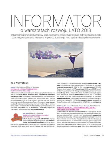 INFORMATOR o warsztatach rozwoju lato 2013 W babskim gronie poznać Nowy Jork, spędzić taneczny tydzień nad Bałtykiem albo dzięki coachingowi zamienić marzenia w podróż. Lato tego roku będzie niezwykle rozwojowe DLA WSZYSTKICH cały rok, Pałac Zdunowo, 50 km od Warszawy Rozwijanie intuicji, pielęgnowanie wartościowych związków 2-dniowe warsztaty z medytacjami obejmują wykłady i ćwiczenia praktyczne: naukę relaksu, wyciszanie myśli, koncentrację, wchodzenia w stan alfa i theta. Pracujemy z podświadomością nad uwalnianiem złych wspomnień poprzez przebaczenie innym i sobie. Kurs zmienia perspektywę patrzenia na świat, czasami przynosi poprawę zdrowia i poczucie spokoju. Zapraszamy do Pałacu Zdunowo: w klimatycznych wnętrzach odpoczywamy, ładujemy akumulatory. Serwujemy pyszne, lekkie posiłki i świeże soki. Nasi kucharze zdobyli tytuł najlepszej kuchni pałacowej 2012. CENA: 860 zł. INFORMACJE i ZGŁOSZENIA: Agnieszka Zakrzewska, tel. 694 484 583, www.palaczdunowo.pl maj – lipiec, Goleszów k. Ustronia Warsztaty jogi, tańca i festiwale w Etno Chacie Topolej 6–15.09. Festiwal muzyki i tańca ETNOPOLE II. Impreza w ramach Redyku Karpackiego 2013, www.redykkarpacki.pl, www.transhumance.com. Maj. 25–26.05. Muzy- ka etniczna – Renata Wrzeszcz. 29.05. Warsztaty cygańskie – Teresa Mirga i Kałe Bała. 31.05., godz. 20.00, koncert T. Mirga i Kałe Bała. 30.05.–2.06. Więcej ogłoszeń w serwisie www.informator.zwierciadlo.pl Joga – Flamenco – R. Grzeszykowski i M. Navarrete, www.la-la-la.pl. Czerwiec. 8.06. Skuteczne triki w aranżacji wnętrz Etno Design – K. Krochmal, www.galeriaprojektu.pl. 8–9.06. Tai Chi – www.taichiyang.pl. 13–14.06. Rozpocznij odchudzanie od EFT, www.eftera.pl. 26.06., godz. 20.00, koncert Ondrej Smeykal, instrumenty aborygeńskie. 28–29.06. „Gotowi na miłość”, www.eftera.pl. 29.06. – Koncert Afro Megic Drum Show z Senegalu. Lipiec. 1–7.07. MultiKulti, M. Navarrete, www.la-la-la.pl. 13–20.07. Joga – A. Nowakowska, M. Puls. 31.07.–3.08. Skuteczne triki w aranżacji wnętrz – K. Krochmal, www.galeriaprojektu.pl, trening rozwojowy, elementy treningu funkcjonalnego żołnierzy marines-TRX – M. Fijas-Bąk, www.pfs-krakow.pl. MIEJSCE: Etno Chata Topolej, e-mail: [email protected], tel. 607 272 831, www.TOPOLEJ.pl 26–27 maja, 8–9 czerwca, Warszawa, 27 lipca – 3 sierpnia, Nowe Kawkowo WARSZTAT WOKALNY „LABORATORIUM GŁOSU – ODKRYJ SWÓJ GŁOS” Z OLGĄ SZWAJGIER Unikalny warsztat wokalny z jedną z największych sopranistek świata, który inspiruje do poszukiwania swoich ukrytych możliwości głosowych, pomaga odbudować wiarę w siebie i uczy samoakceptacji. Olga zachęca do korzystania z potęgi intuicji, wyobraźni i wizualizacji. Bazuje na harmonii ciała, umysłu i ducha. Uczy, jak uleczyć swój głos i duszę. Z jej doświadczenia wynika, że nie ma osób bez słuchu, głosu czy poczucia rytmu, jest tylko nieumiejętność posługiwania się tymi środkami ekspresji. Uczy, jak śpiewać całym ciałem, wierząc, że to, co jest dostępne dla niej, dostępne jest też innym. CENA: 350 zł (2 dni, Warszawa), 790 zł 2013 czer wiec sens › 113 praktycznie informator lato ogłoszenia płatne Nowa zdrowa rekreacja dla rodzin FAMILY SUMMER TIME (8 dni, Nowe Kawkowo). PROWADZĄCA: Olga Szwajgier – światowej sławy sopranistka, ćwiczeniami własnego pomysłu poszerzyła skalę głosu z 3 do 6 oktaw. Śpiewa na granicy słyszalności. INFORMACJE I ZGŁOSZENIA: Stowarzyszenie „U Źródła” oraz Ośrodek „Tu i Teraz” w Nowym Kawkowie, www.tuiteraz.eu, www.u-zrodla.pl, e-mail: [email protected], Maja Wołosiewicz, tel. 606 994 366. czerwiec – sierpień, S TA LT Wisła, Murzasichle, Mazury TR U LI CEN NGU GE M COUNS EL WAKACYJNE OBOZY Z PSYCHOEDUKACJĄ DLA DZIECI I MŁODZIEŻY Autorski program twórczego wypoczynku oraz rozwoju umiejętności osobistych i społecznych. Kadra – ludzie z pasją i przygotowaniem tre- nerskim. PRZYGOTOWANIE I PROWADZENIE: Mariola Pochwat i Jacek Panster z zespołem, pod superwizją Olgi i Adama Hallerów. Terminy: Mini-obóz dla dzieci (7–12 lat), Wisła, Pod Baranią, 30.06.–9.07. Mini-obóz dla dzieci (7–12 lat), Murzasichle, Stary Bór, 14–23.07. Obóz dla młodzieży (12–18 lat), Camp Rodowo, Mazury, 10–24.08. Zapraszamy. INFORMACJE I ZGŁOSZENIA: Centrum Counsellingu Gestalt, tel. 12 433 78 20, 668 733 931, www.gestalt.haller.krakow.pl, www.obozy.haller.krakow.pl czerwiec, Nowe Kawkowo k. Olsztyna FESTIWALE W OŚRODKU „TU I TERAZ” w NOWYM KAWKOWIE W czerwcu zapraszamy na dwa wspaniałe festiwale: I FESTIWAL TANTRY I SEKSUALNOŚCI W POLSCE „SEKS, MIŁOŚĆ, DUCHOWOŚC” (6–16.06.) Najbardziej ekscytujący festiwal roku, 10 dni w atmosferze radości, przyjaźni, zmysłowości, przyjemności, miłości i zabawy! Zajęcia poprowadzi 18 najlepszych nauczycieli ze świata i z Polski (m.in.: Sarita, J. Hawken, A. Barnes, B. Lyon, Shakara, R. i V. Hewett, D. i Z. Rzepeccy). Ponad 70 wydarzeń – warsztatów (2 dn. i 4 godz.), wykładów, ceremonii, rytuałów, koncertów i imprez tanecznych. Tantra obejmuje pracę z ciałem, seksualnością, umysłem i emocjami, ale także rozwój duchowy. Jest szczególnie ważna dla ludzi, którzy pragną wzbogacić swoje życie seksualne i oczekują głębokiej relacji z partnerem. Zapraszamy singli, pary i przyjaciół. V FESTIWAL INTEGRACJI CIAŁA, DUSZY I UMYSŁU „MIŁOŚĆ, BLISKOŚĆ, ZWIĄZKI” (23–30.06.) 8 dni wspaniałych warsztatów z 25 najlepszymi prowadzącymi z całej Polski (m.in.: W. Eichelberger, E. Cyzman, K. Korytowska, D. i Z. Rzepeccy, N. Kulesza, B. Markowska, J. Poteralski, M. Przygońska, K. Aquabal, M. Szokalska). Ponad 70 warsztatów i wykładów! Dowiemy się, jak znaleźć tę Wymarzoną Osobę i co zrobić, aby związek był trwały i udany. Będzie też dużo dobrej zabawy, ceremonii, koncertów, radosnego wypoczynku, chodzenia po ogniu, tańca, przytulania