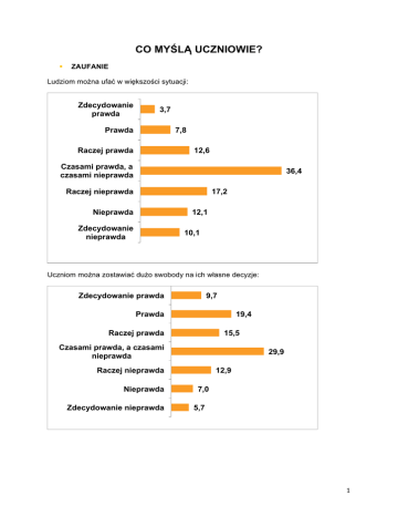 CO MYŚLĄ UCZNIOWIE? § ZAUFANIE Ludziom można ufać w większości sytuacji: Zdecydowanie prawda 3,7 Prawda 7,8 Raczej prawda 12,6 Czasami prawda, a czasami nieprawda 36,4 Raczej nieprawda 17,2 Nieprawda 12,1 Zdecydowanie nieprawda 10,1 Uczniom można zostawiać dużo swobody na ich własne decyzje: Zdecydowanie prawda 9,7 Prawda 19,4 Raczej prawda 15,5 Czasami prawda, a czasami nieprawda 29,9 12,9 Raczej nieprawda Nieprawda Zdecydowanie nieprawda 7,0 5,7 1 Prawdziwe partnerstwo między nauczycielami a uczniami nie jest możliwe. Zdecydowanie prawda 10,2 Prawda 9,9 Raczej prawda 12,1 Czasami prawda, a czasami nieprawda 25,6 Raczej nieprawda 15,7 Nieprawda 15,0 Zdecydowanie nieprawda § 11,4 DOBRO WSPÓLNE Szkoła może być autentyczną wspólnotą nauczycieli i uczniów: Zdecydowanie prawda 12,1 Prawda 21,0 Raczej prawda 22,7 Czasami prawda, a czasami nieprawda Raczej nieprawda 19,6 9,7 Nieprawda 7,5 Zdecydowanie nieprawda 7,5 2 Dla większości ludzi ważniejsze są ich własne korzyści niż dobro wspólne: Zdecydowanie prawda 18,8 Prawda 26,1 Raczej prawda 18,8 Czasami prawda, a czasami nieprawda 21,4 Raczej nieprawda Nieprawda Zdecydowanie nieprawda § 7,6 4,4 2,9 SPRAWIEDLIWOŚĆ W pracy nauczyciela nie daje się do końca być sprawiedliwym: Zdecydowanie prawda 15,2 Prawda 19,8 Raczej prawda 15,6 Czasami prawda, a czasami nieprawda Raczej nieprawda Nieprawda Zdecydowanie nieprawda 20,3 8,5 11,5 9,1 3 Uczniowie często są niesprawiedliwi w ocenie nauczycieli: 9,7 Zdecydowanie prawda 16,3 Prawda 18,3 Raczej prawda Czasami prawda, a czasami nieprawda § 32,9 Raczej nieprawda 7,5 Nieprawda 7,8 Zdecydowanie nieprawda 7,6 UMOWY I PRAWDA Polacy mają trudności z bezinteresowną współpracą. Zdecydowanie prawda 12,9 Prawda 23,4 Raczej prawda 18,2 Czasami prawda, a czasami nieprawda Raczej nieprawda 27,1 6,4 Nieprawda Zdecydowanie nieprawda 7,4 4,7 4 Małe kłamstewka nikomu specjalnie nie szkodzą. Wszyscy 7,9 Prawie wszyscy 13,9 12,8 Około 3/4 klasy Około 1/2 klasy 18,1 Około 1/4 klasy 20,5 Prawie nikt 17,6 Nikt § 9,2 ORIENTACJA NA INNYCH Należy zawsze upewniać się, że nasze postępowanie nie przynosi żadnej szkody innym. 24,5 Zdecydowanie prawda 32,9 Prawda 13,9 Raczej prawda Czasami prawda, a czasami nieprawda Raczej nieprawda 4,7 Nieprawda 4,4 Zdecydowanie nieprawda 16,4 3,2 5 Jakiekolwiek narażanie innych nie powinno być nigdy akceptowane. 20,5 Zdecydowanie prawda Prawda 23,9 17,6 Raczej prawda Czasami prawda, a czasami nieprawda Raczej nieprawda 21,2 6,3 Nieprawda Zdecydowanie nieprawda 6,9 3,7 Nie da się tak działać w świecie, żeby w ogóle nie krzywdzić innych. Zdecydowanie prawda 16,1 Prawda 21,9 Raczej prawda 20,8 Czasami prawda, a czasami nieprawda 19,8 Raczej nieprawda 9,3 Nieprawda Zdecydowanie nieprawda 7,3 4,7 6 Współczuję ludziom z krajów, w których toczy się wojna. 54,0 Zdecydowanie prawda 29,9 Prawda Trudno powiedzie Nieprawda Zdecydowanie nieprawda 7,0 3,7 5,4 Staram się nikogo nie skrzywdzić. Zdecydowanie prawda 28,3 Prawda 37,7 Trudno powiedzie 21,7 Nieprawda Zdecydowanie nieprawda 7,9 4,4 7 § ORIENTACJA NA ZASADY Ludzie bez kontroli nie postępowaliby uczciwie. Zdecydowanie prawda 11,3 Prawda 14,5 Raczej prawda 17,0 Czasami prawda, a czasami nieprawda 28,0 Raczej nieprawda 14,3 Nieprawda Zdecydowanie nieprawda 9,4 5,4 Jeśli ludziom daje się zbyt dużo swobody, przestają postępować moralnie. Zdecydowanie prawda 13,6 Prawda 19,0 Raczej prawda 17,8 Czasami prawda, a czasami nieprawda 27,5 12,1 Raczej nieprawda Nieprawda 5,1 Zdecydowanie nieprawda 4,9 Źródło: Instytut Badań Edukacyjnych, 2015. 8